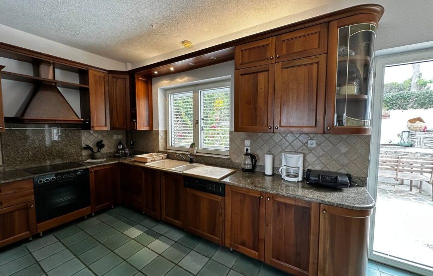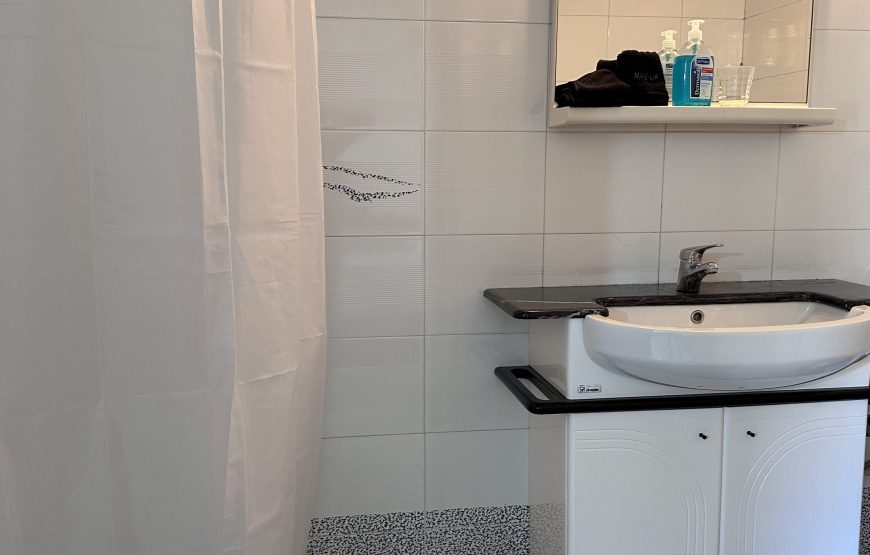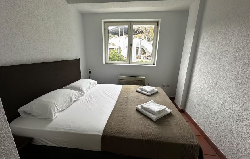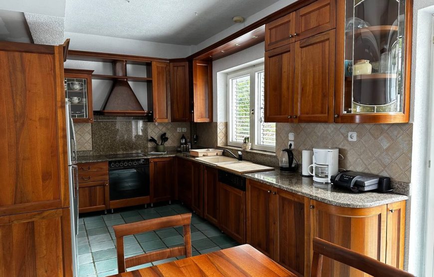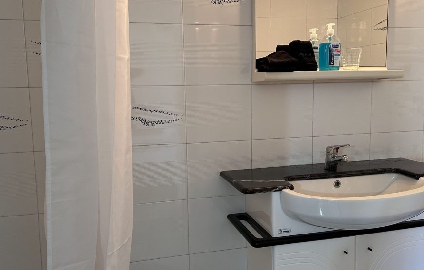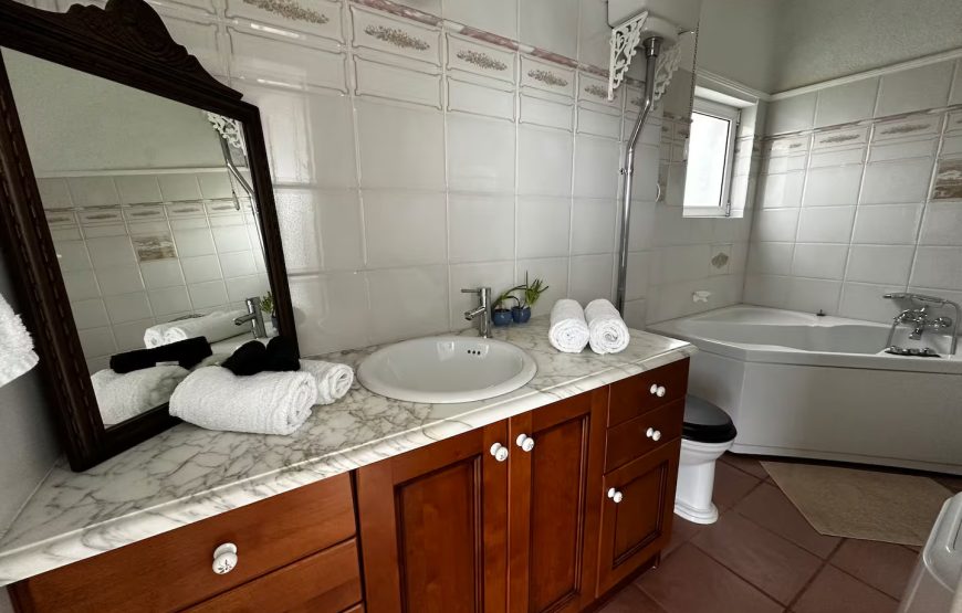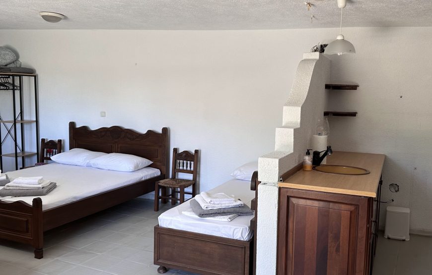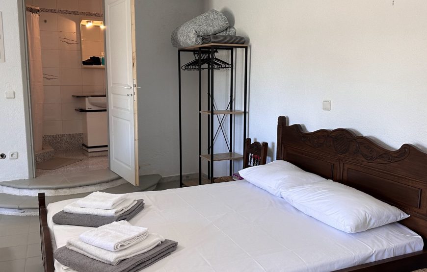 In the independent guest house, there is a double bed and a single bed. There is also a kitchen and a bathroom.