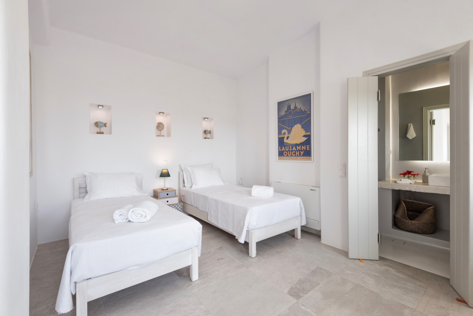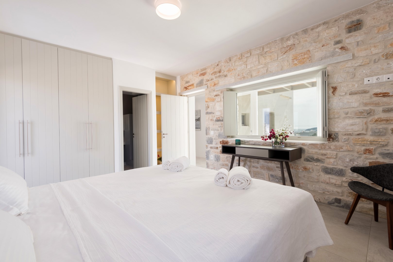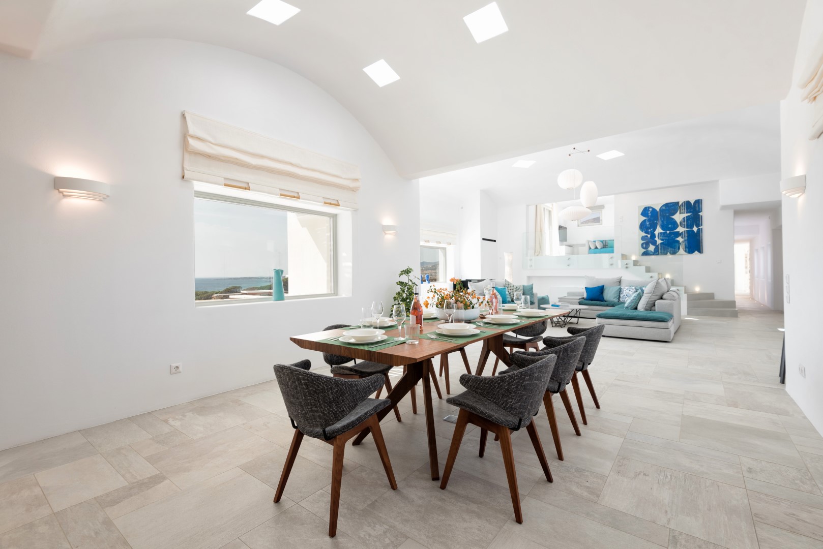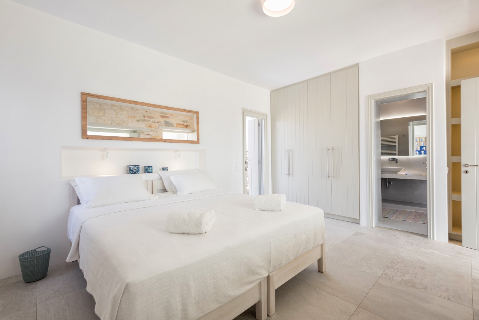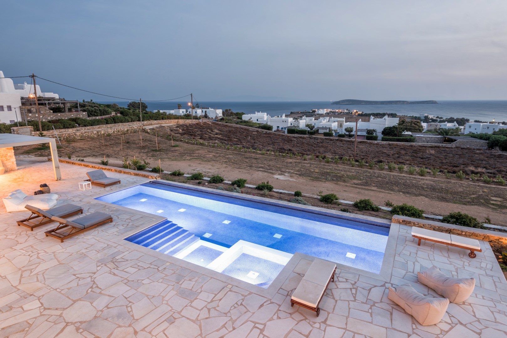 The villa comfortably accommodates 8 guests in four luxurious bedrooms, with an additional mezzanine space that can sleep 2 more visitors. Its spectacular infinity-edge swimming pool seemingly merges with the azure waters beyond, while multiple sun-drenched terraces provide perfect spaces for relaxation or entertaining. The high-domed ceilings with skylights bathe the interior in natural light, highlighting the elegant living spaces, beautiful dining area, and fully-equipped modern kitchen with island. Each bedroom features en-suite facilities, with three on the ground floor and a cheerful twin room on the lower level, all offering magnificent sea views and access to outdoor spaces. Complete with BBQ facilities, covered parking, and all modern conveniences, Villa Allegra represents the pinnacle of Cycladic island living just a short drive from picturesque villages and additional beaches.