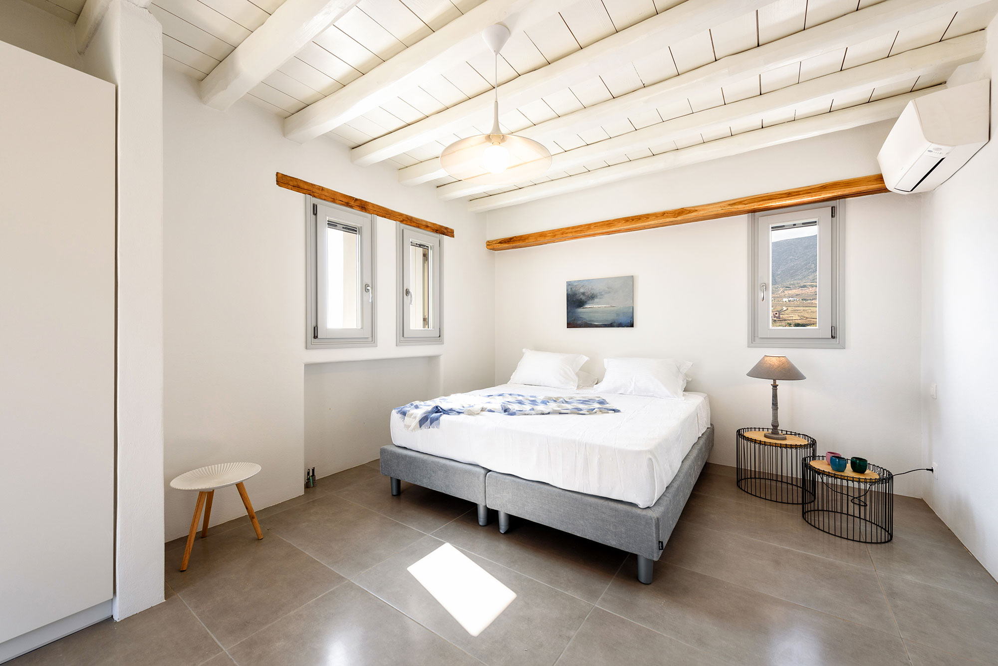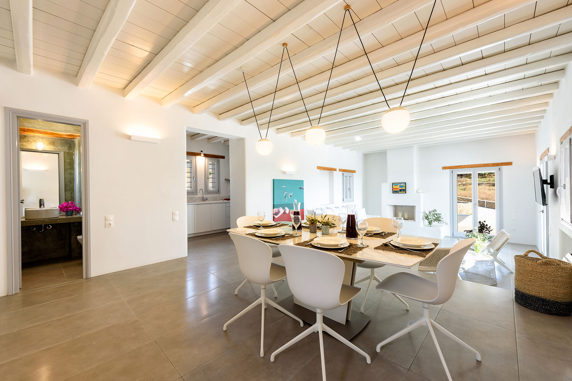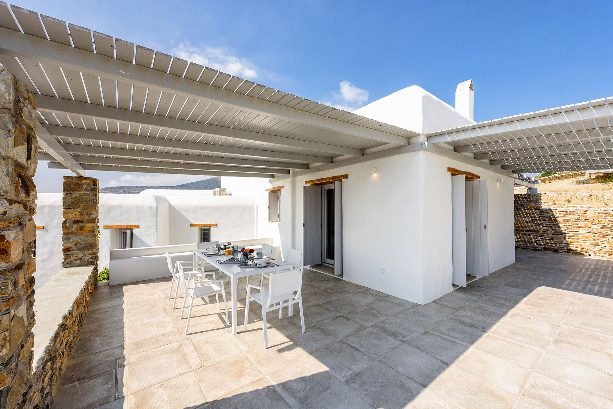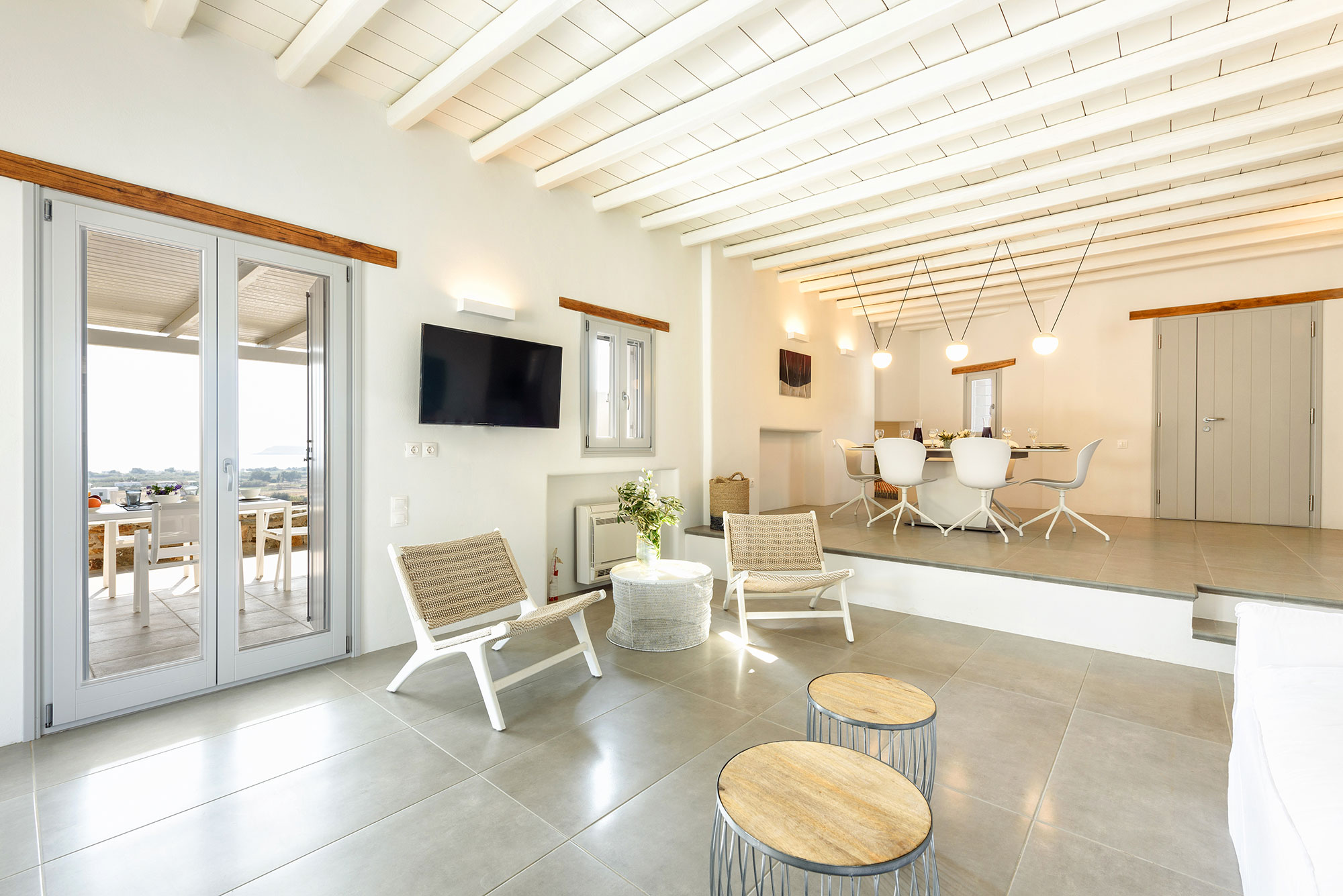The outdoor space is thoughtfully designed with various shaded corners creating a serene landscape around the swimming pool. Complete with all modern amenities including Wi-Fi, espresso and filter coffee machines, dishwasher, BBQ area, and private parking, Villa Anemos provides everything needed for a memorable island getaway.