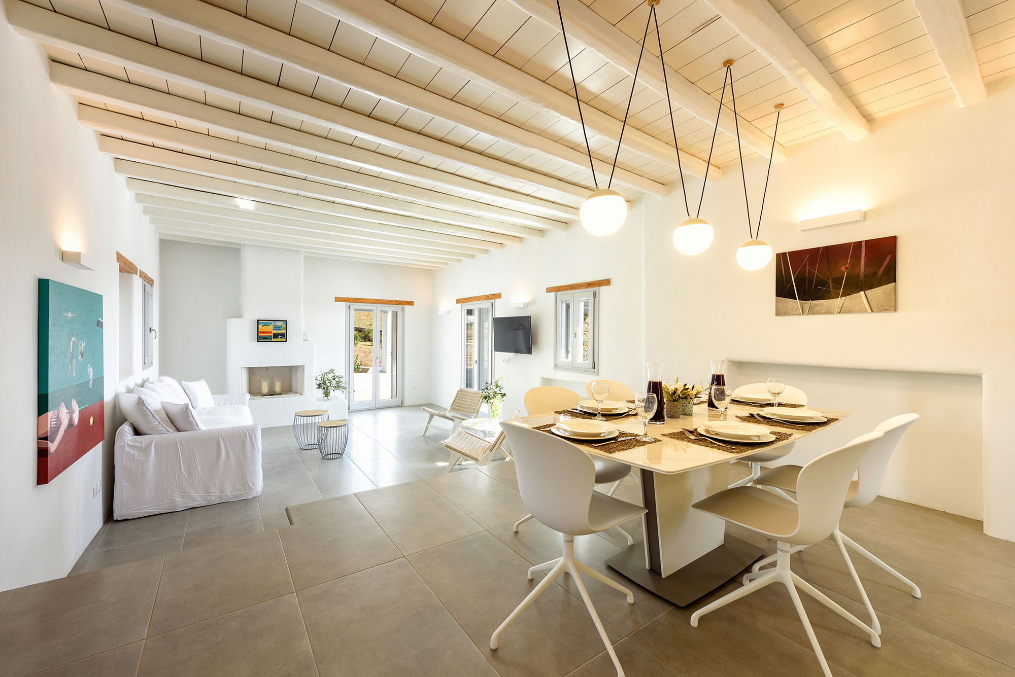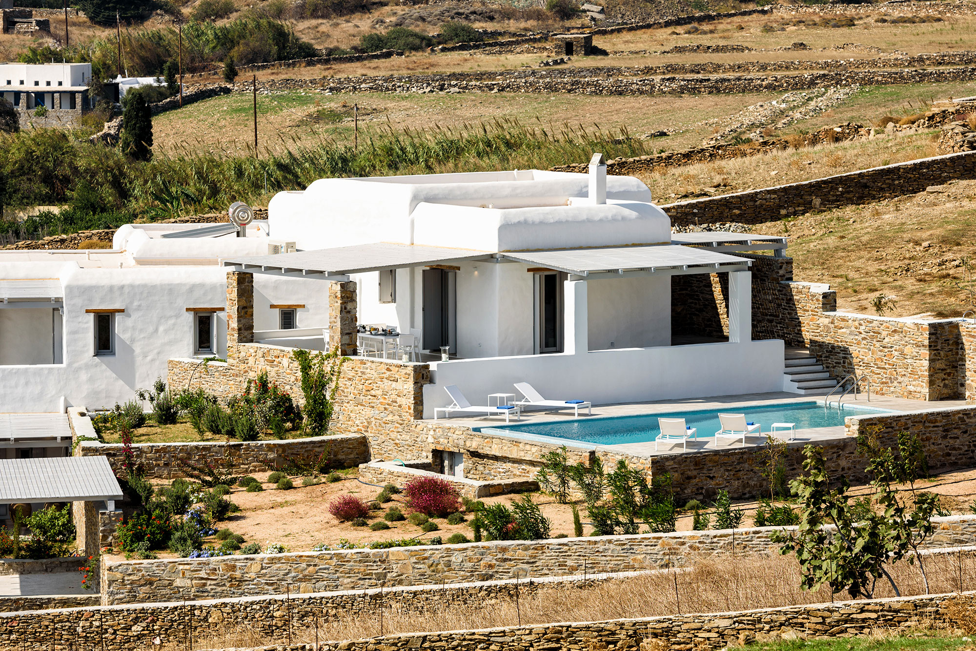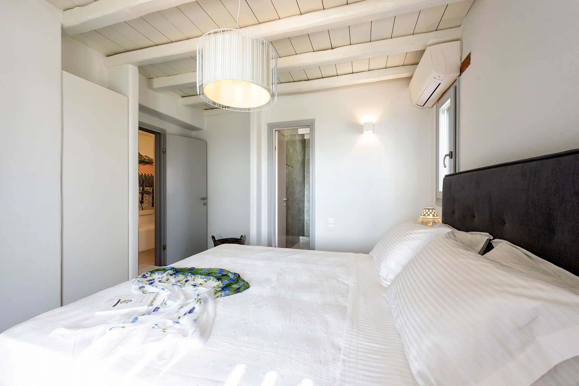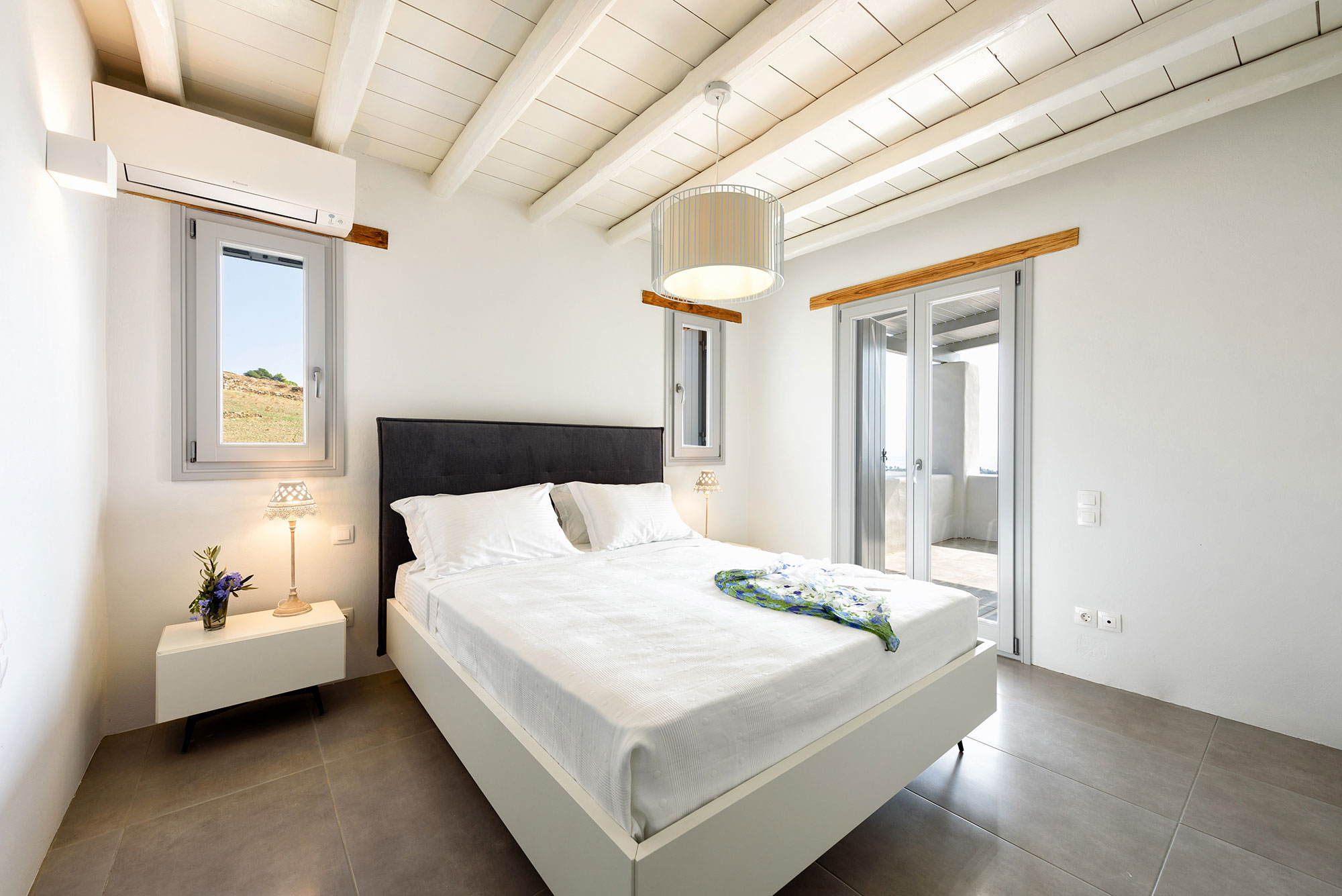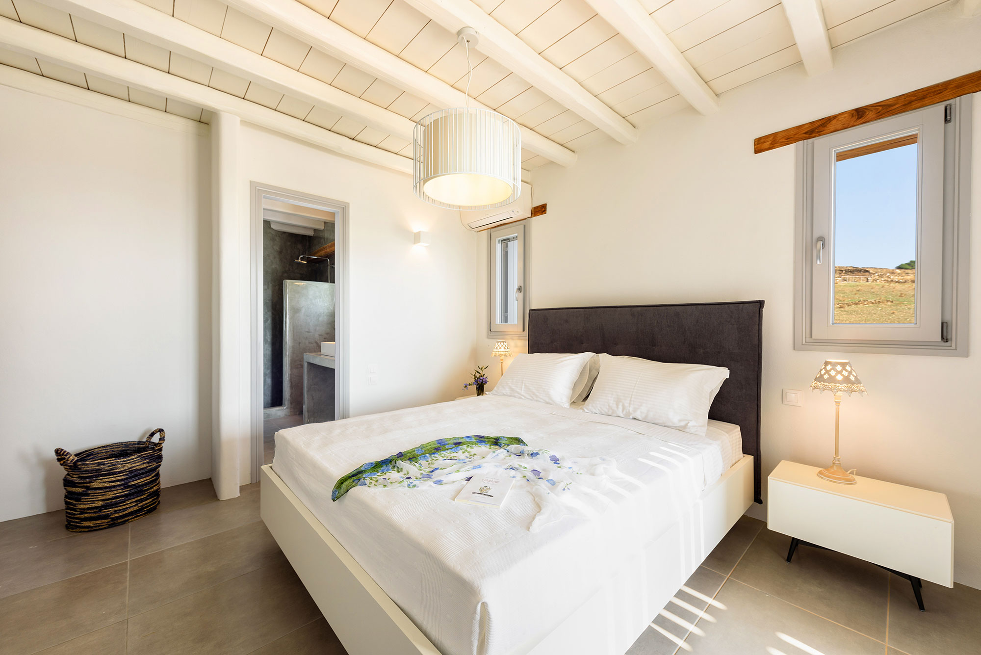 The outdoor space is thoughtfully designed with various shaded corners creating a serene landscape around the swimming pool. Complete with all modern amenities including Wi-Fi, espresso and filter coffee machines, dishwasher, BBQ area, and private parking, Villa Anemos provides everything needed for a memorable island getaway.