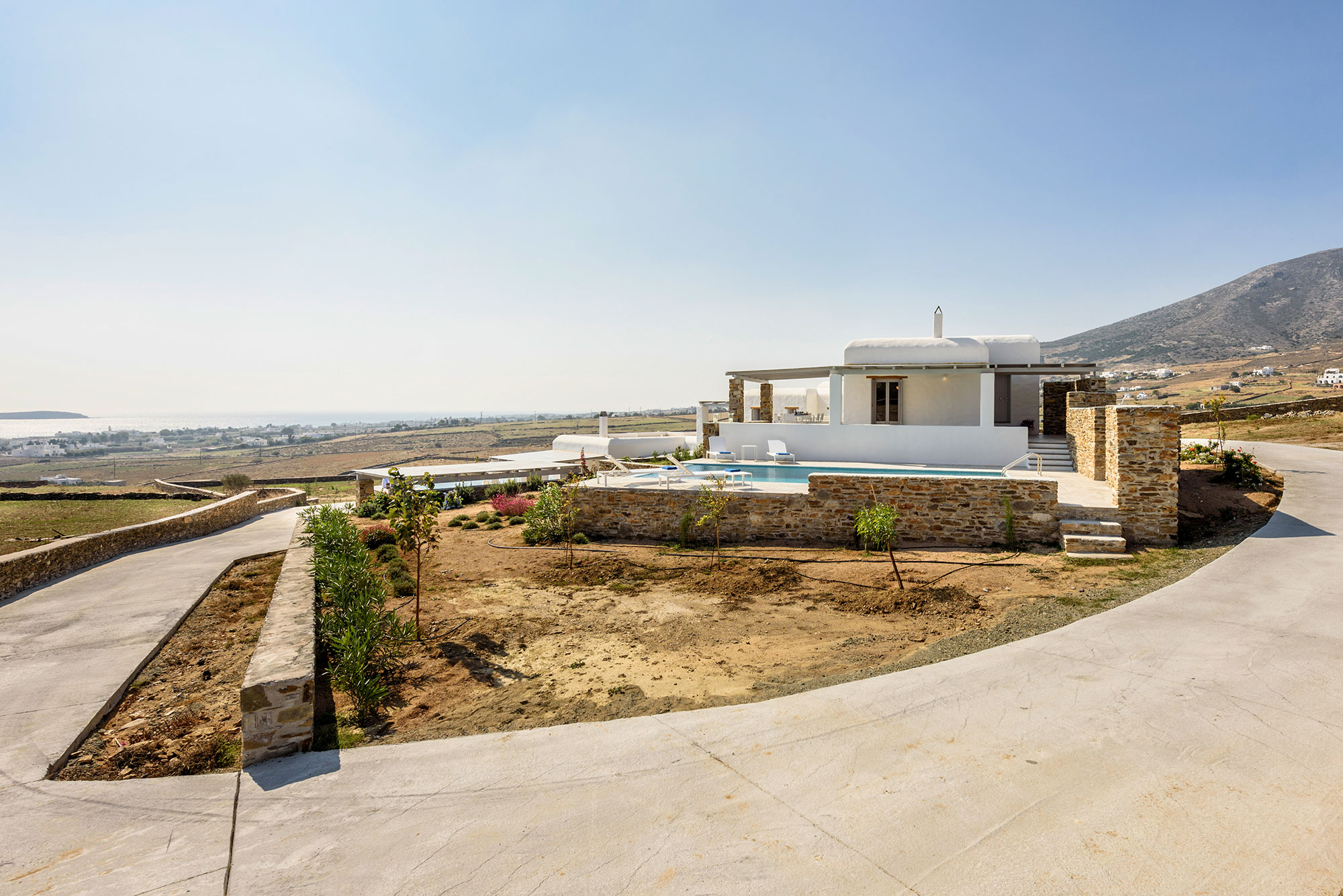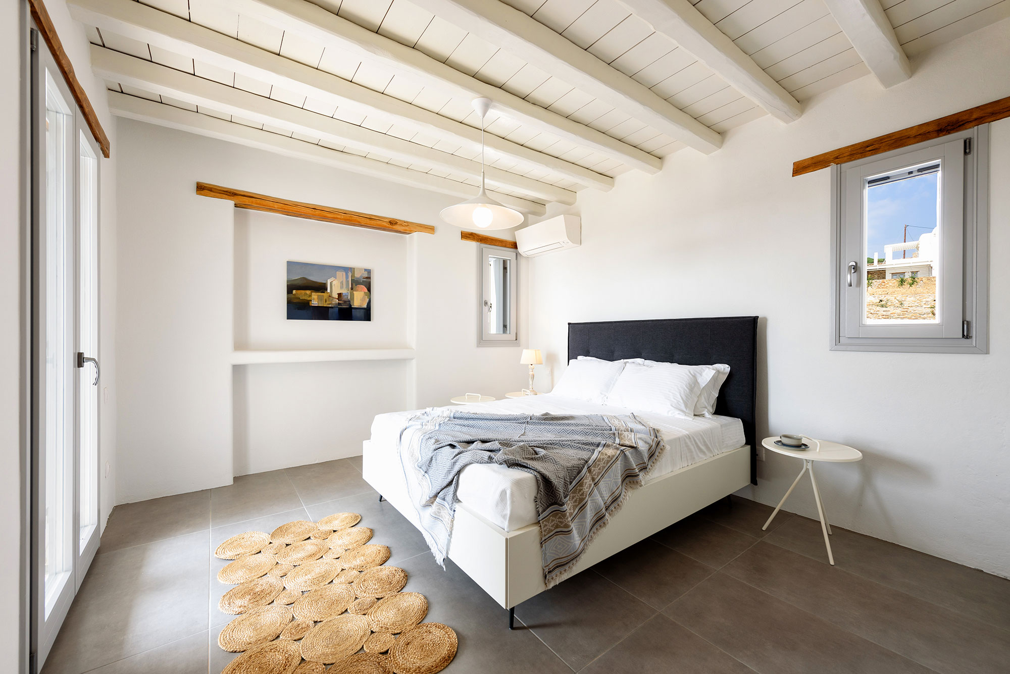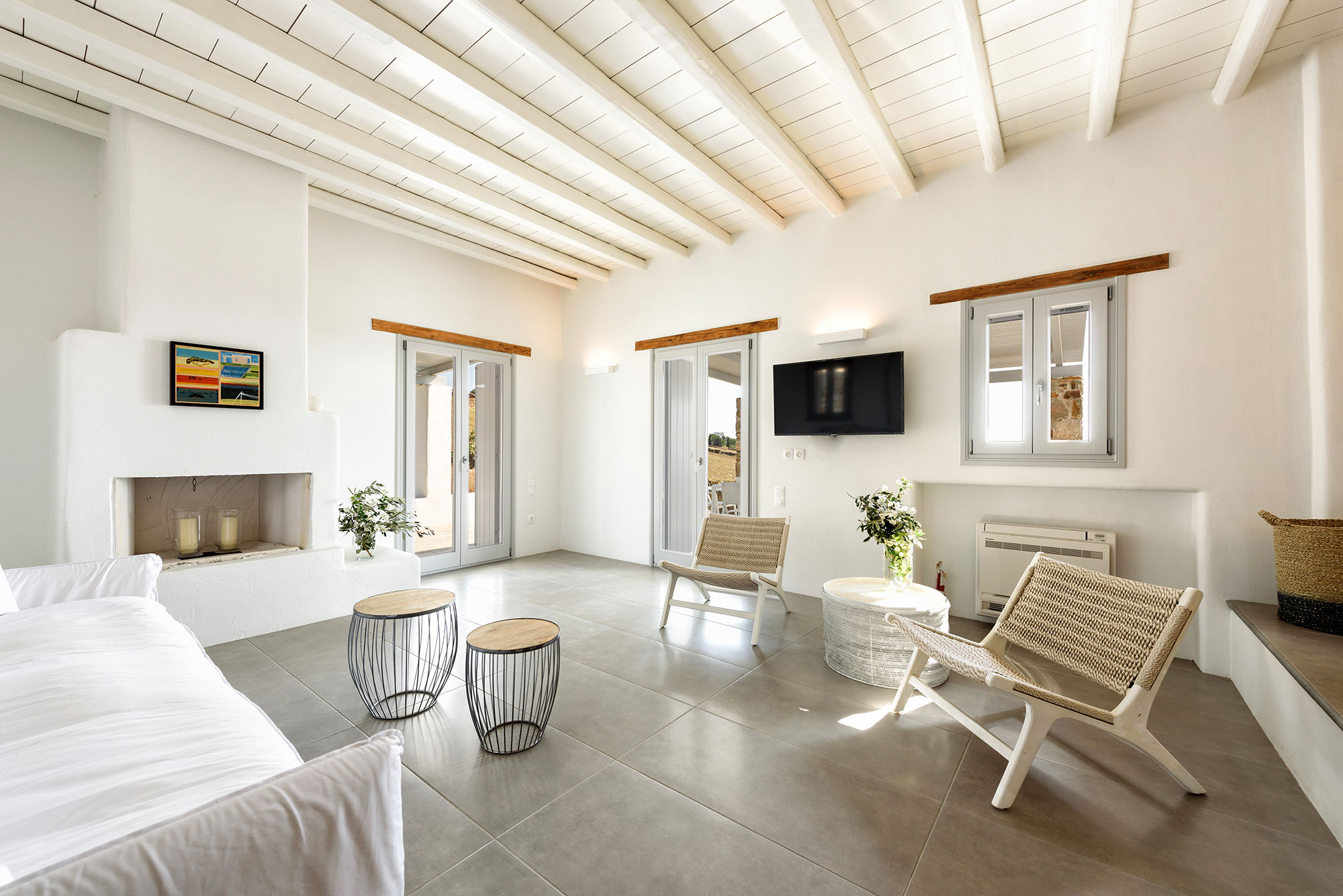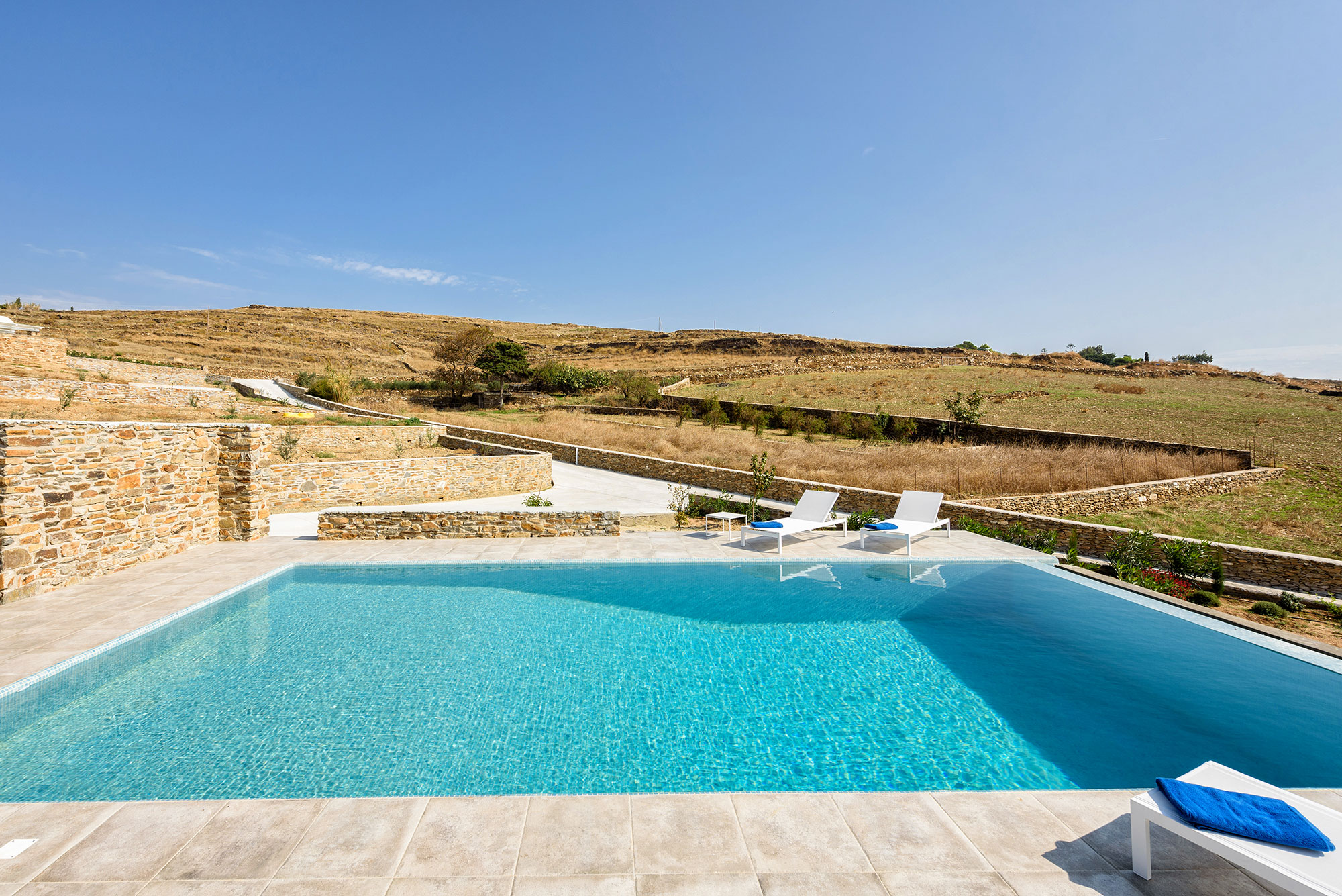 The outdoor space is thoughtfully designed with various shaded corners creating a serene landscape around the swimming pool. Complete with all modern amenities including Wi-Fi, espresso and filter coffee machines, dishwasher, BBQ area, and private parking, Villa Anemos provides everything needed for a memorable island getaway.