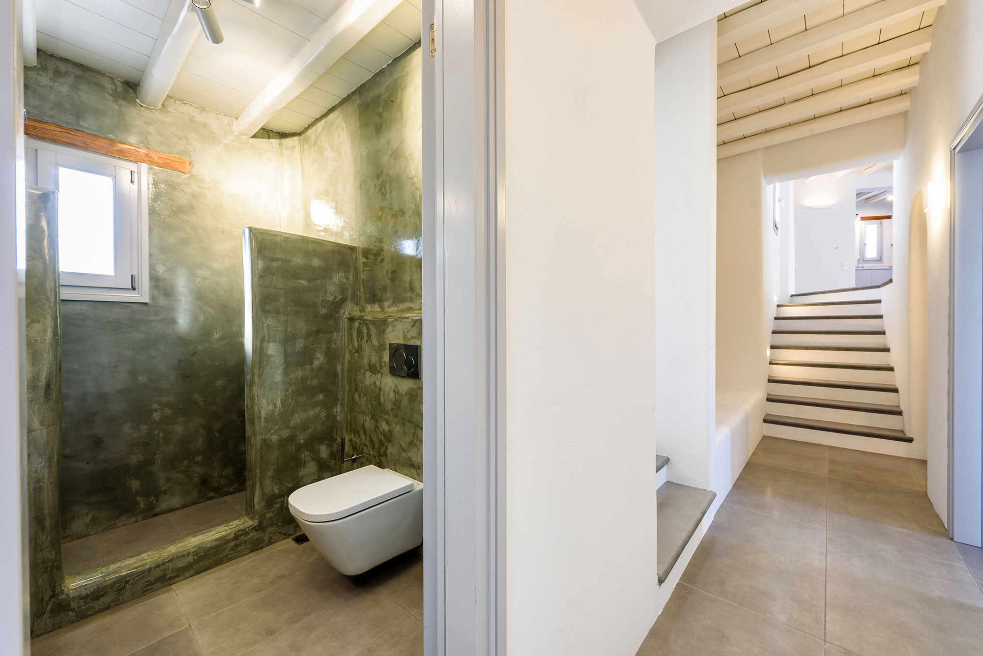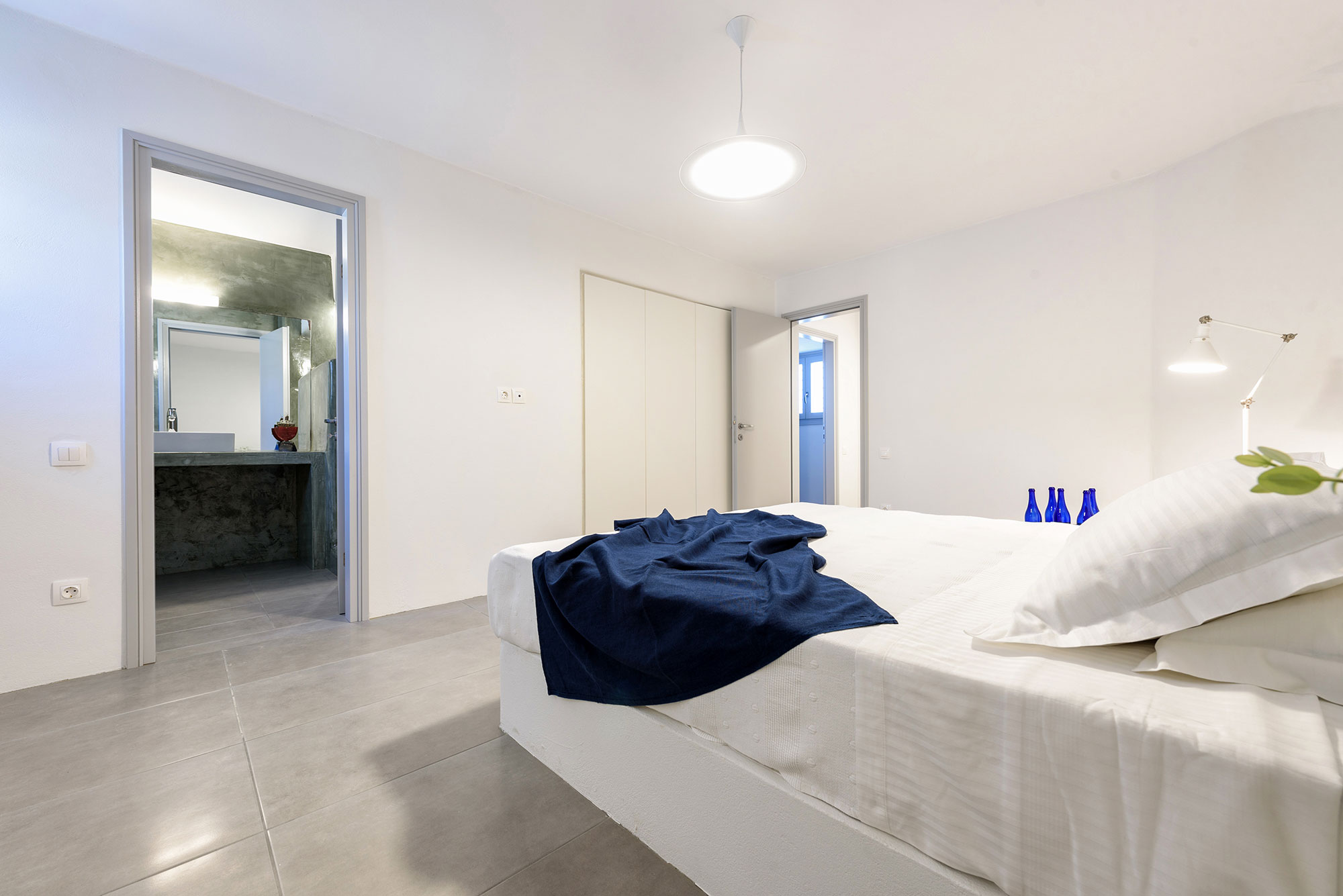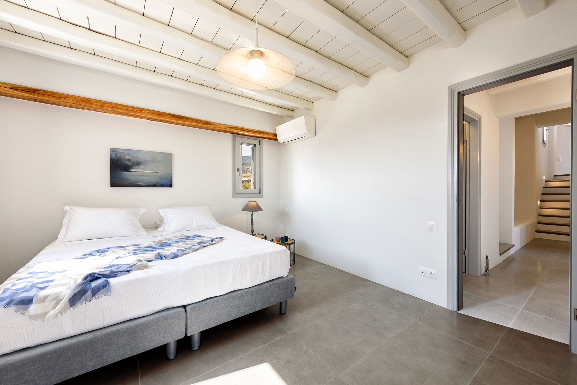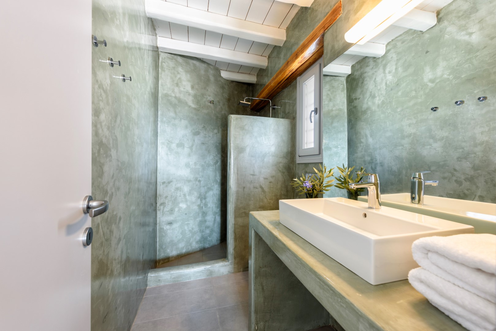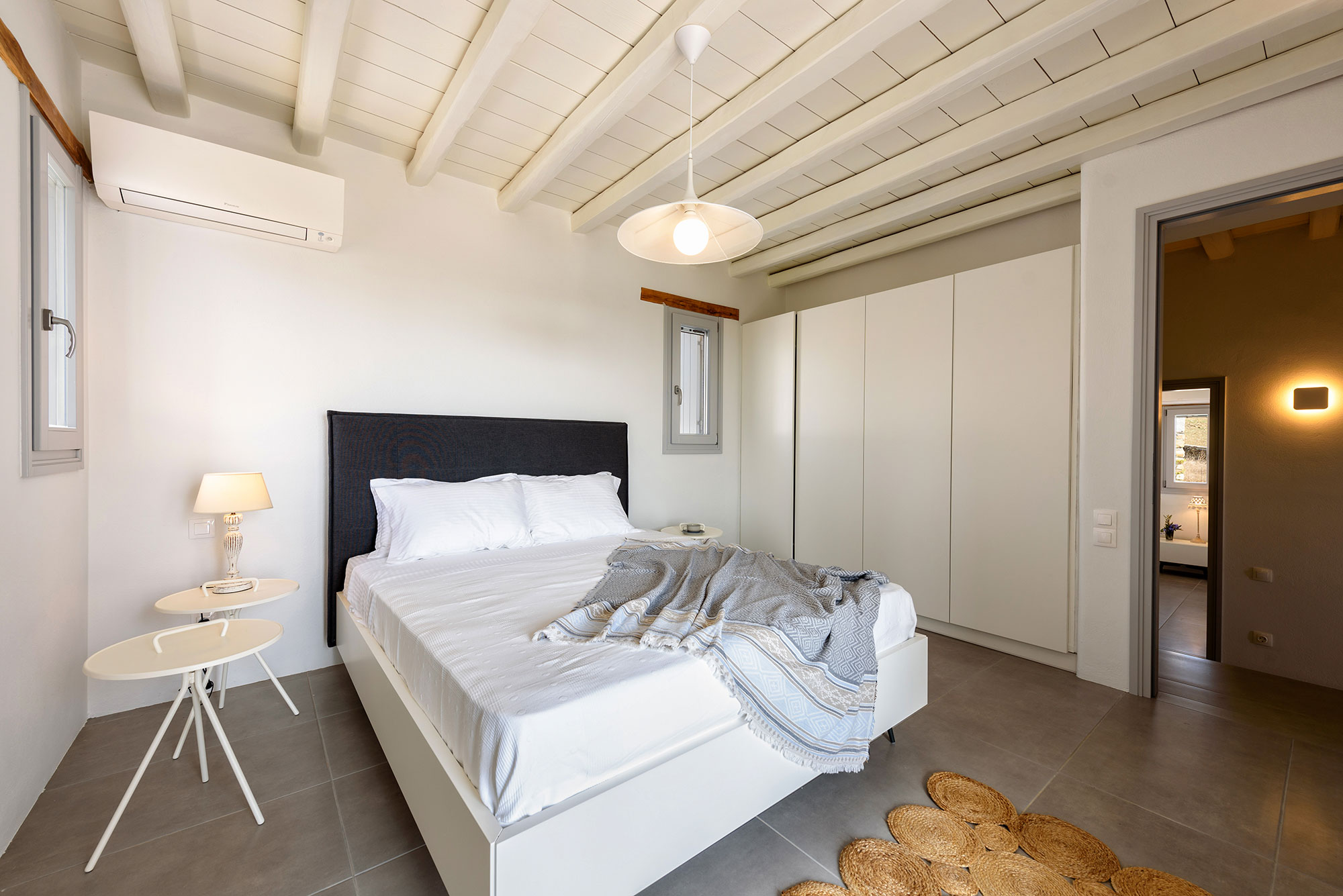 Inside, the villa impresses with its contemporary décor featuring cement surfaces, grey tones, and wooden ceilings. The whitewashed living area with modern furniture creates a calming atmosphere that flows seamlessly into the dining space and fully-equipped kitchen. The ground level houses three bedrooms – one spacious room with en-suite bathroom accessible from a sunny balcony with magnificent sea views, plus two elegantly decorated double bedrooms sharing a shower bathroom. The lower level features a large double bedroom with en-suite bathroom offering a cooler, more tranquil atmosphere. All bedrooms are equipped with air conditioning and large wardrobes for guest comfort.