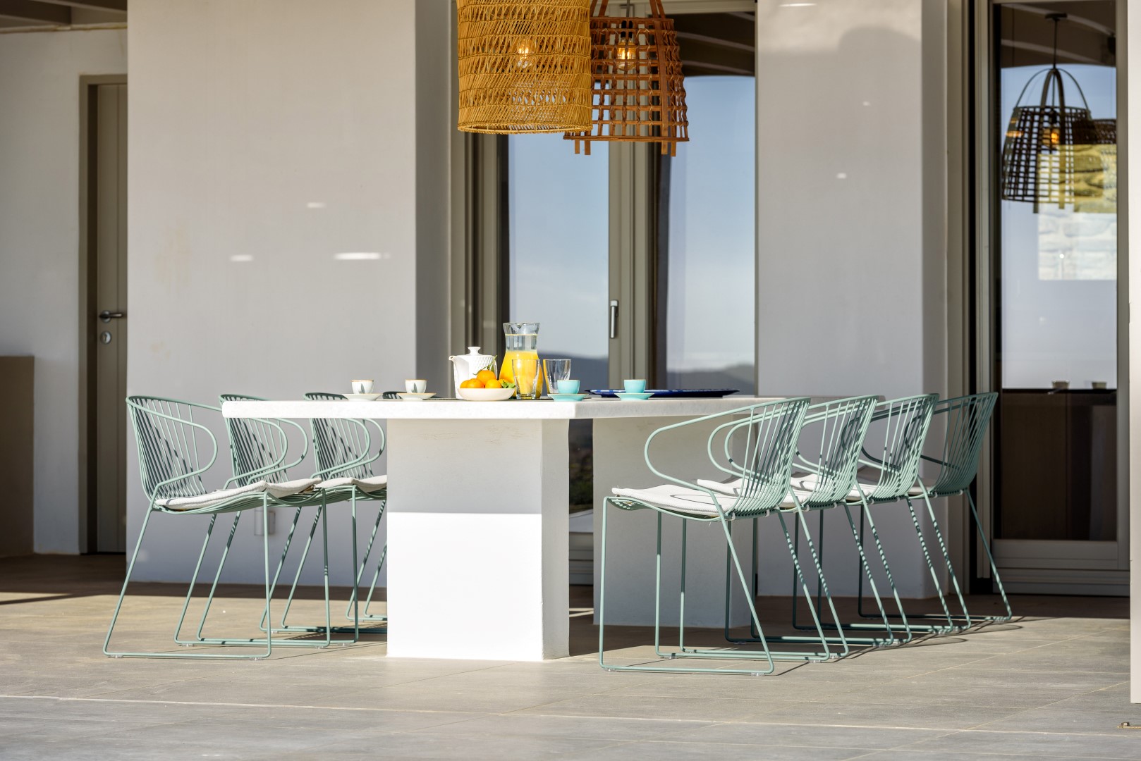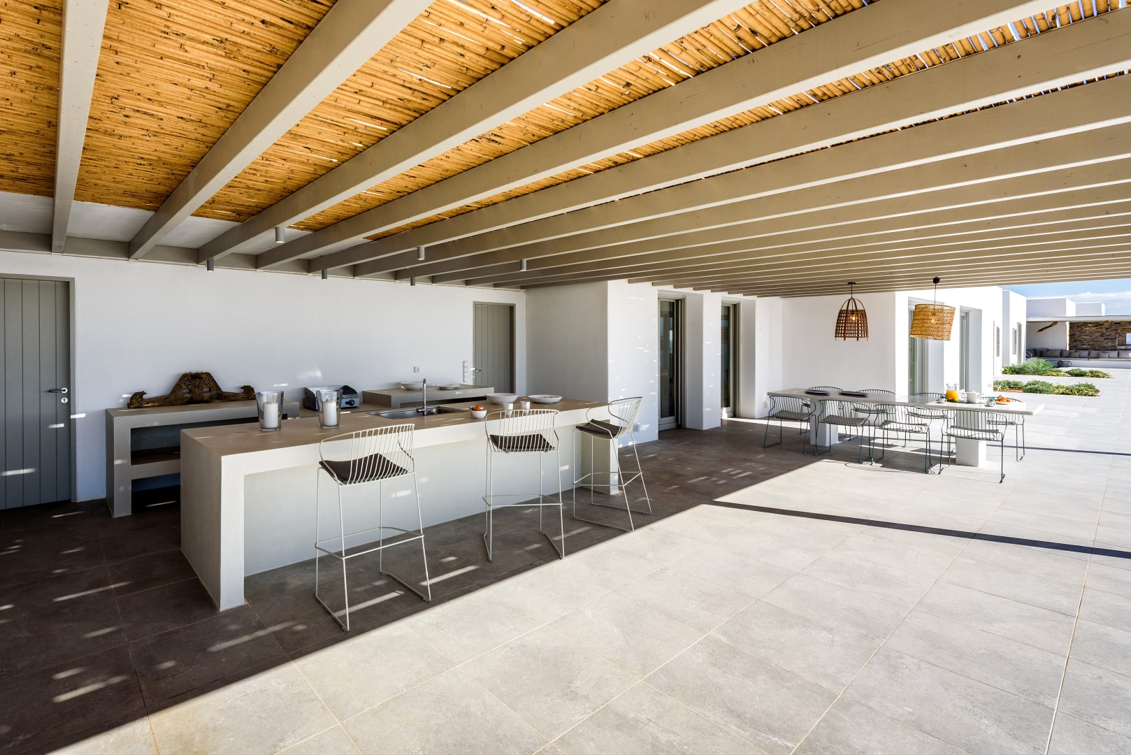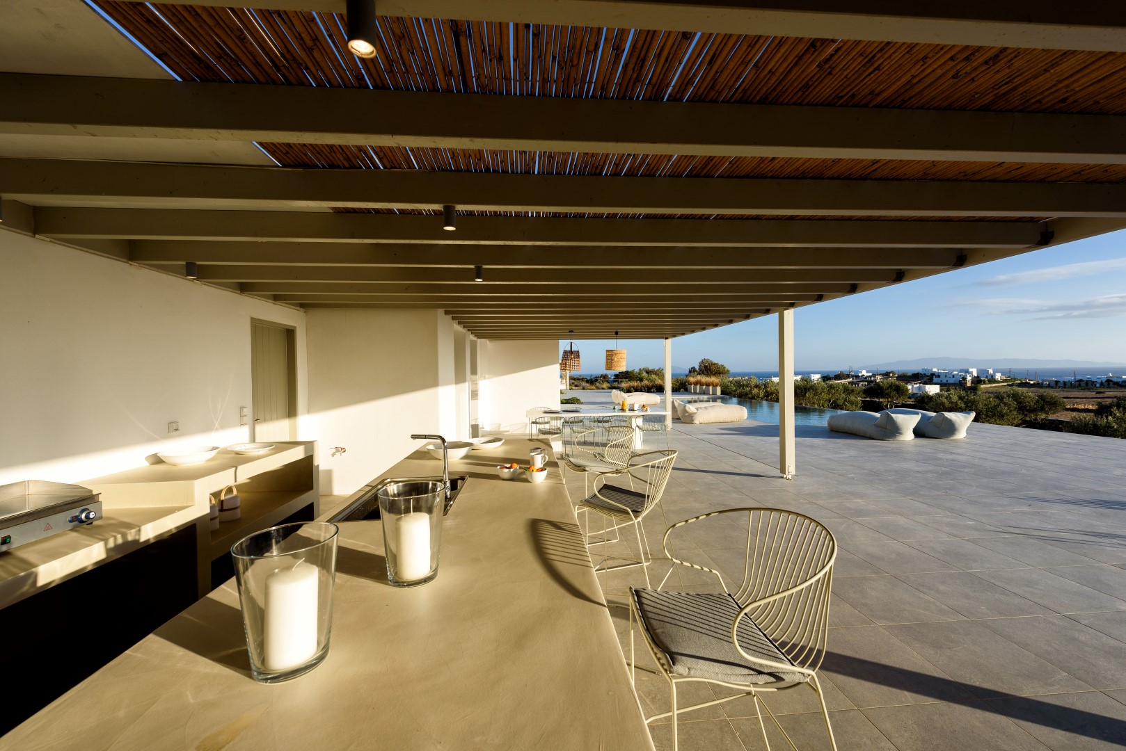 Outdoors, Villa Elea dazzles with unobstructed views of the Aegean Sea and neighboring islands. The impressive 14×5 meter private infinity pool forms the centerpiece of expansive exterior spaces that include pergola-shaded dining and lounging areas—perfect for enjoying meals, coffee, and aperitifs against the backdrop of spectacular seascapes. Shaded private parking completes the property’s amenities.
