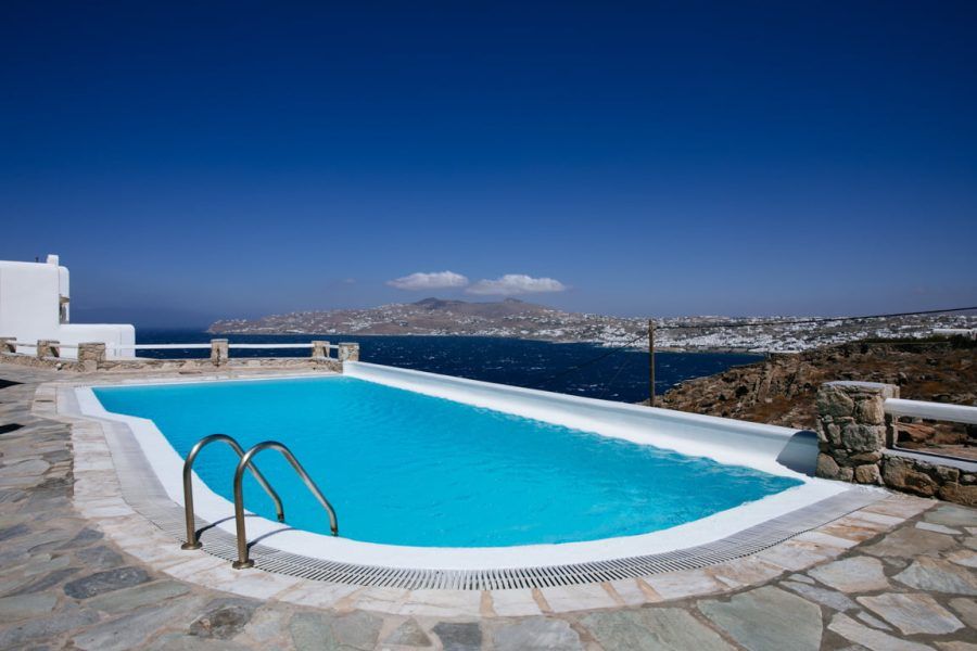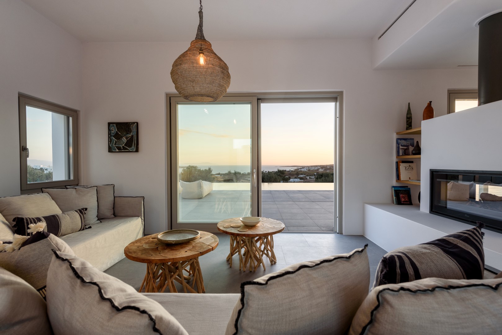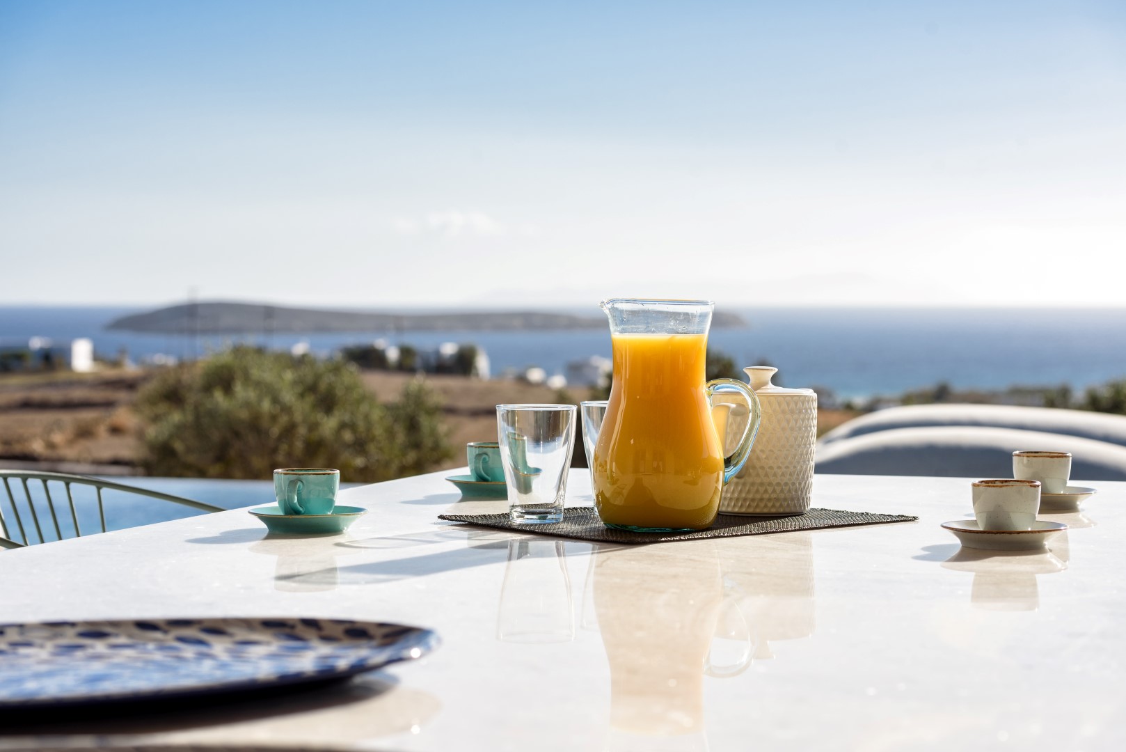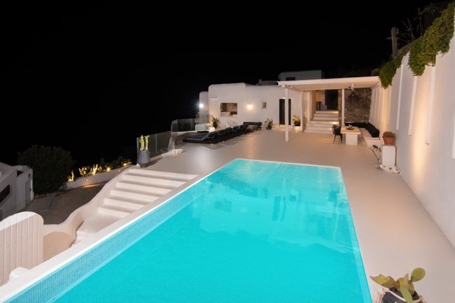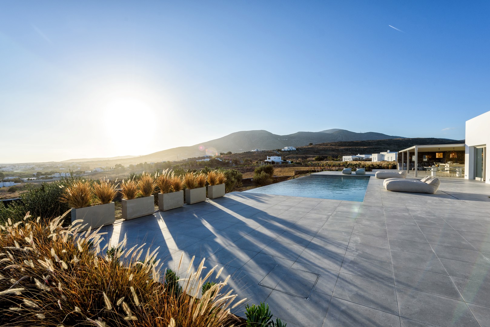 Outdoors, Villa Elea dazzles with unobstructed views of the Aegean Sea and neighboring islands. The impressive 14×5 meter private infinity pool forms the centerpiece of expansive exterior spaces that include pergola-shaded dining and lounging areas—perfect for enjoying meals, coffee, and aperitifs against the backdrop of spectacular seascapes. Shaded private parking completes the property’s amenities.