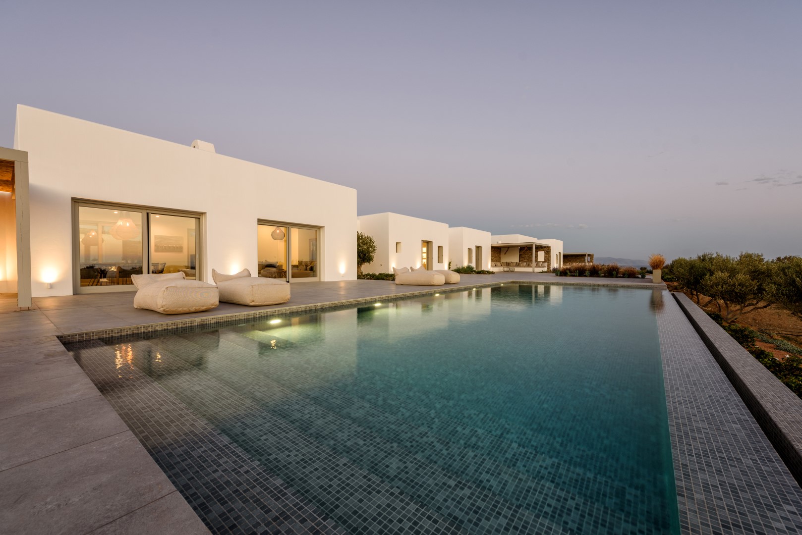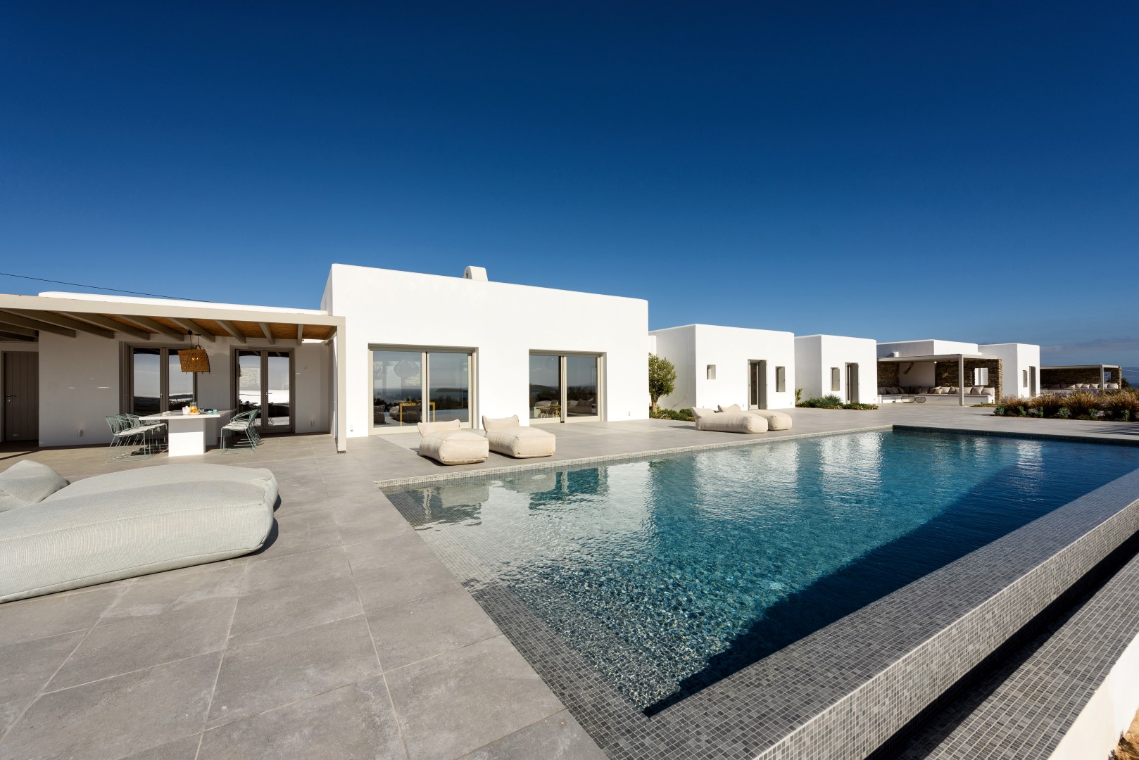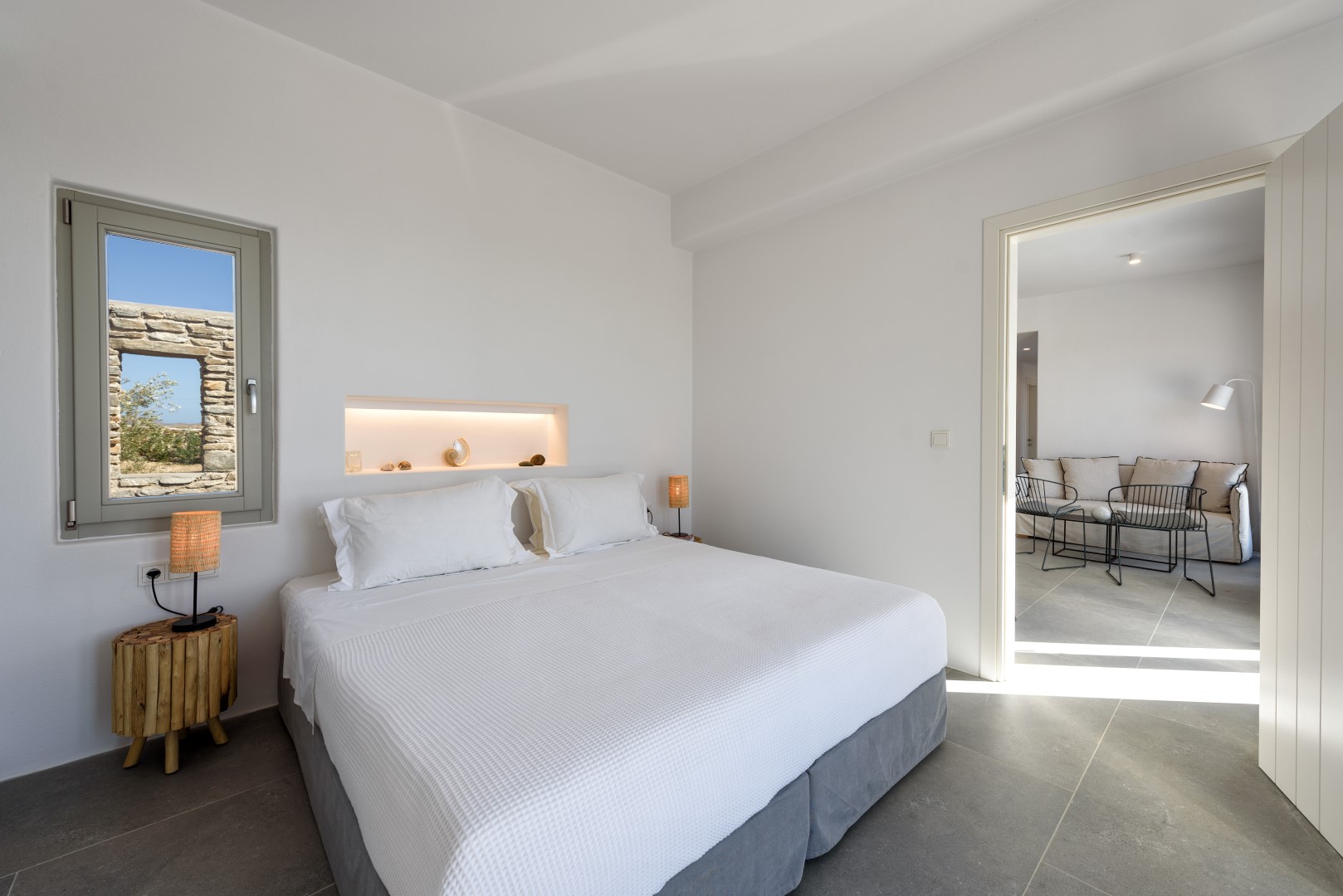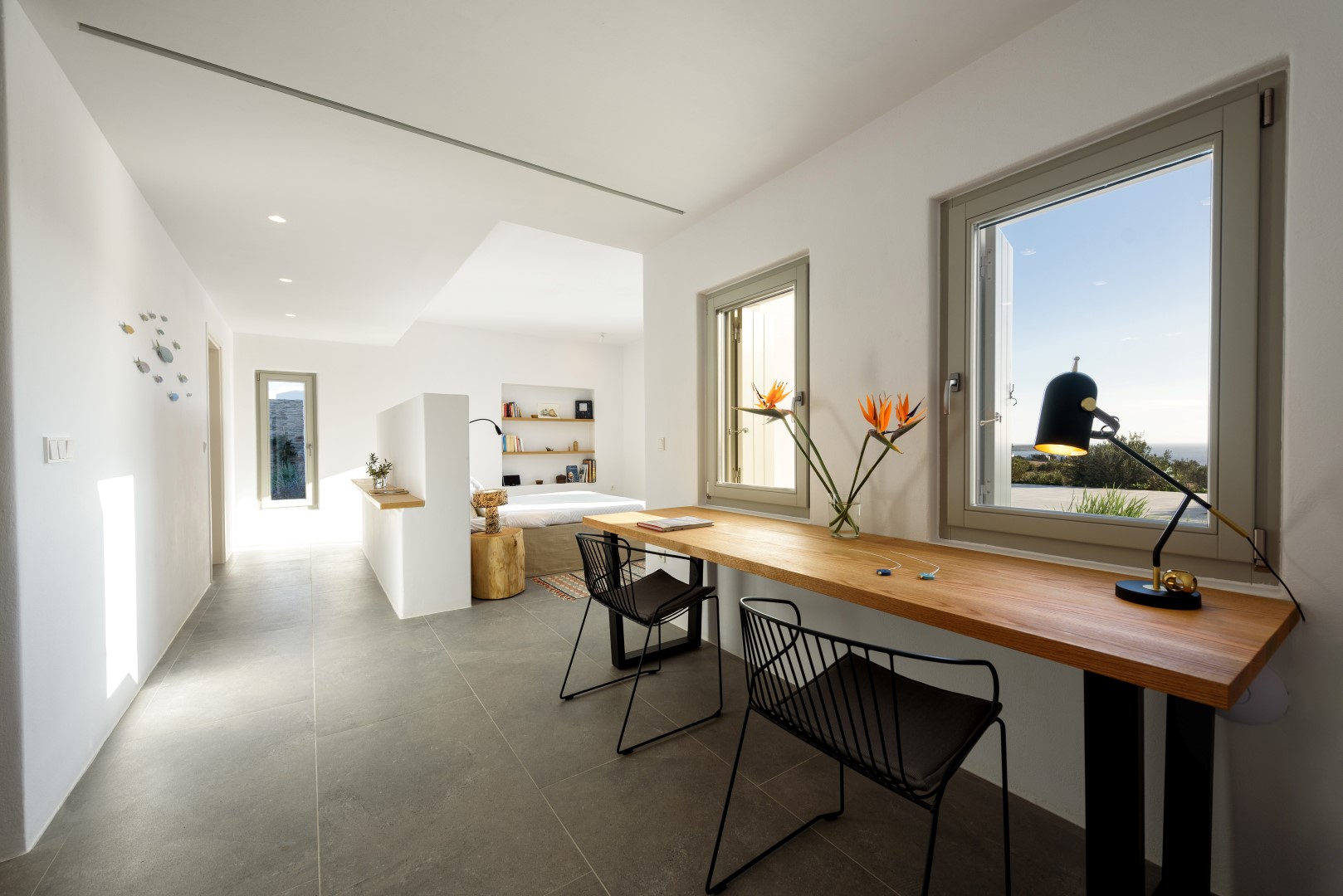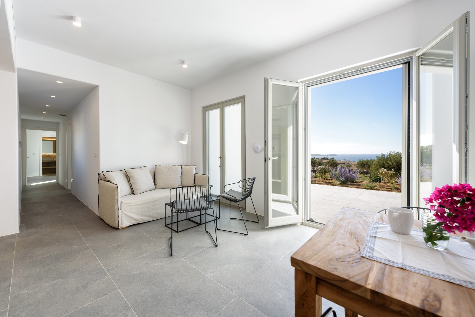 The Main House showcases two spacious en-suite double bedrooms, a guest toilet, and an open living concept with dining area and fully-equipped kitchen. The complementary Guest House provides three additional en-suite double bedrooms along with a common space featuring a kitchenette and living area. Both structures embrace contemporary design while maintaining a connection to their Cycladic surroundings.