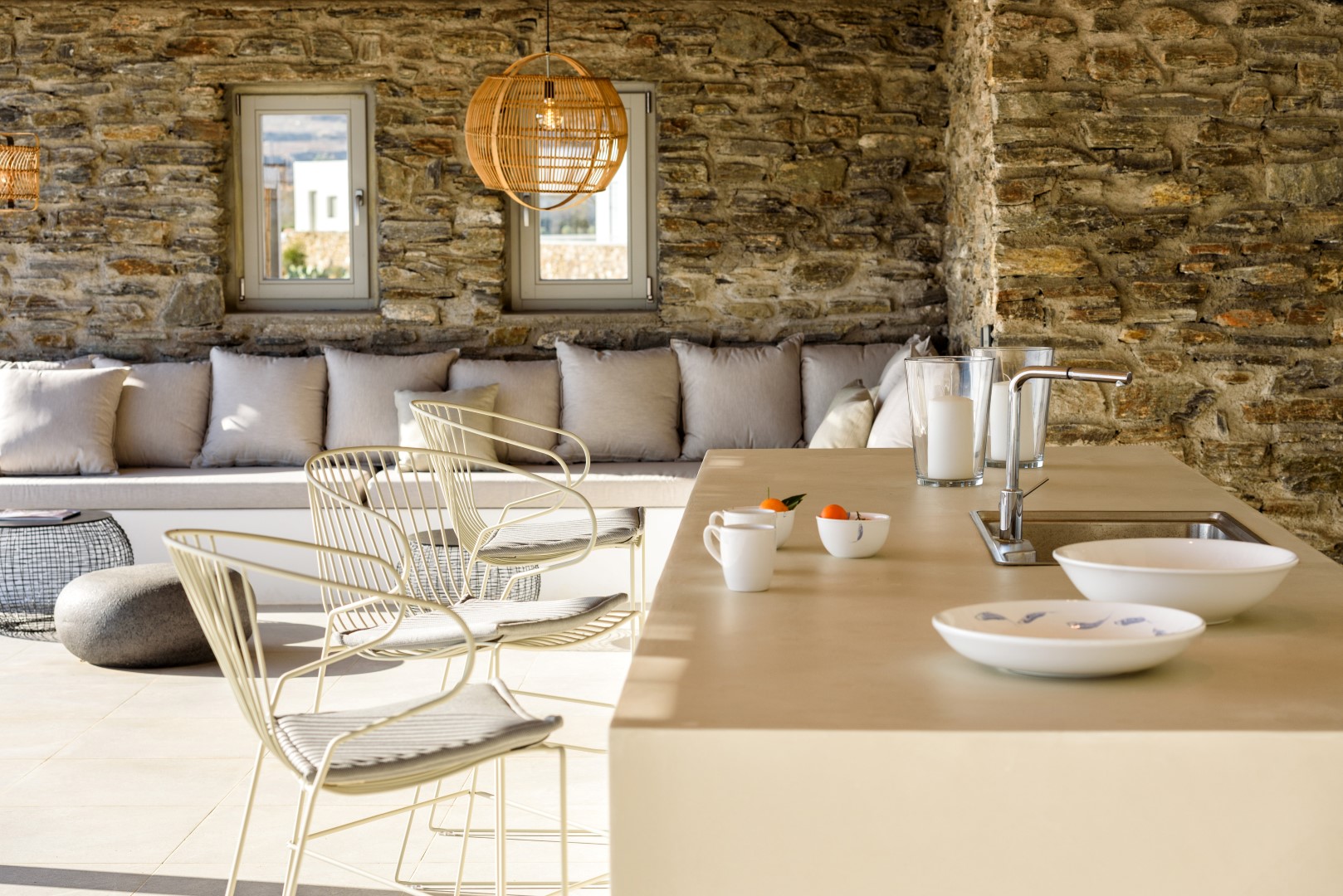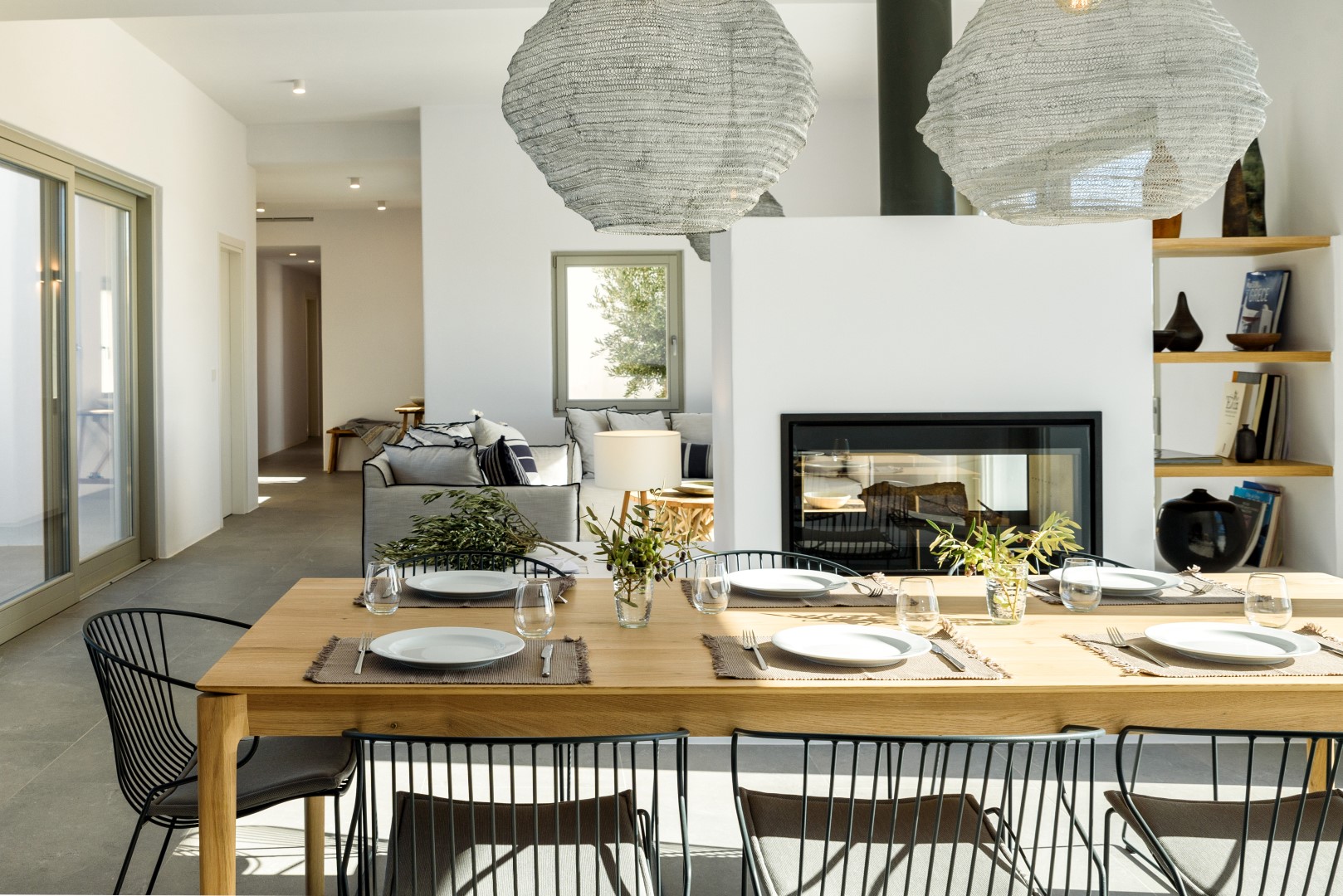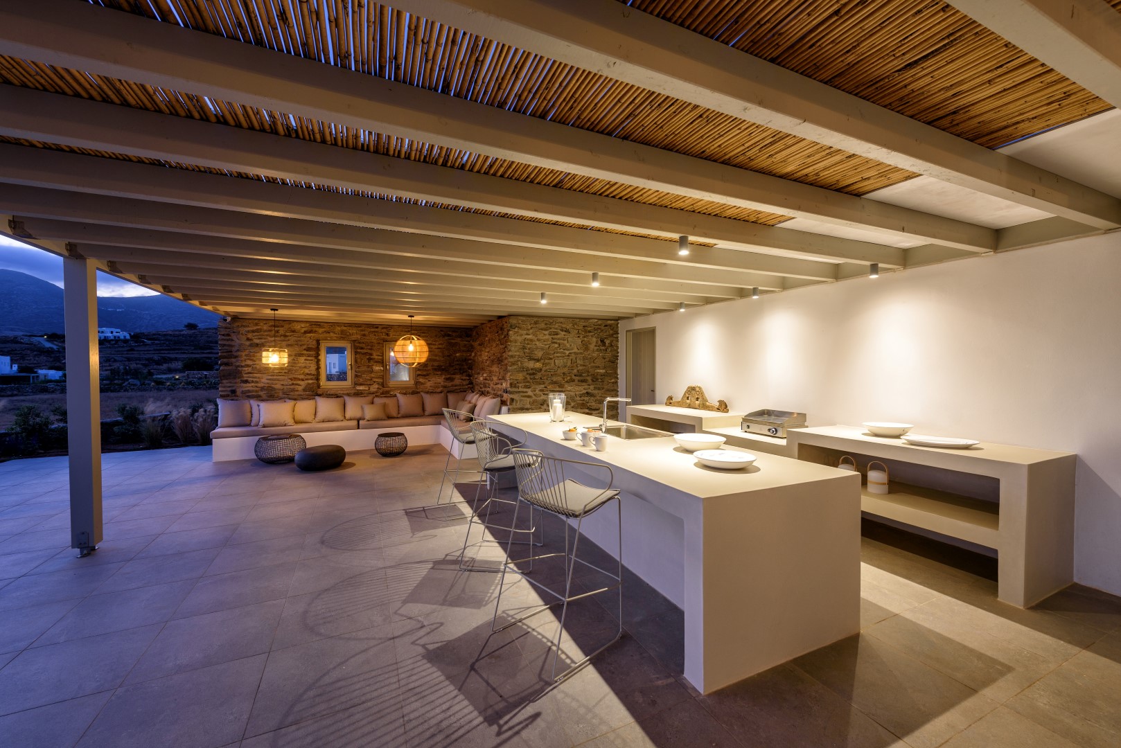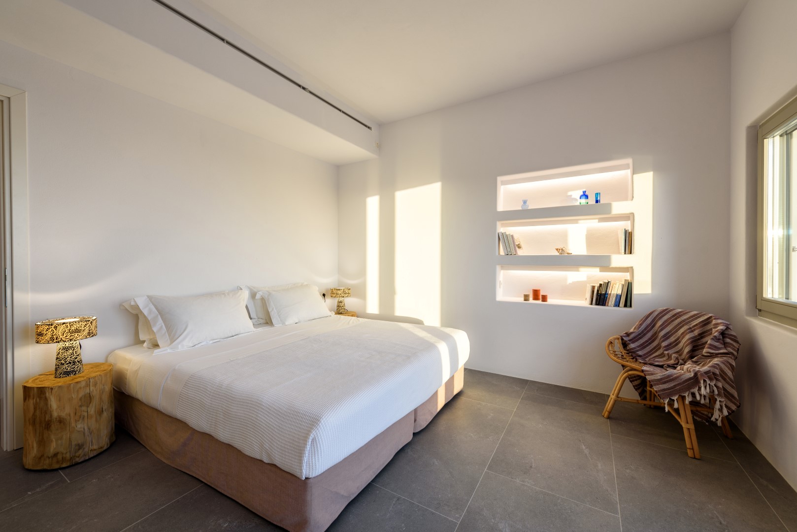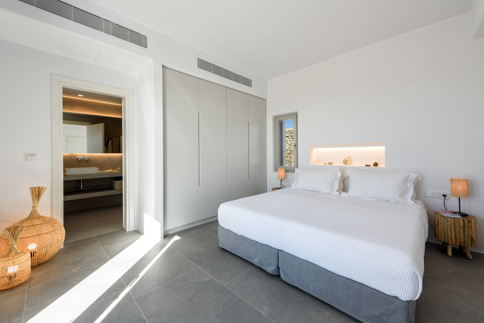 The Main House showcases two spacious en-suite double bedrooms, a guest toilet, and an open living concept with dining area and fully-equipped kitchen. The complementary Guest House provides three additional en-suite double bedrooms along with a common space featuring a kitchenette and living area. Both structures embrace contemporary design while maintaining a connection to their Cycladic surroundings.
