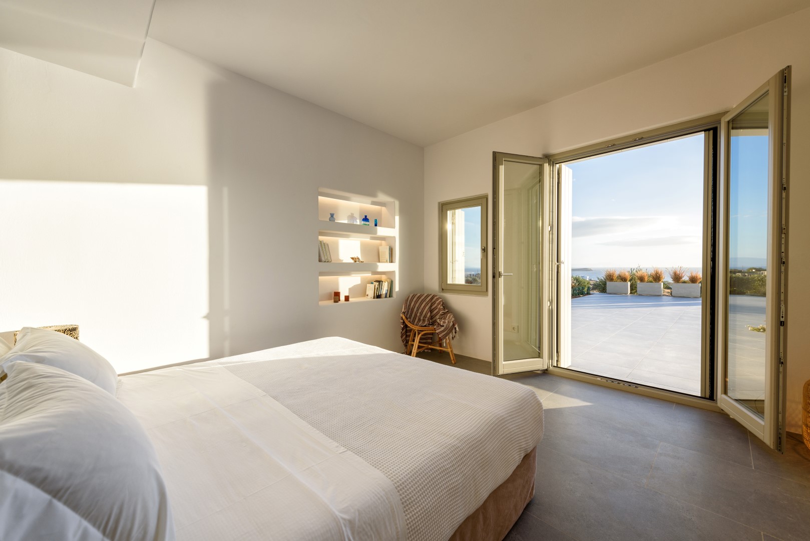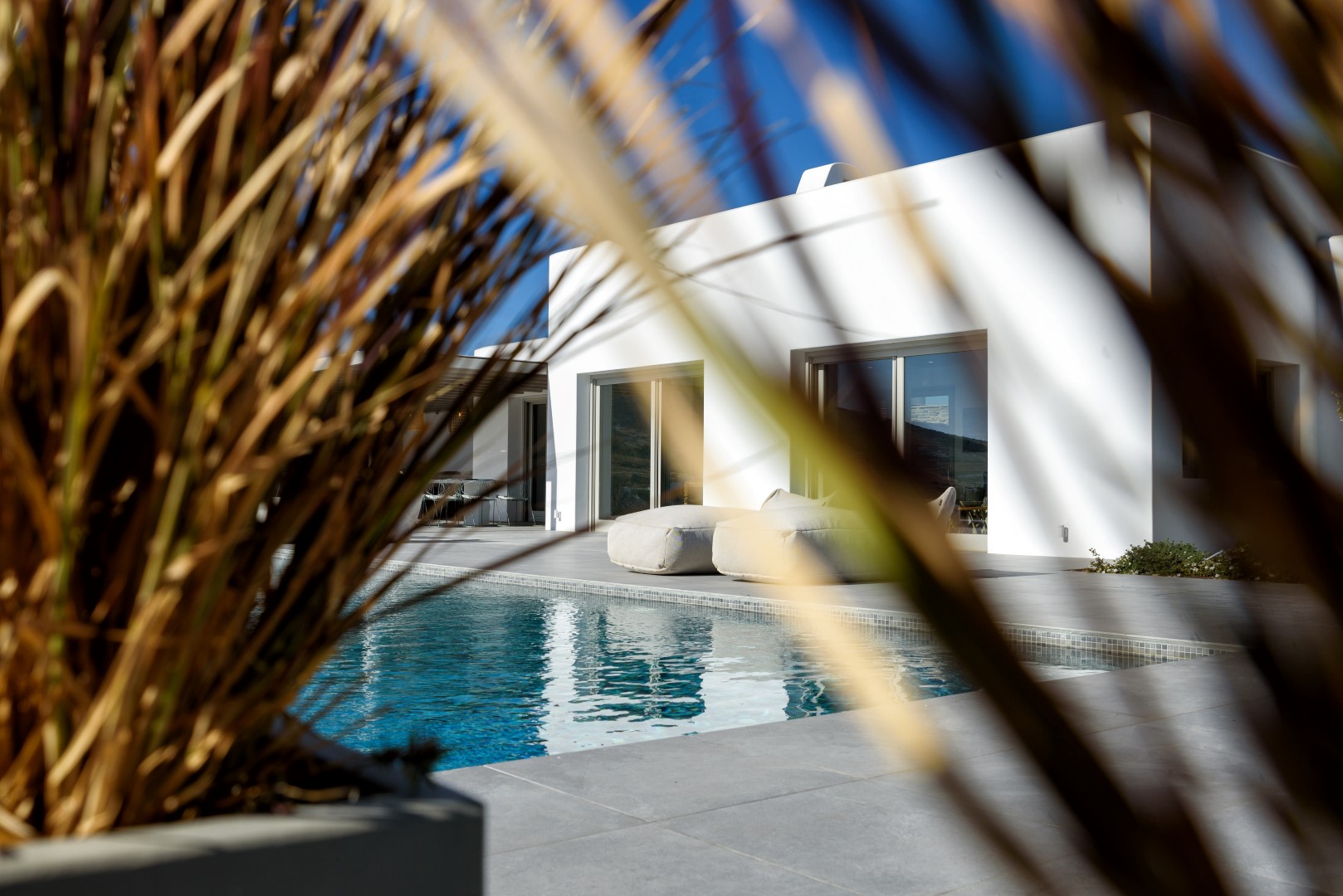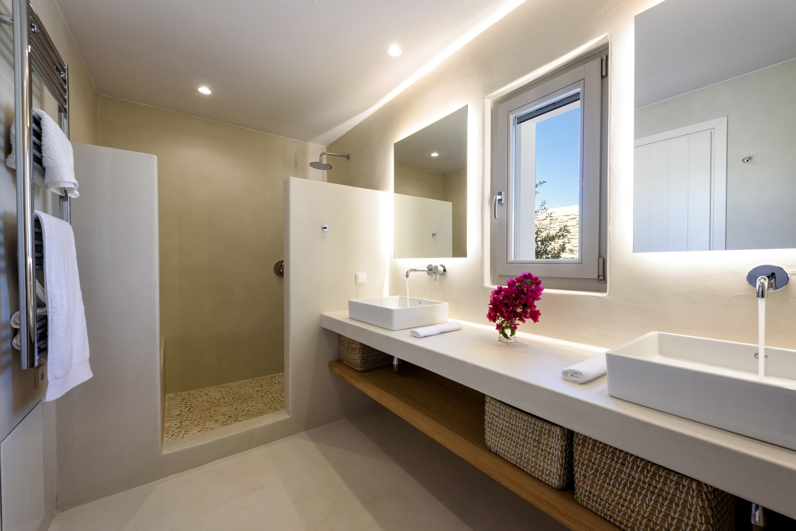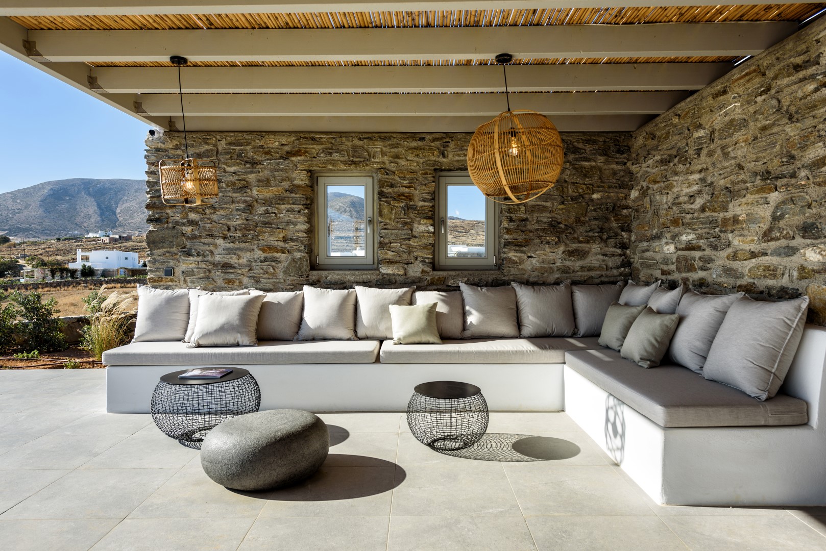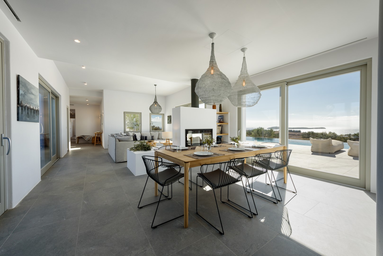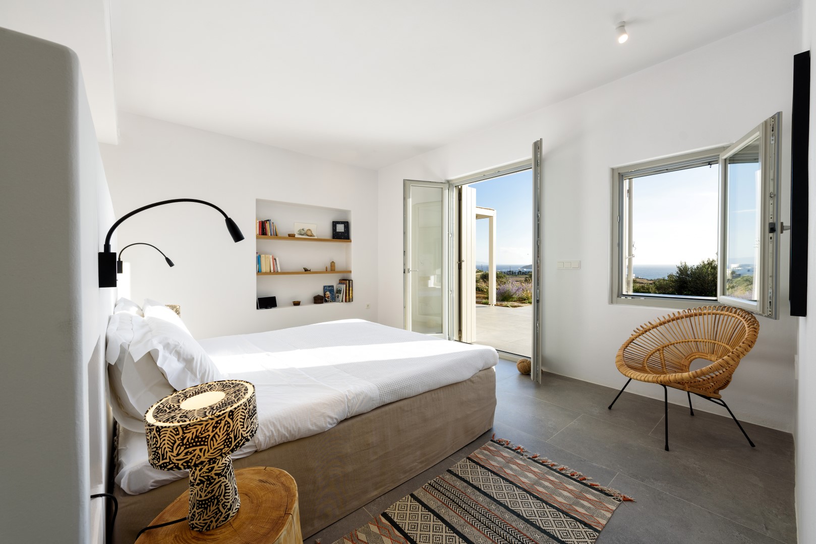 The Main House showcases two spacious en-suite double bedrooms, a guest toilet, and an open living concept with dining area and fully-equipped kitchen. The complementary Guest House provides three additional en-suite double bedrooms along with a common space featuring a kitchenette and living area. Both structures embrace contemporary design while maintaining a connection to their Cycladic surroundings.
