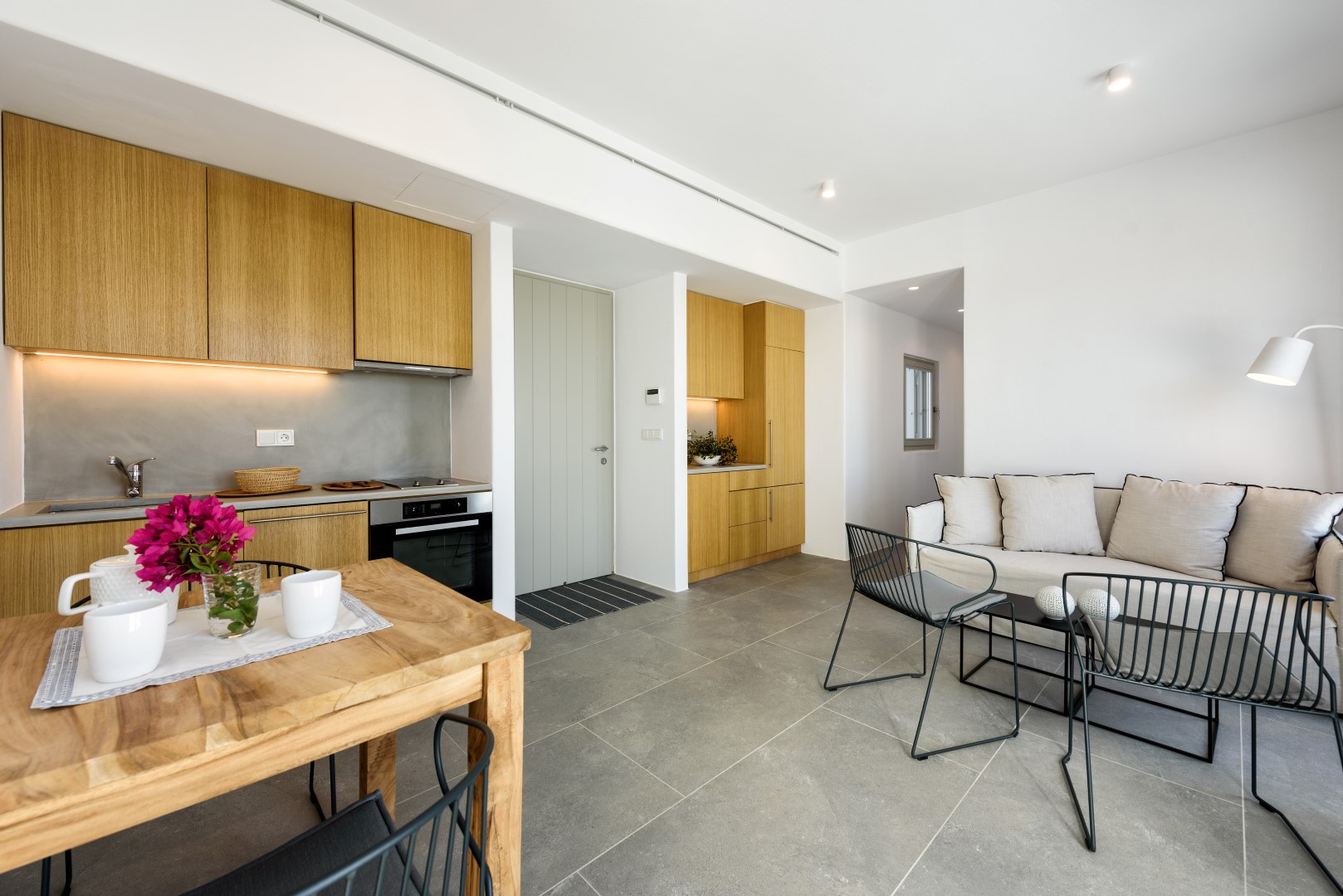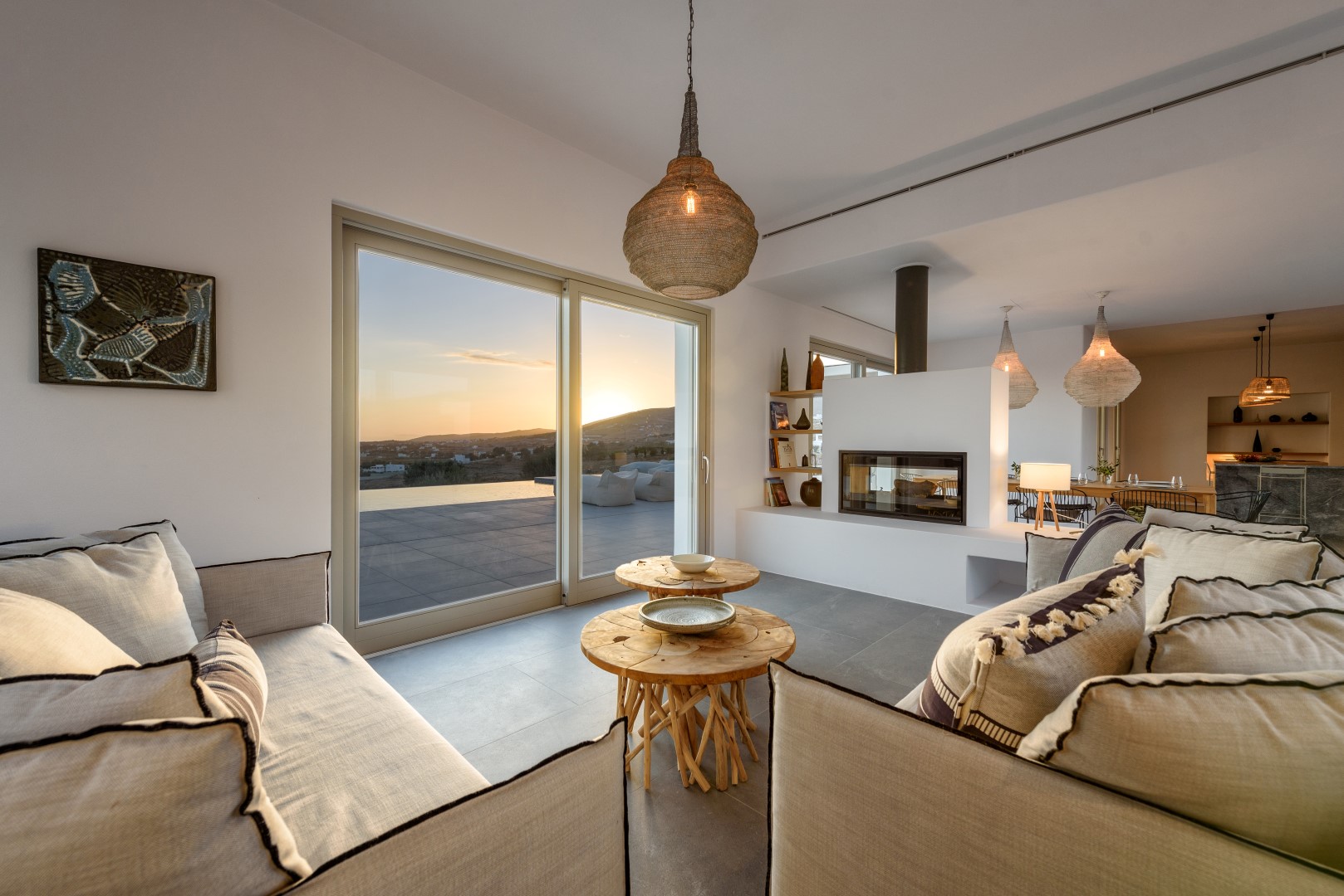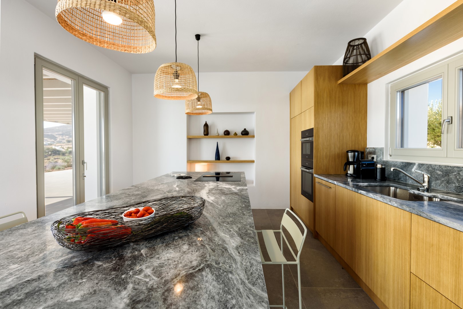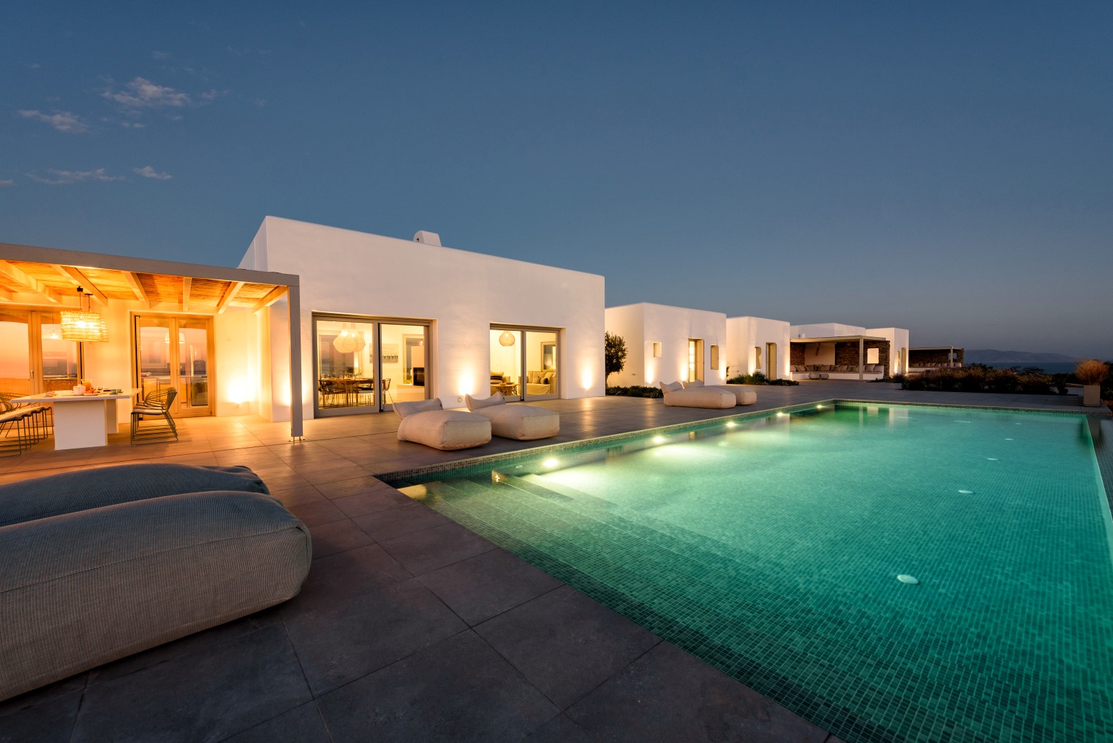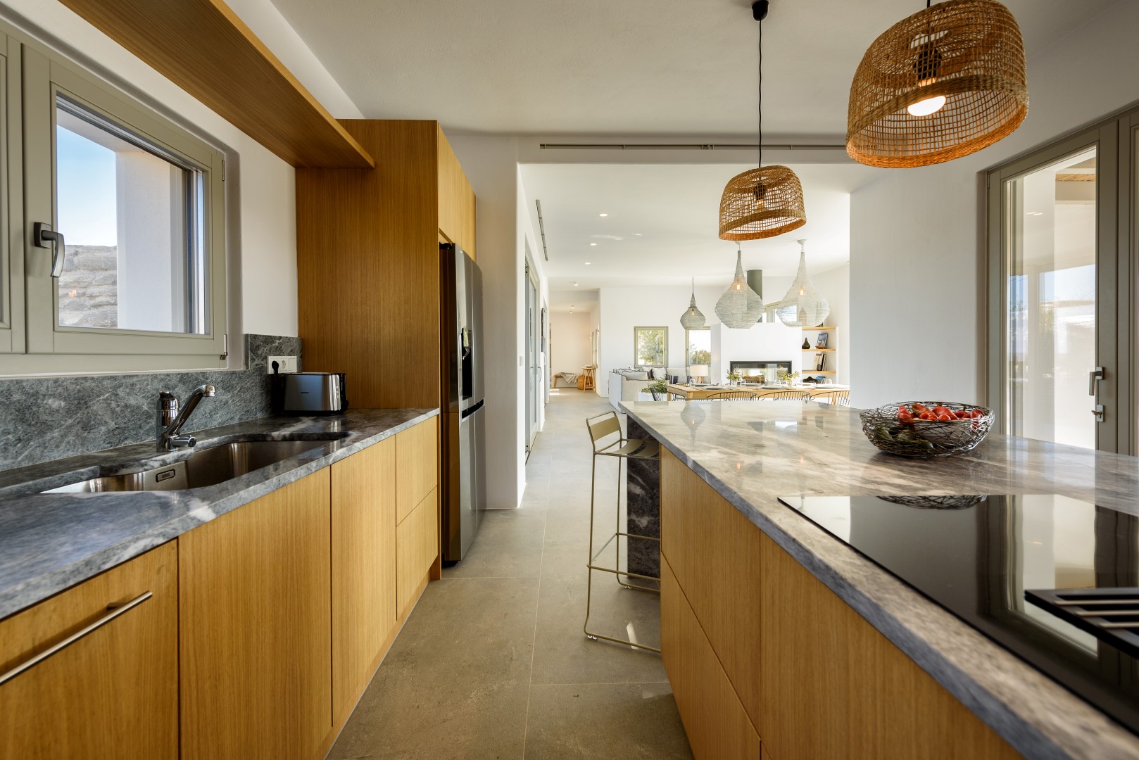 The Main House showcases two spacious en-suite double bedrooms, a guest toilet, and an open living concept with dining area and fully-equipped kitchen. The complementary Guest House provides three additional en-suite double bedrooms along with a common space featuring a kitchenette and living area. Both structures embrace contemporary design while maintaining a connection to their Cycladic surroundings.