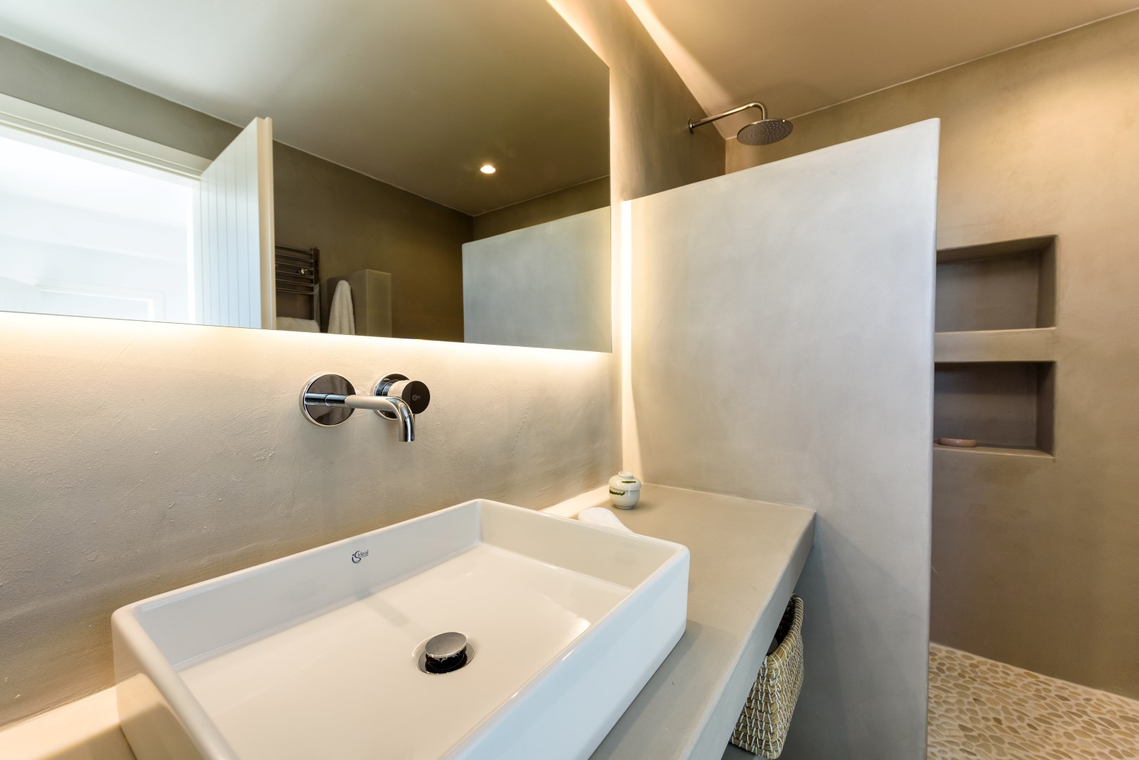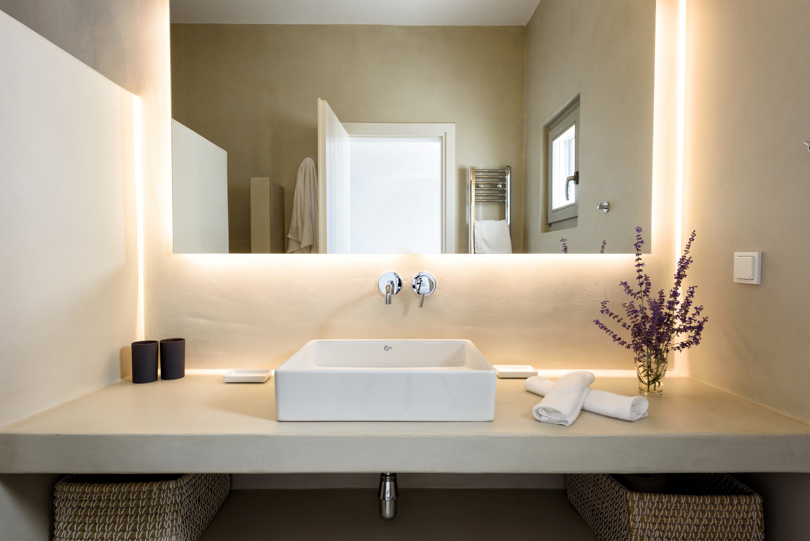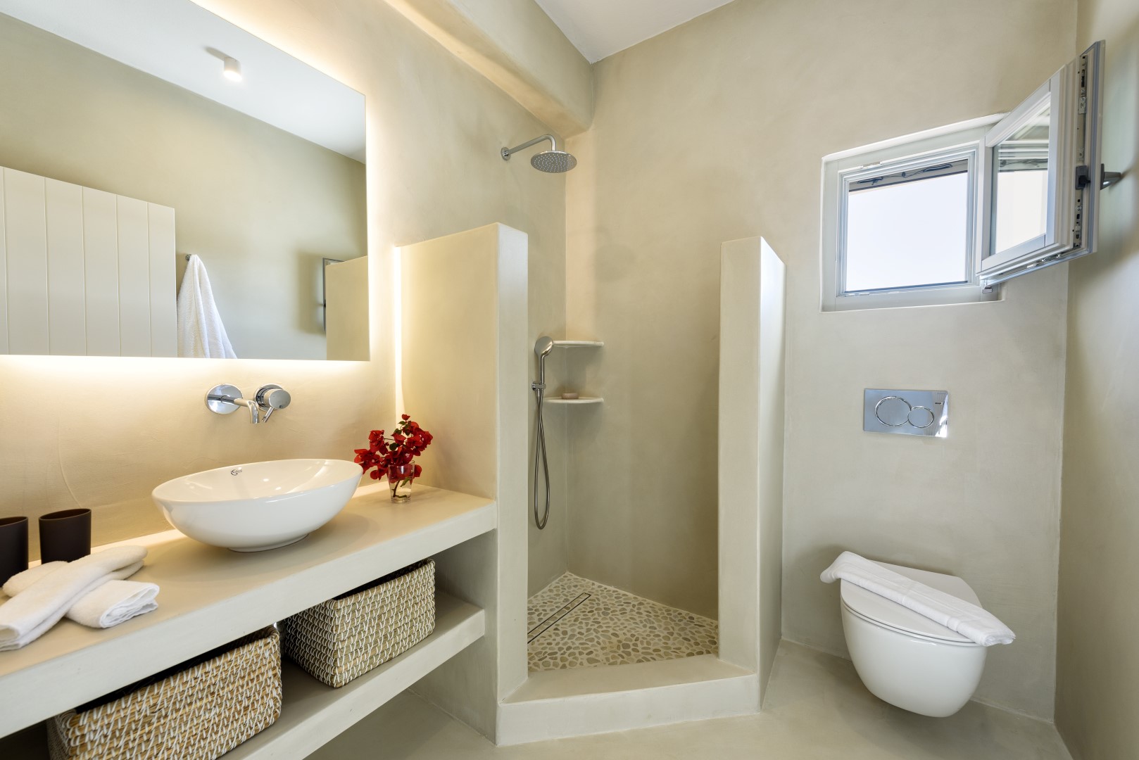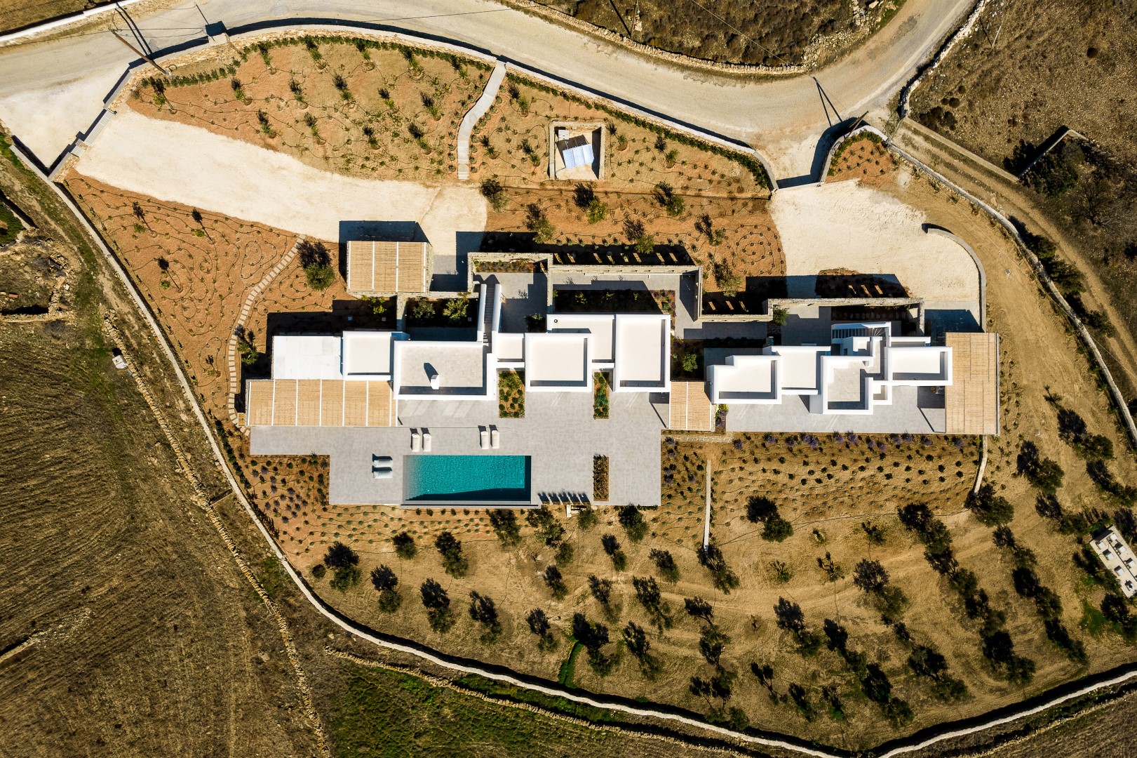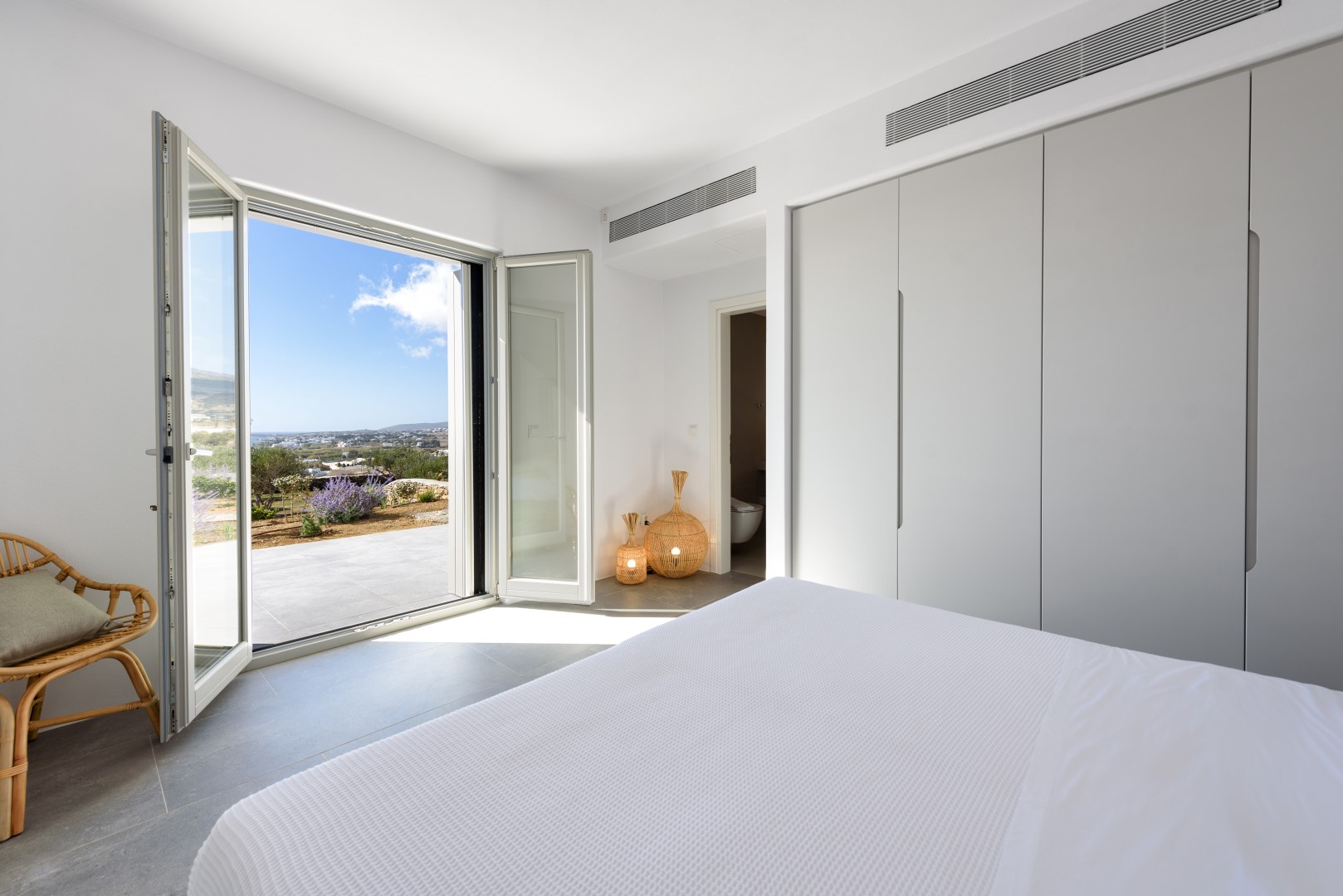 The Main House showcases two spacious en-suite double bedrooms, a guest toilet, and an open living concept with dining area and fully-equipped kitchen. The complementary Guest House provides three additional en-suite double bedrooms along with a common space featuring a kitchenette and living area. Both structures embrace contemporary design while maintaining a connection to their Cycladic surroundings.