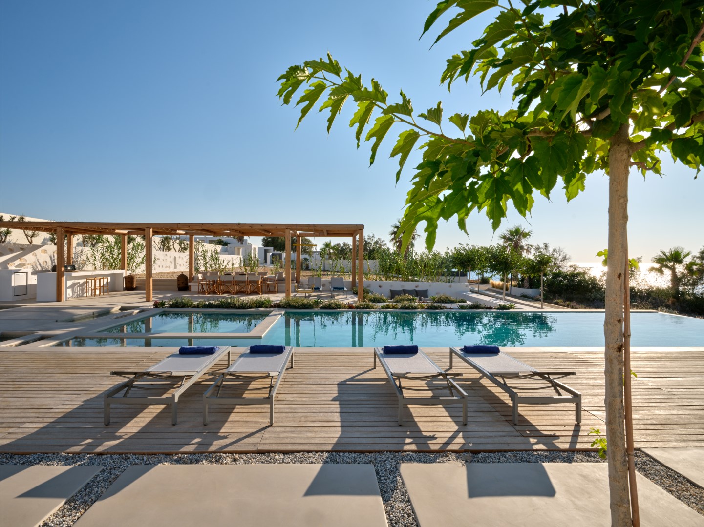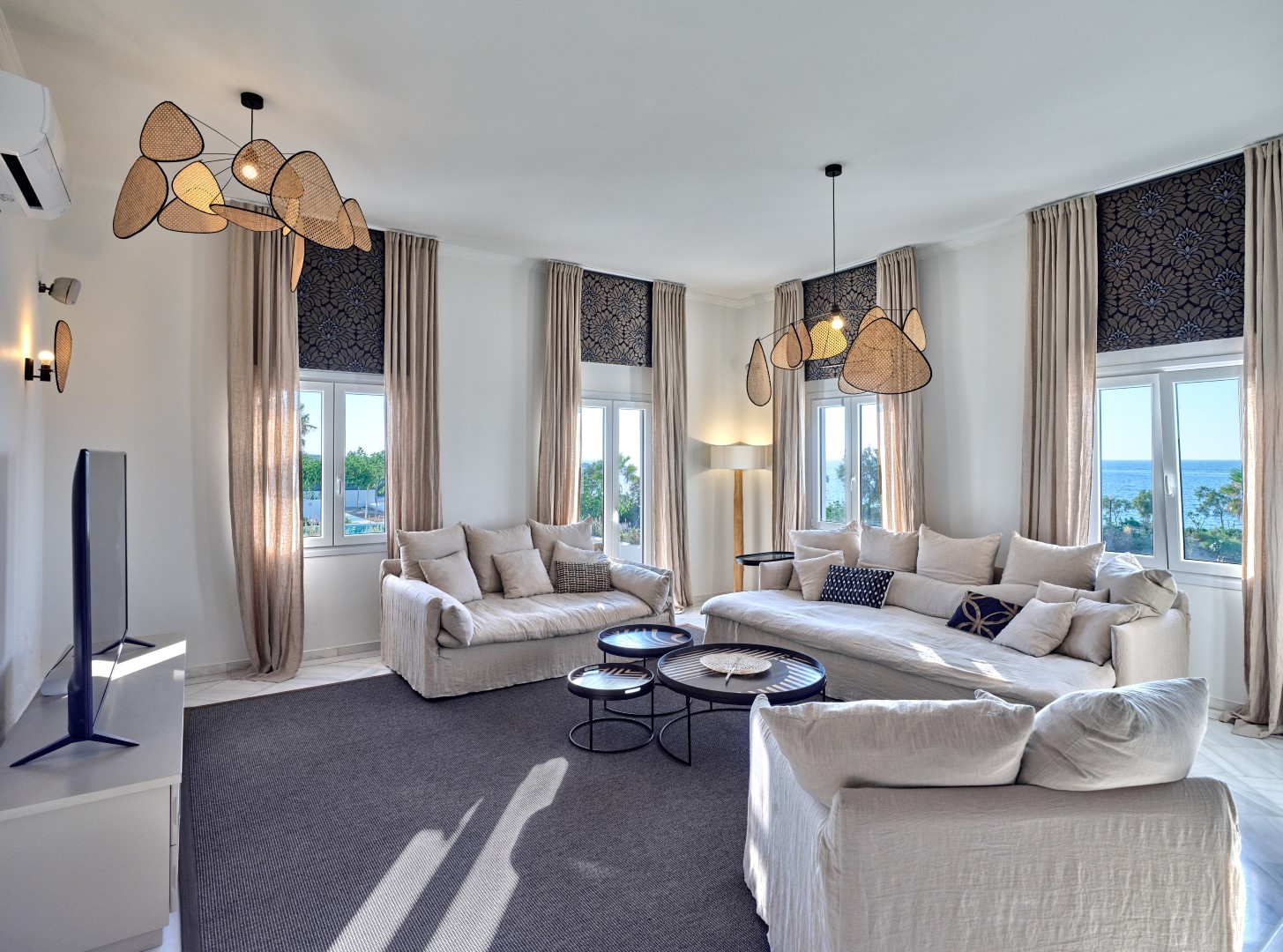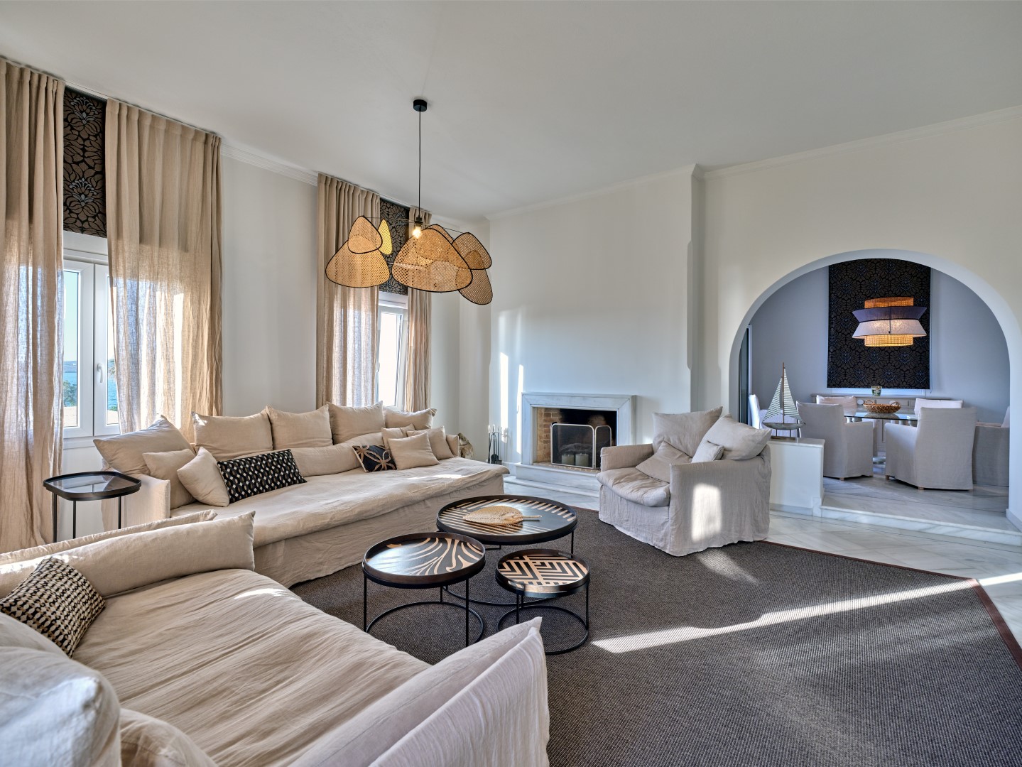 Villa Eloise’s outdoor spaces truly distinguish this property from the ordinary. The showstopping infinity pool with dedicated baby section and bubbling fountain creates a mesmerizing focal point, complemented by a relaxing jacuzzi. Multiple pergola-shaded areas offer diverse settings for conversation or contemplation, while the outdoor kitchen/bar and professional BBQ setup invite culinary adventures under the stars. Perhaps most uniquely, the property features an outdoor cinema and fireplace—creating magical evening experiences against the backdrop of the Aegean.