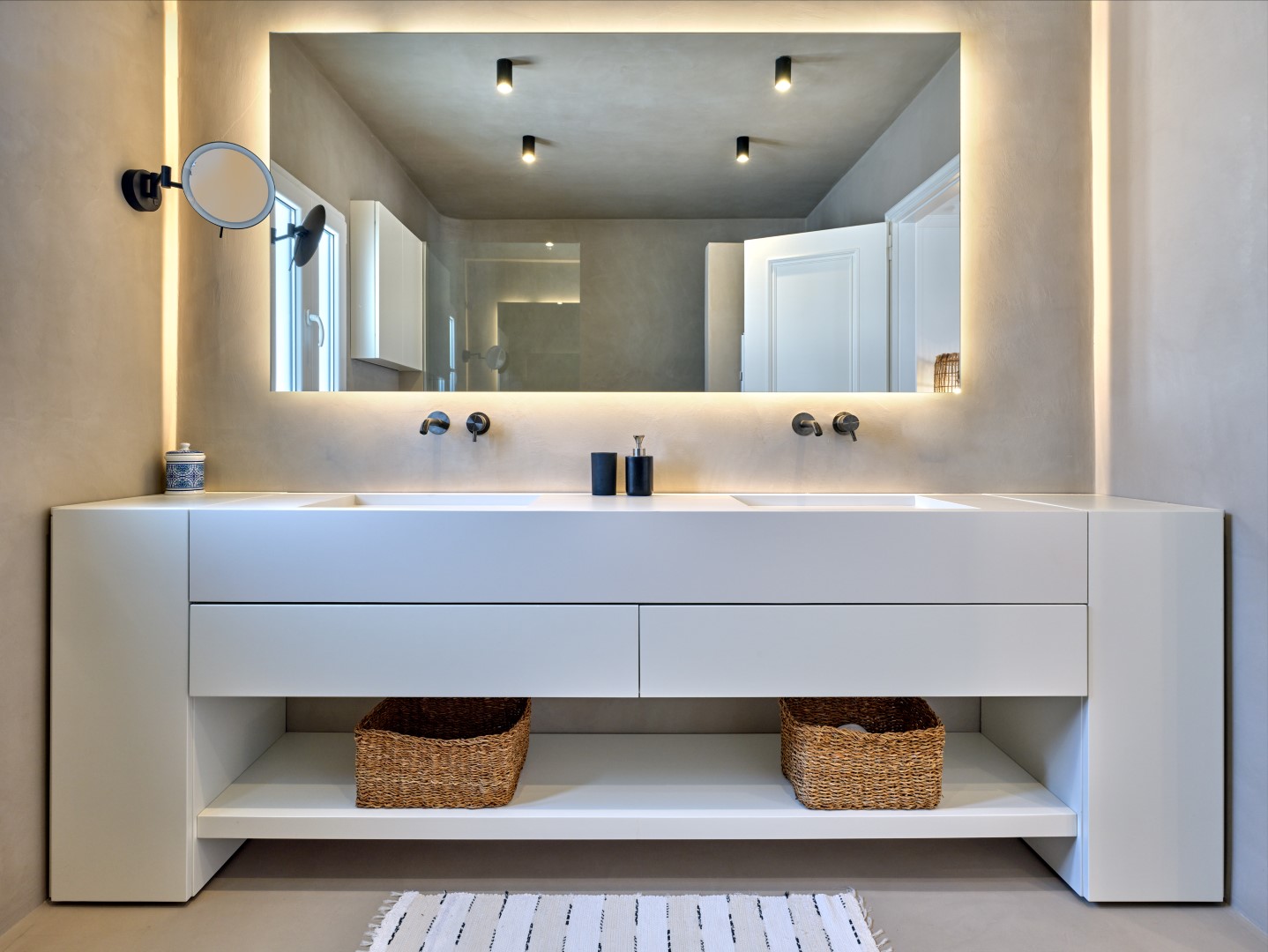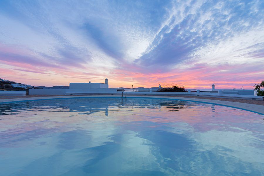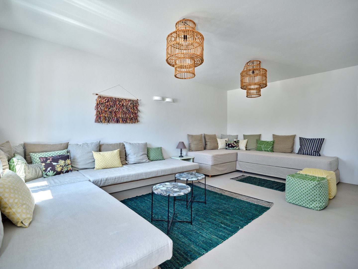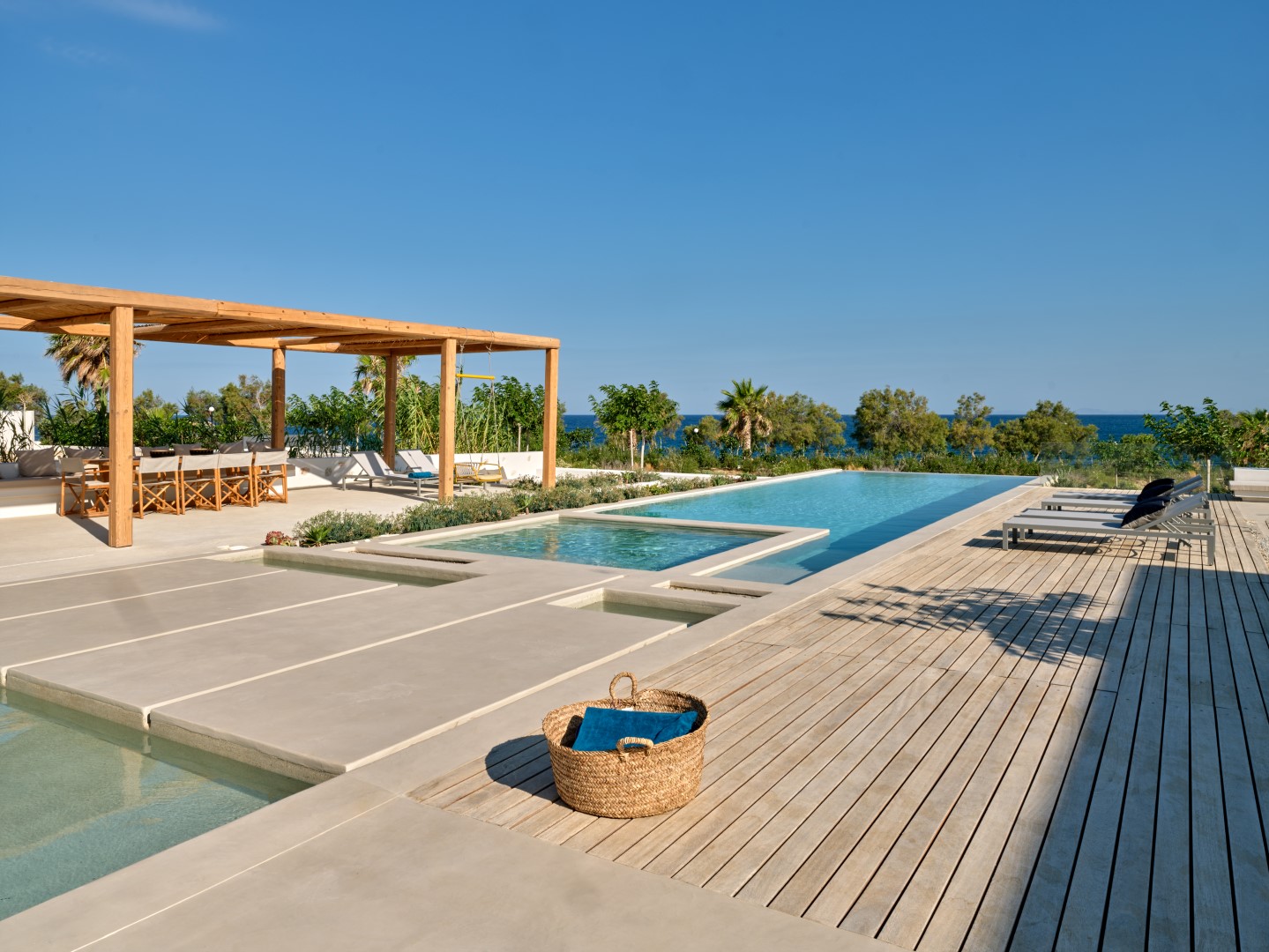 Villa Eloise’s outdoor spaces truly distinguish this property from the ordinary. The showstopping infinity pool with dedicated baby section and bubbling fountain creates a mesmerizing focal point, complemented by a relaxing jacuzzi. Multiple pergola-shaded areas offer diverse settings for conversation or contemplation, while the outdoor kitchen/bar and professional BBQ setup invite culinary adventures under the stars. Perhaps most uniquely, the property features an outdoor cinema and fireplace—creating magical evening experiences against the backdrop of the Aegean.