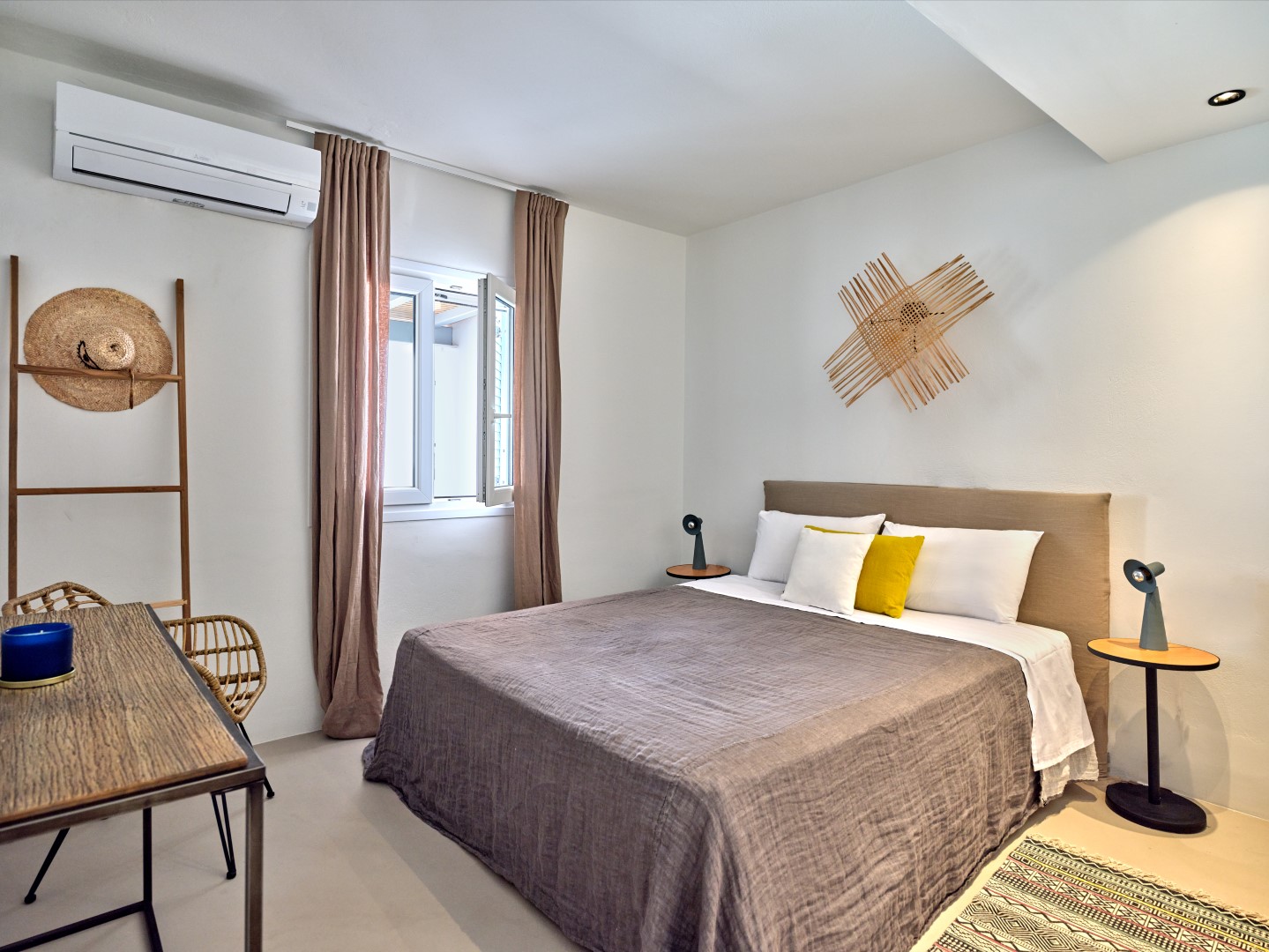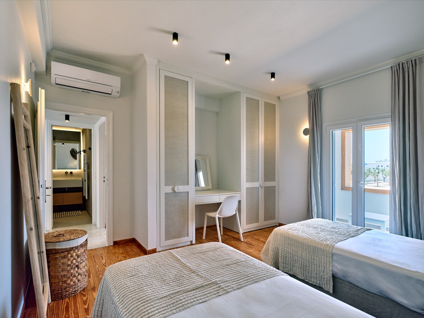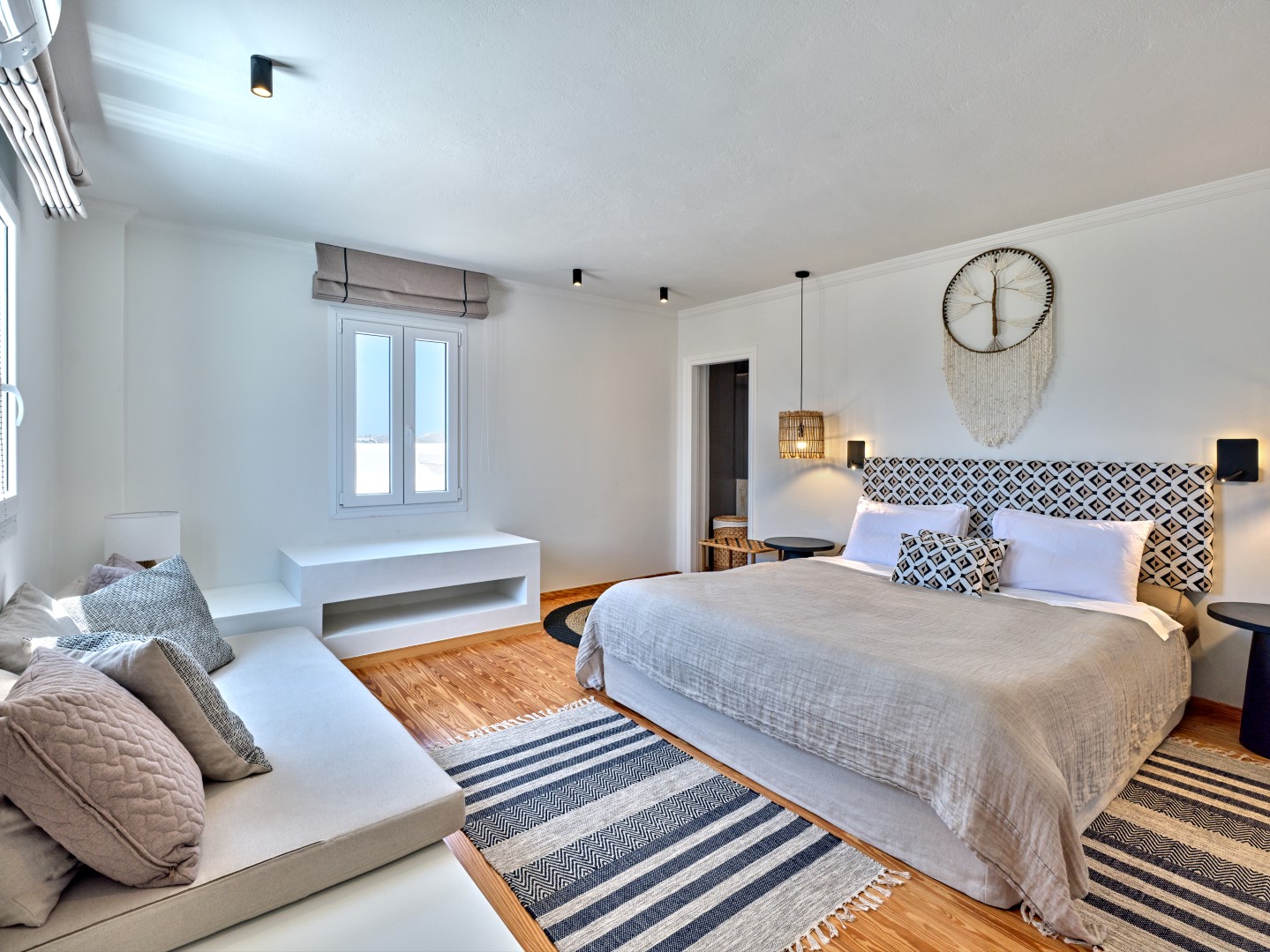 The villa unfolds as a collection of elegant spaces, beginning with a grand main residence featuring a spacious lobby, sumptuous living area with 72″ Smart TV, and sophisticated dining space with sea-view balcony. The upper level houses the spectacular master suite with private rooftop terrace—ideal for watching Paros’ legendary sunsets—alongside additional bedrooms with shared balconies. A charming attached apartment with separate access adds versatility, while three independent guest houses and a family room ensure privacy for all.
