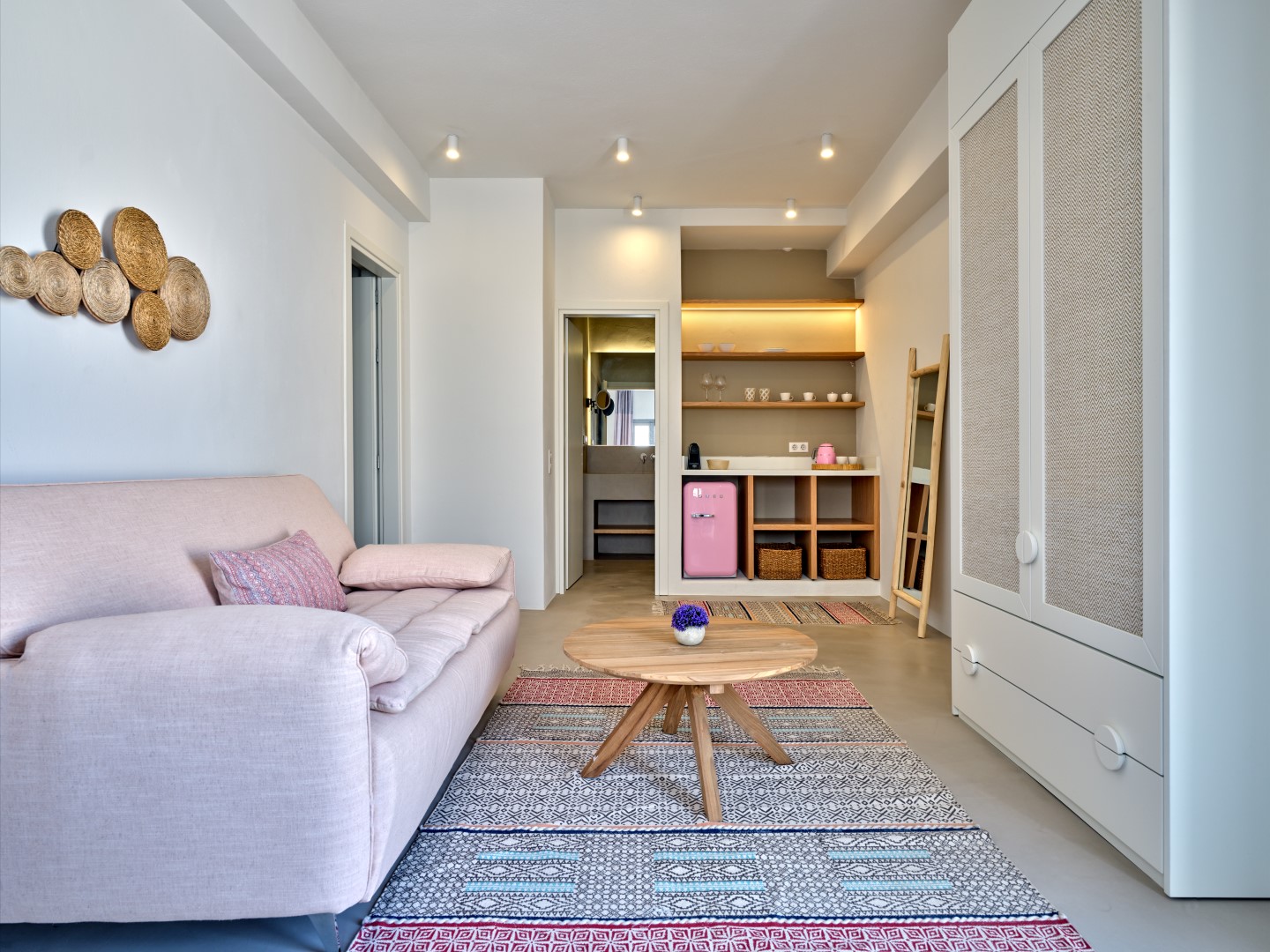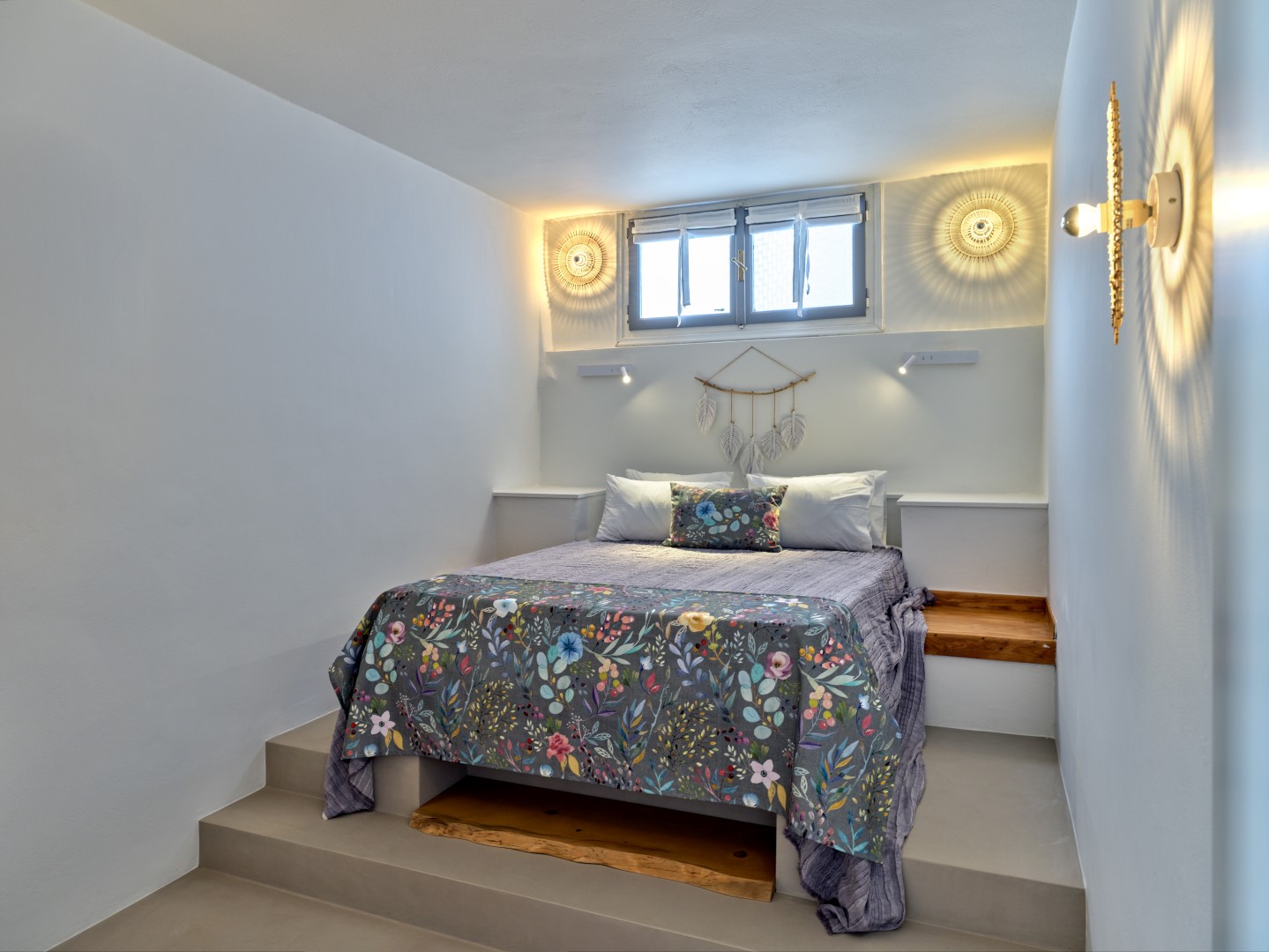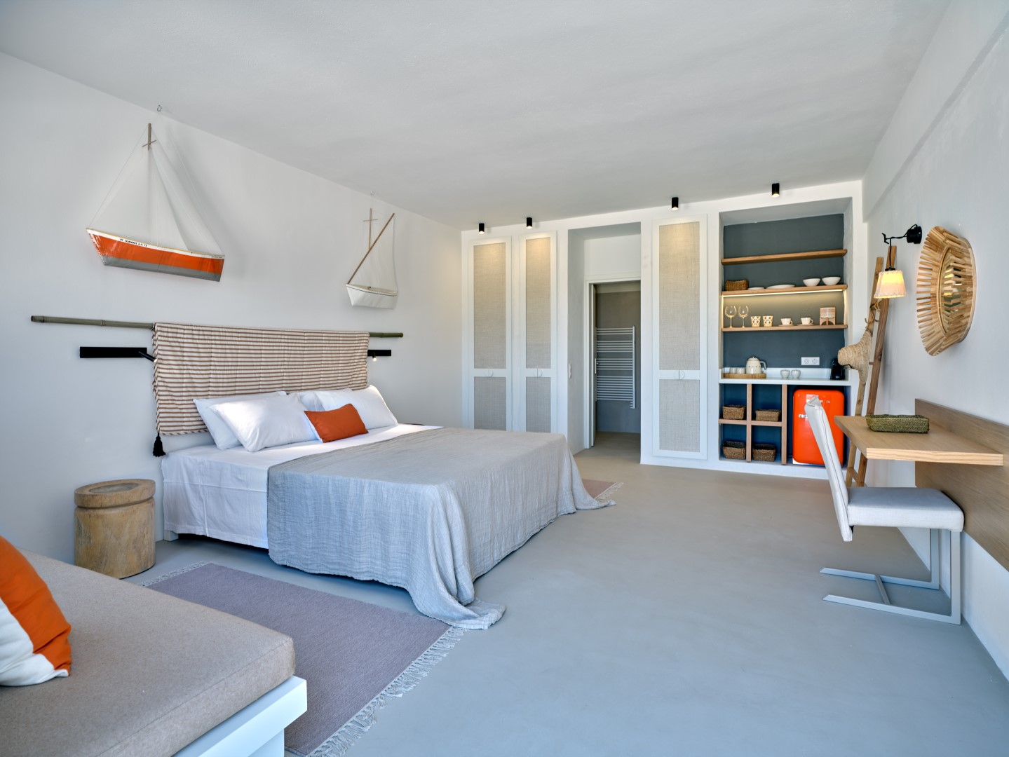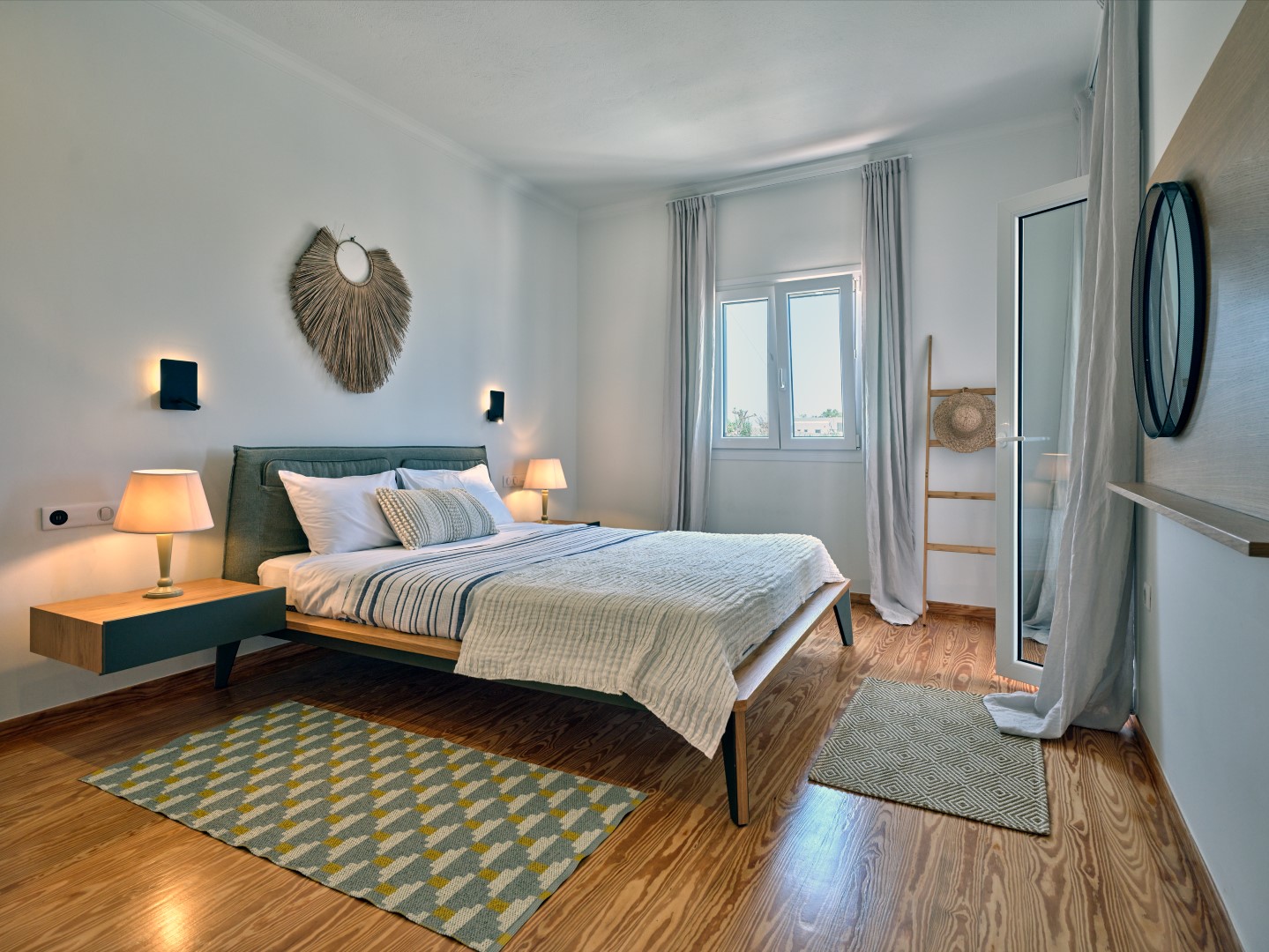 The villa unfolds as a collection of elegant spaces, beginning with a grand main residence featuring a spacious lobby, sumptuous living area with 72″ Smart TV, and sophisticated dining space with sea-view balcony. The upper level houses the spectacular master suite with private rooftop terrace—ideal for watching Paros’ legendary sunsets—alongside additional bedrooms with shared balconies. A charming attached apartment with separate access adds versatility, while three independent guest houses and a family room ensure privacy for all.