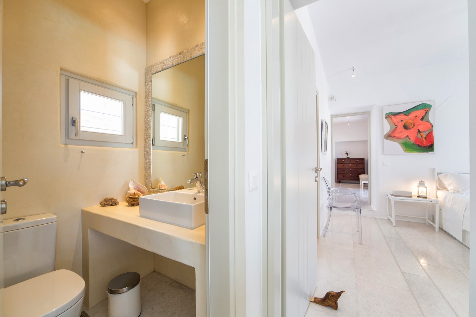 Villa Eos is a captivating 145 sq.m. holiday retreat built in 2016, perched on the hillside of Tzanes in the Golden Beach area with spectacular views of the Aegean Sea and neighboring Cycladic islands. This charming villa accommodates up to 10 guests across 5 bedrooms and features a stunning 12×4.5m infinity-edge swimming pool that appears to merge with the sea beyond. Just an 8-minute drive from the endless sandy shores of Golden Beach, Villa Eos combines traditional Cycladic architectural style with contemporary comforts across three thoughtfully designed levels.