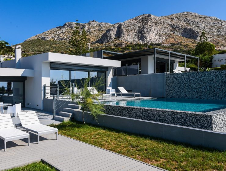 The villa consists of four buildings, the main villa plus 3 guest houses. The interior decoration is minimal while most of the furniture of both the main villa and guest houses are built-in, bringing out the Cycladic element. The villa also features a smart house operating system where one can monitor everything around the house simply by using his cell phone.