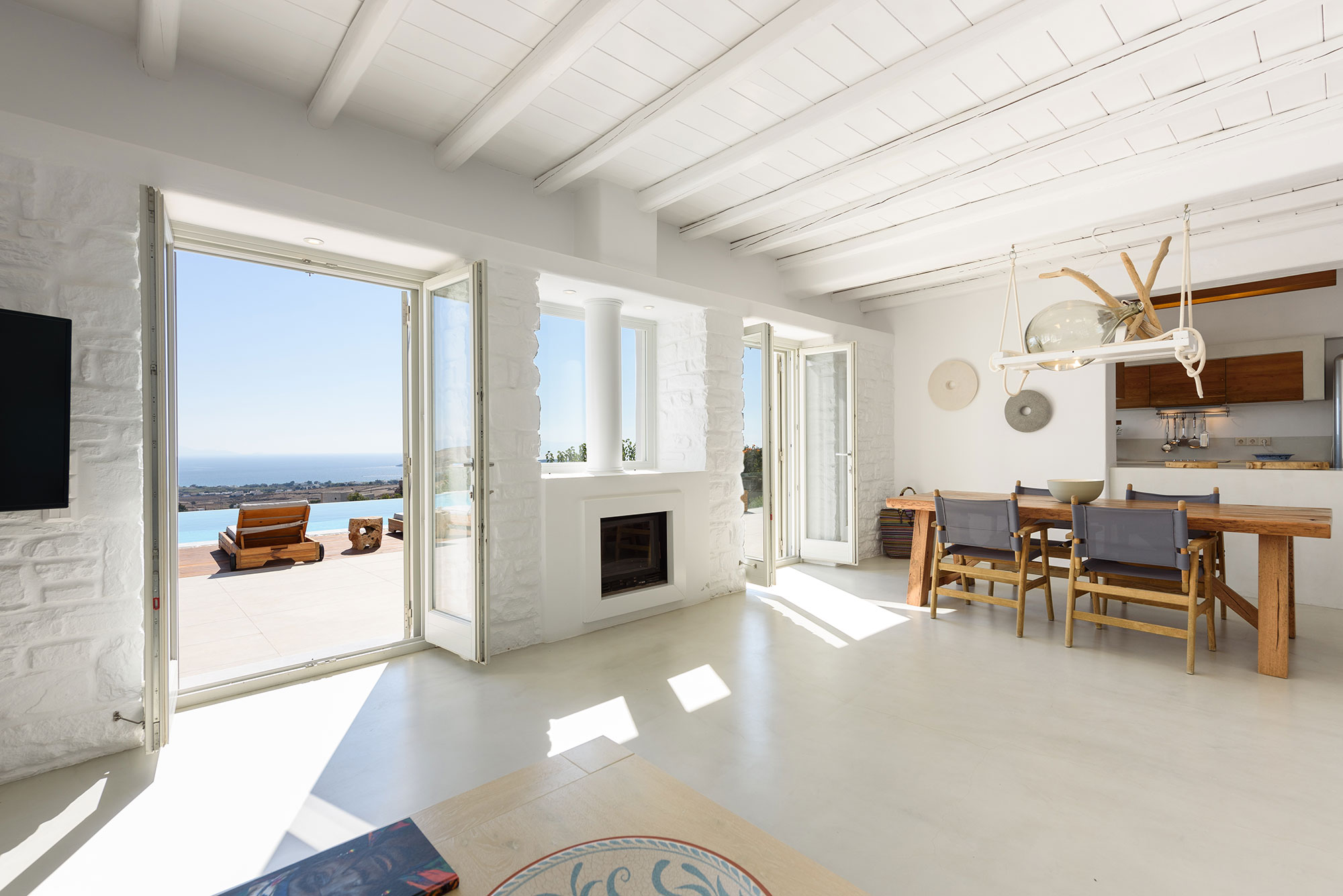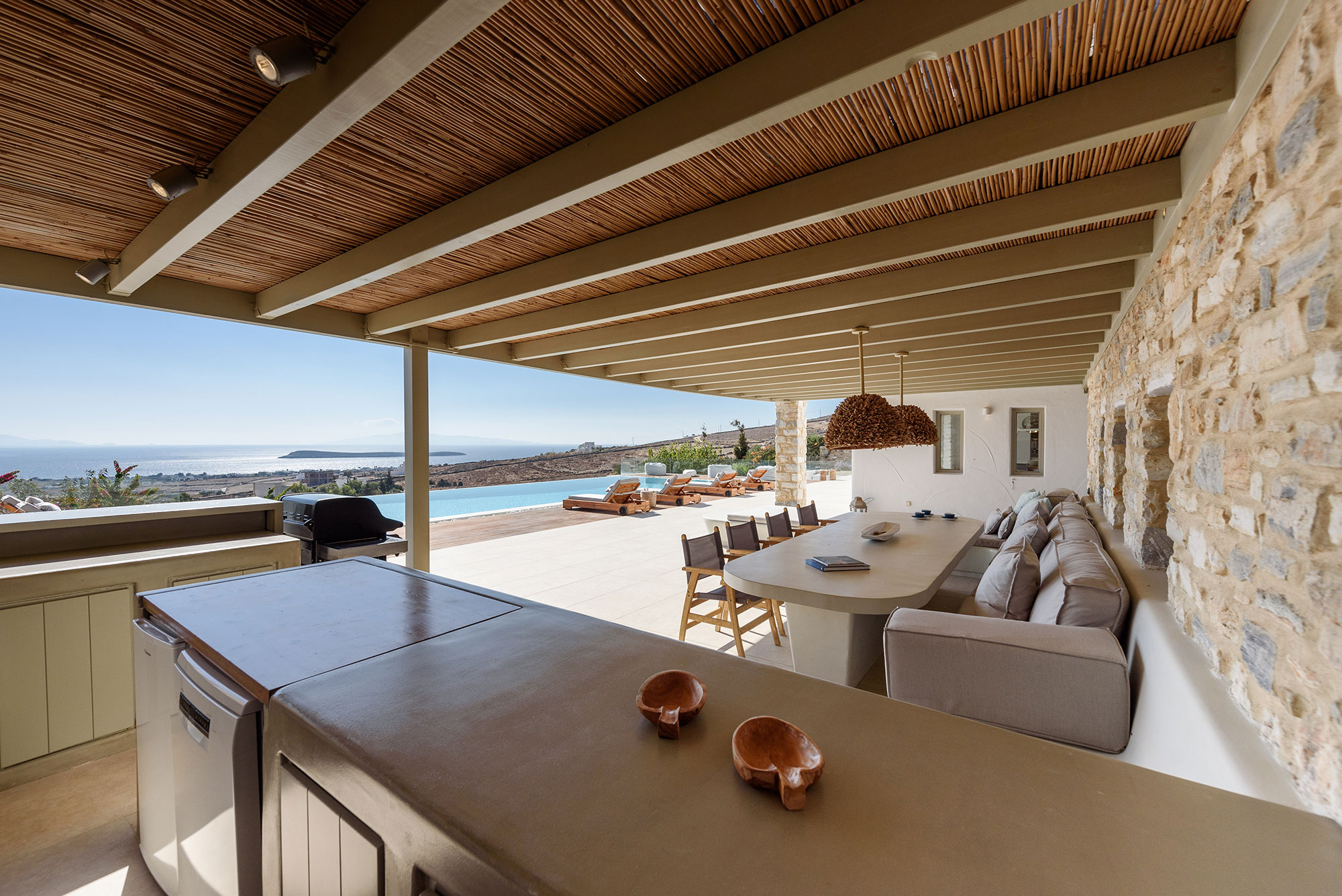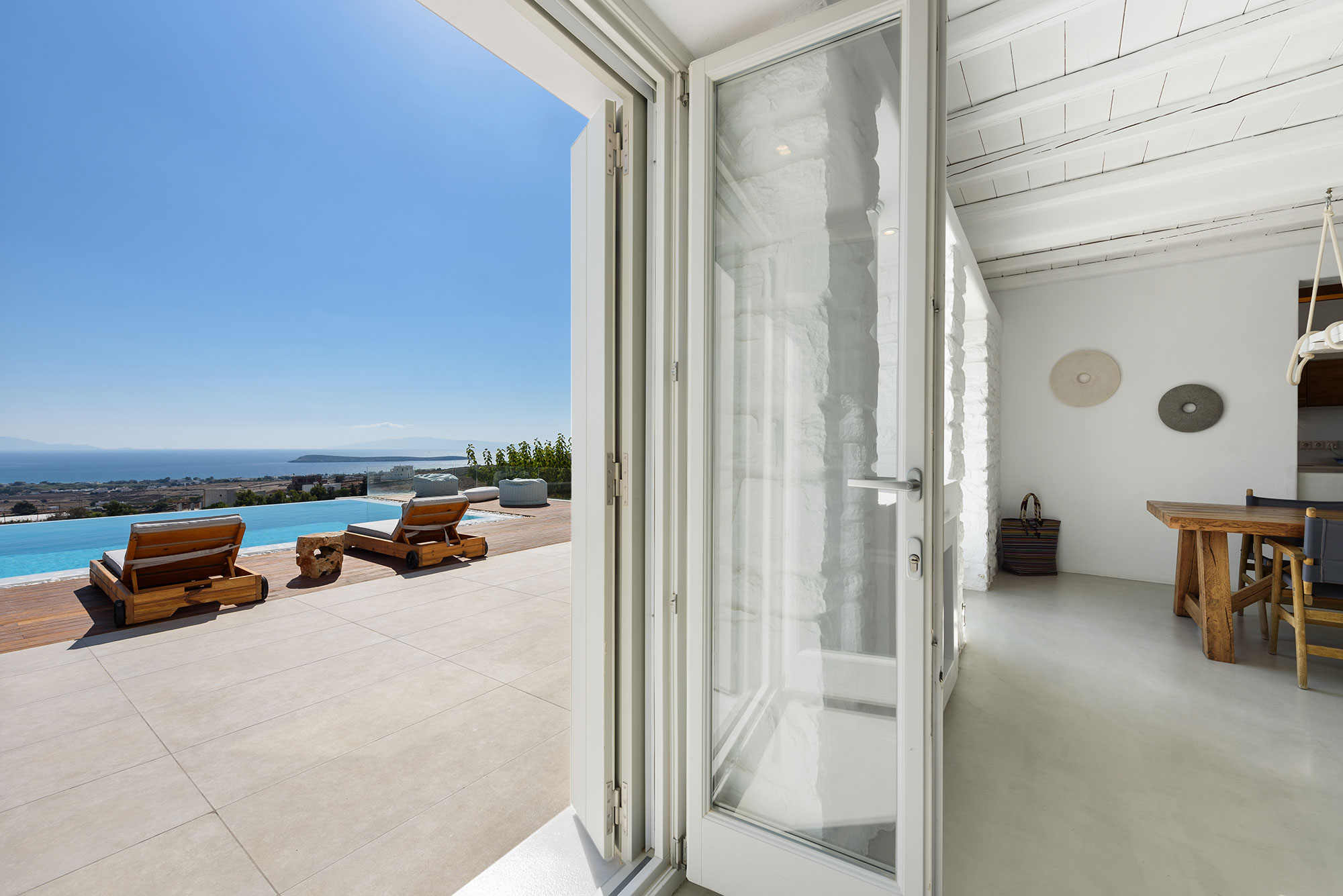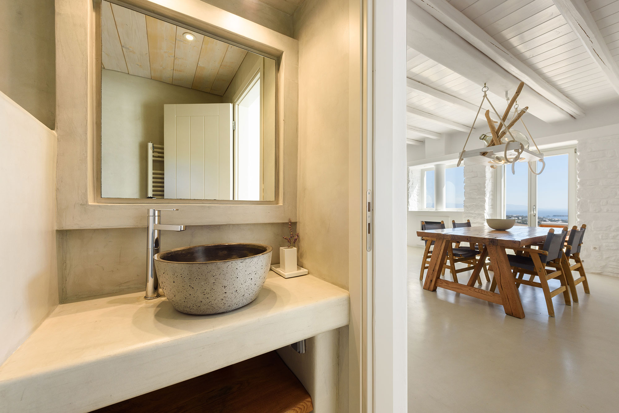 Spanning three thoughtfully designed levels, Villa Lenora accommodates eight guests in sublime comfort. The ground level unfolds into a luminous living space where plush sofas invite contemplation before the dramatic sea views. The bespoke wooden dining table, illuminated by an artful pendant light, sets the stage for memorable gatherings, while the open-plan kitchen blends earthy wood tones with sleek concrete—a testament to the villa’s sophisticated design ethos.