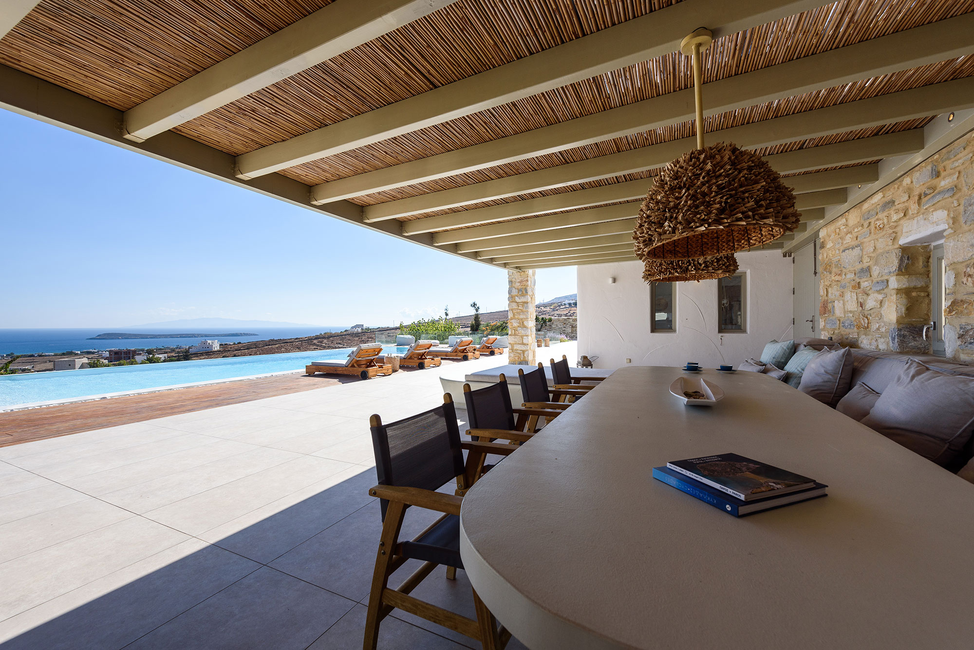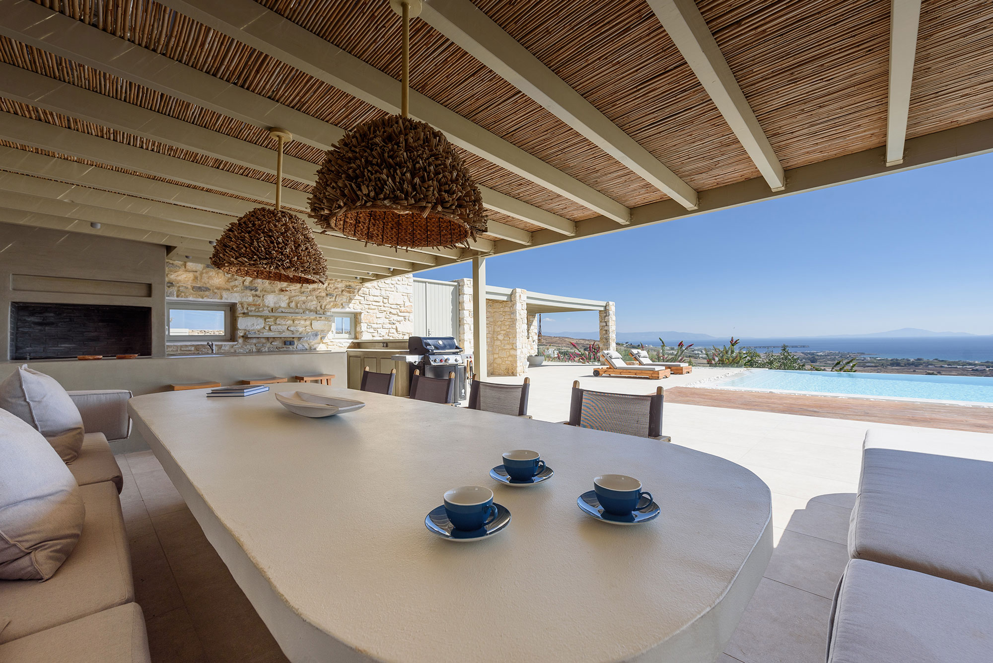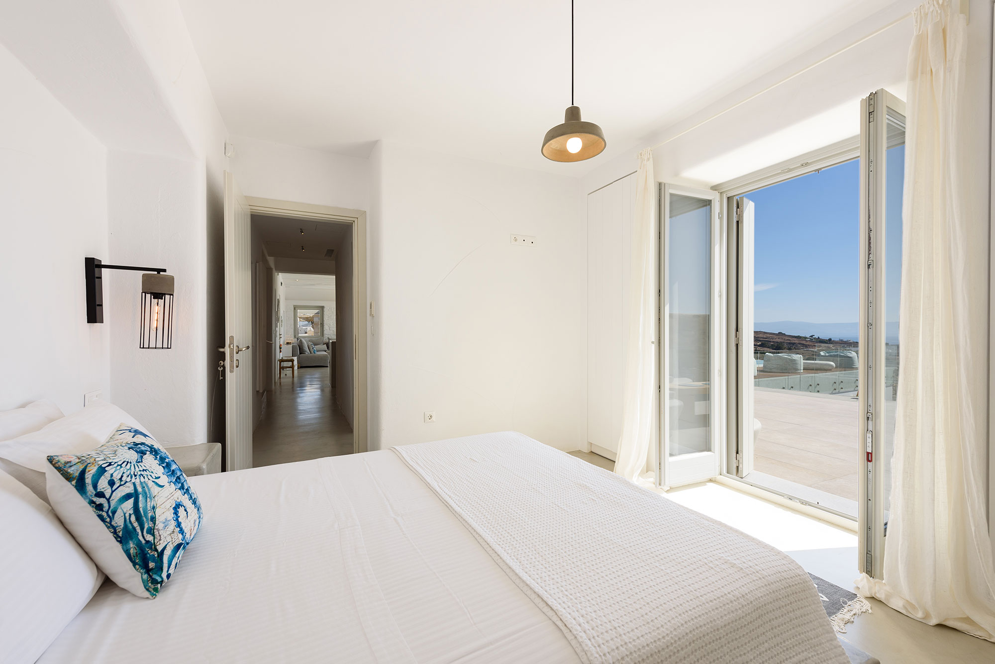 Spanning three thoughtfully designed levels, Villa Lenora accommodates eight guests in sublime comfort. The ground level unfolds into a luminous living space where plush sofas invite contemplation before the dramatic sea views. The bespoke wooden dining table, illuminated by an artful pendant light, sets the stage for memorable gatherings, while the open-plan kitchen blends earthy wood tones with sleek concrete—a testament to the villa’s sophisticated design ethos.