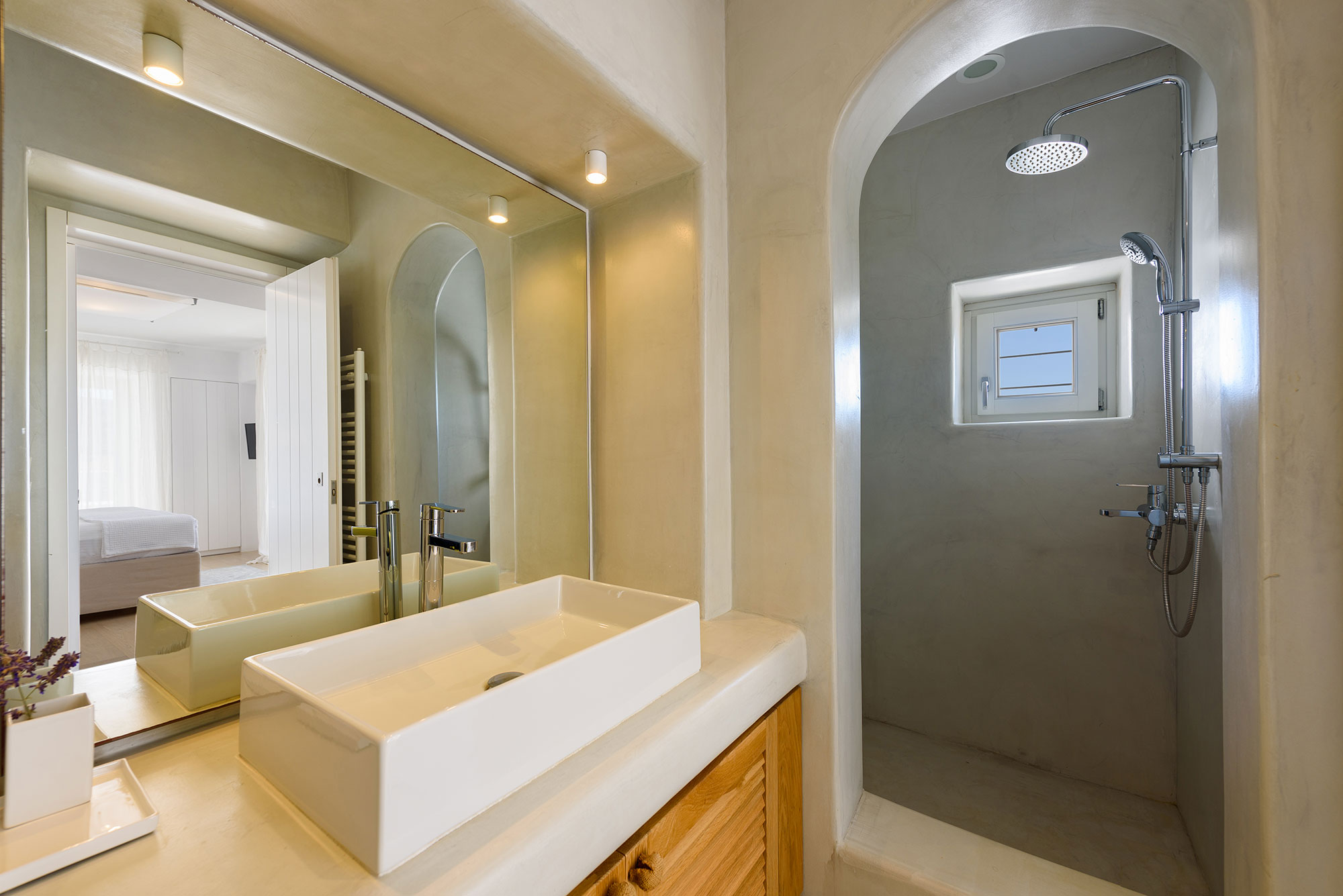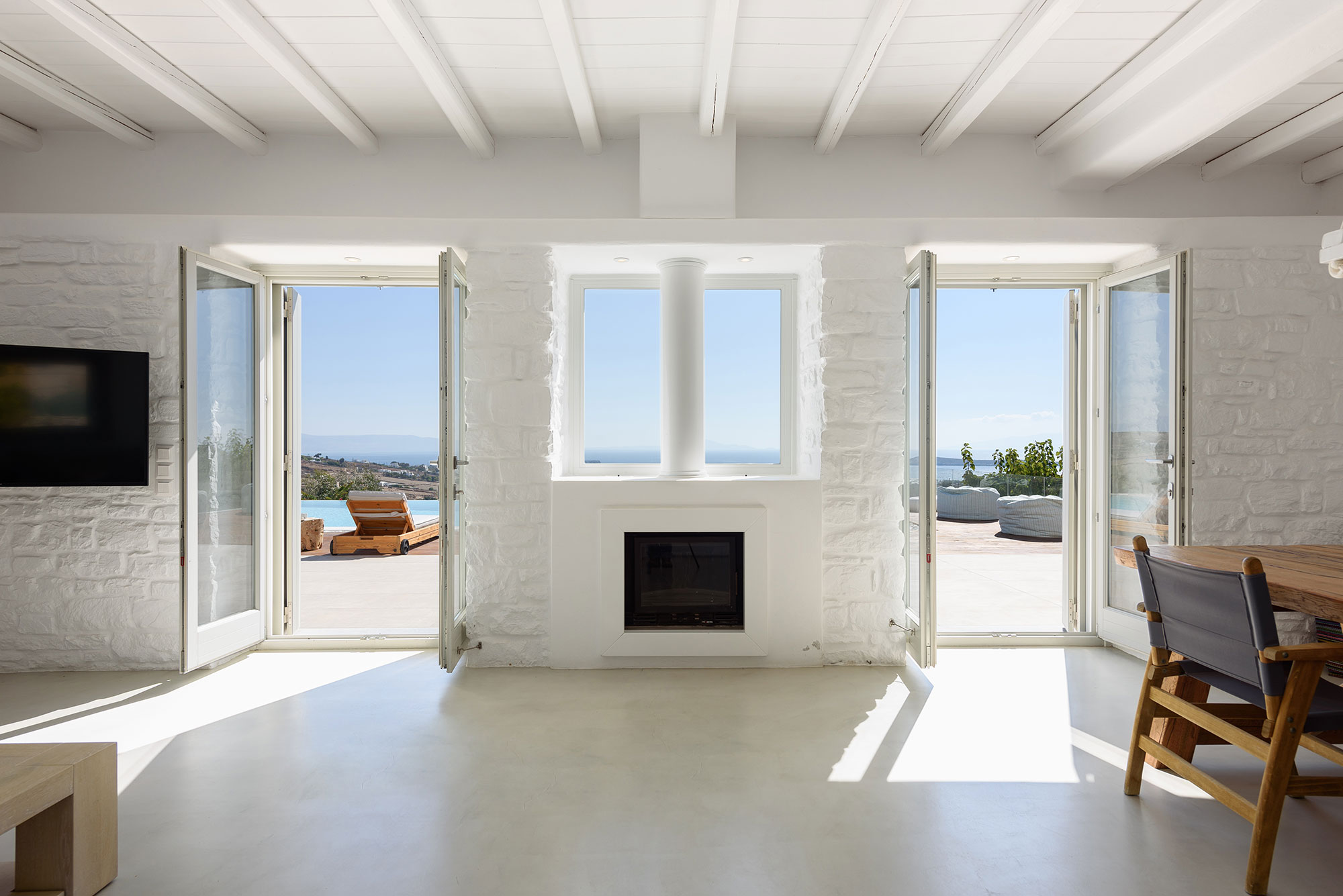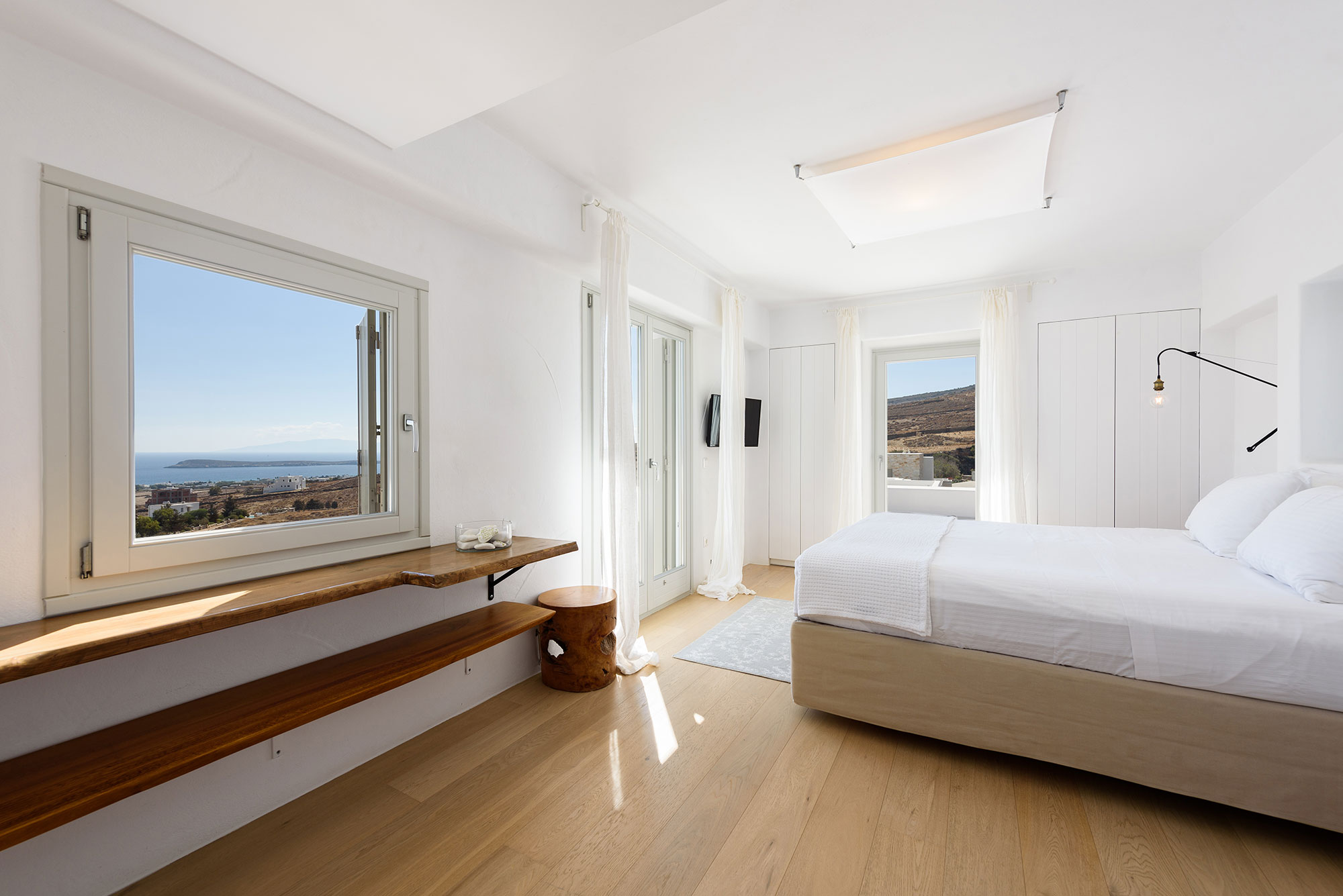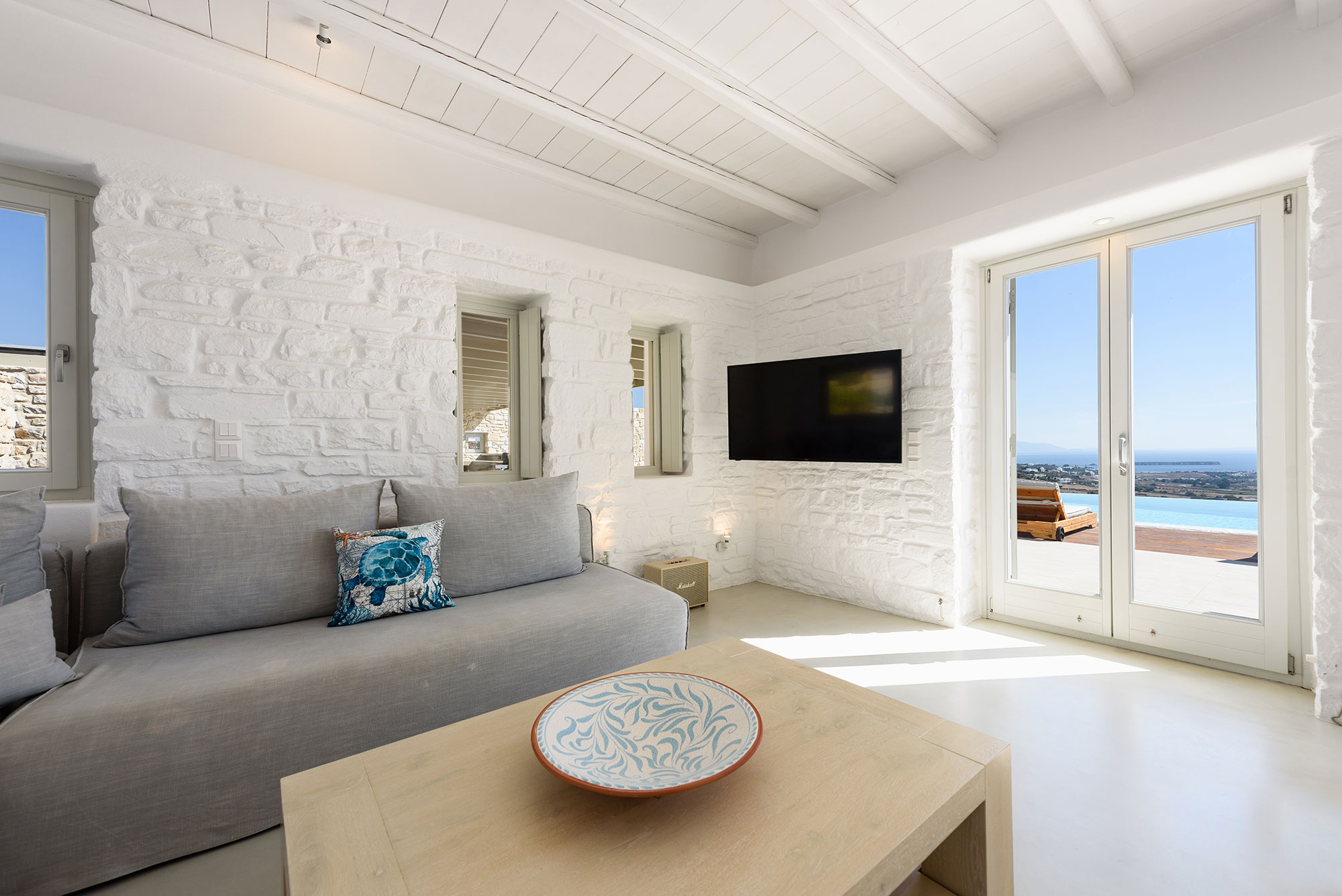Spanning three thoughtfully designed levels, Villa Lenora accommodates eight guests in sublime comfort. The ground level unfolds into a luminous living space where plush sofas invite contemplation before the dramatic sea views. The bespoke wooden dining table, illuminated by an artful pendant light, sets the stage for memorable gatherings, while the open-plan kitchen blends earthy wood tones with sleek concrete—a testament to the villa’s sophisticated design ethos.