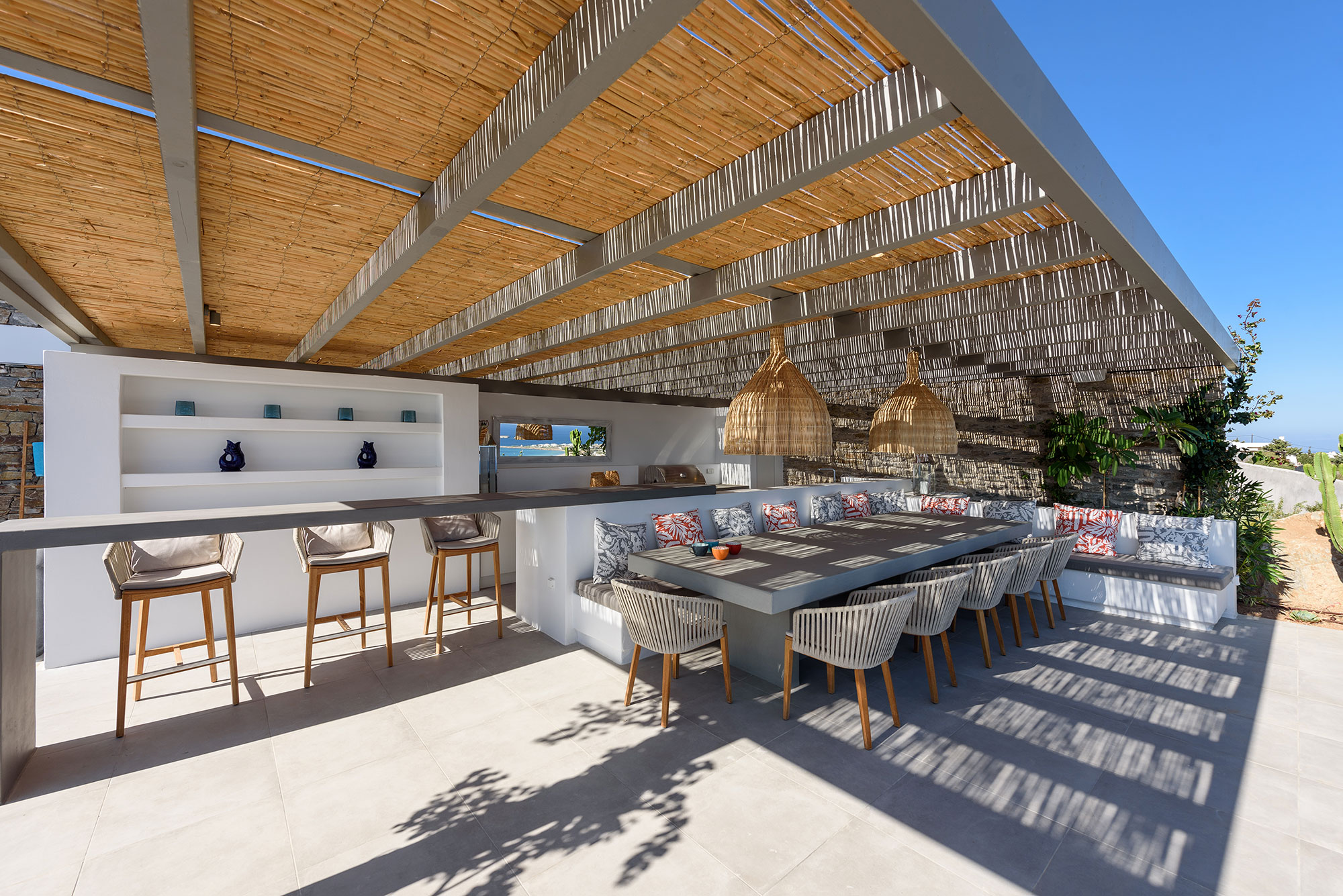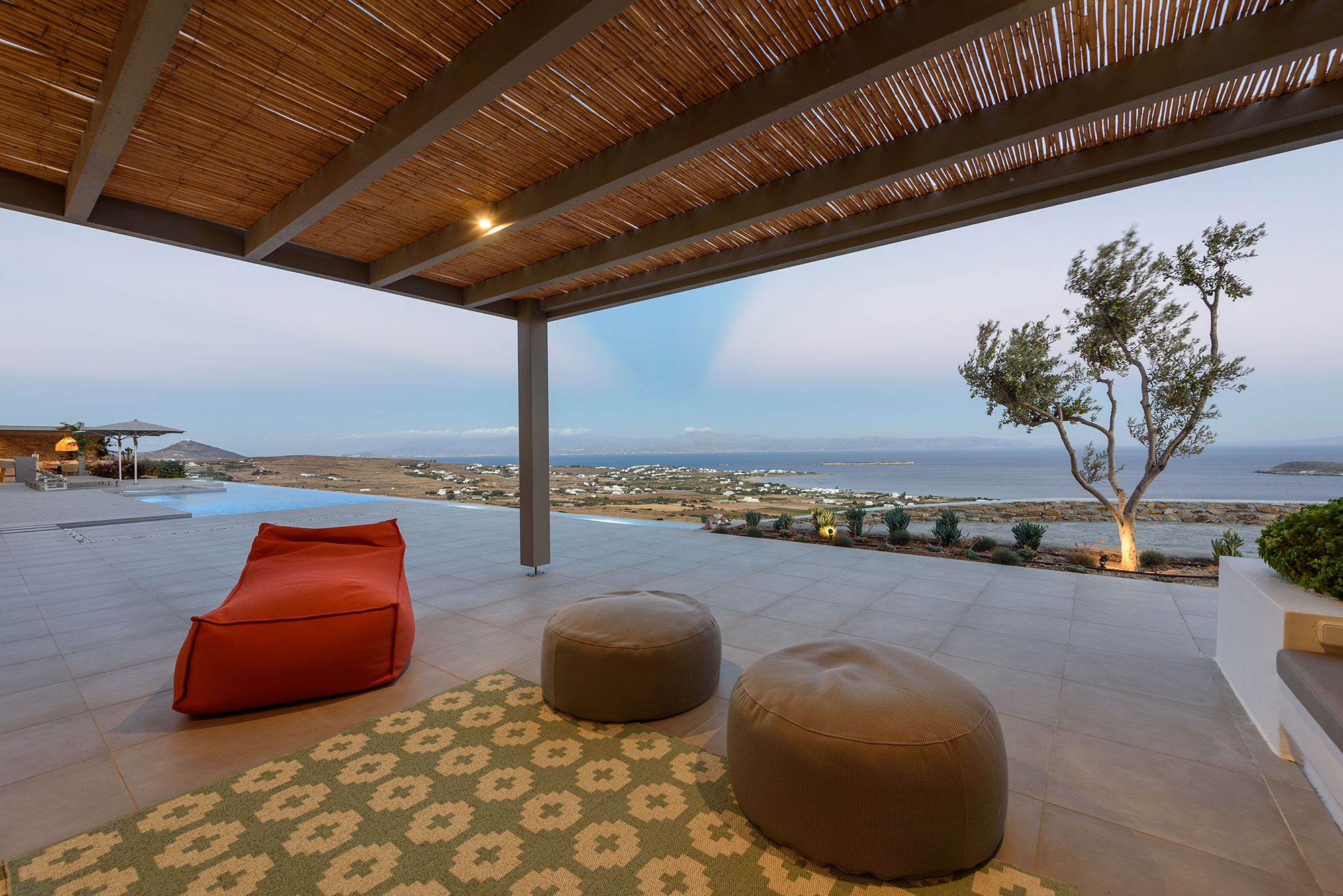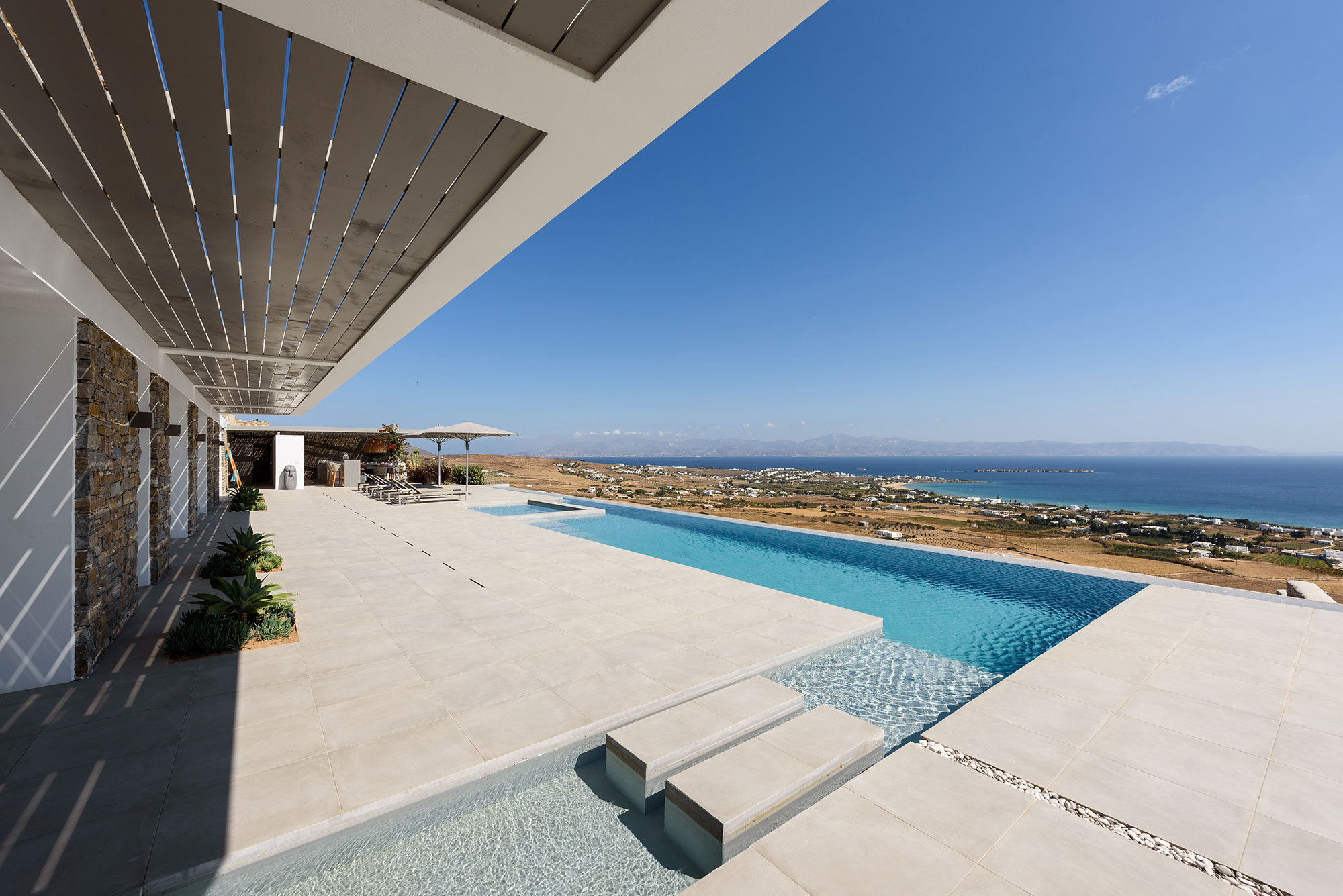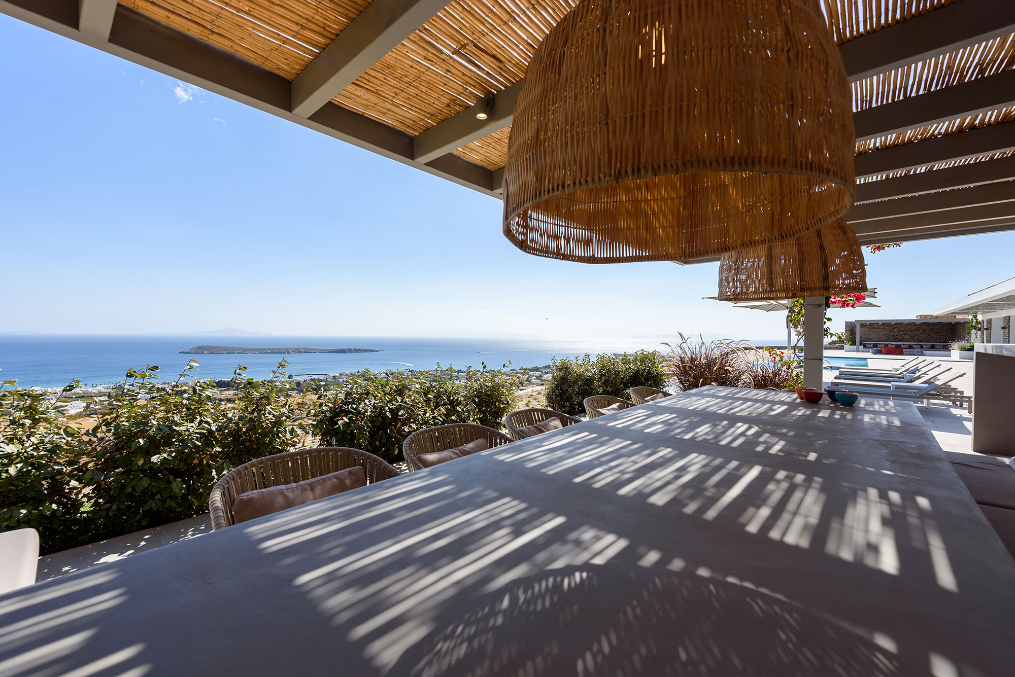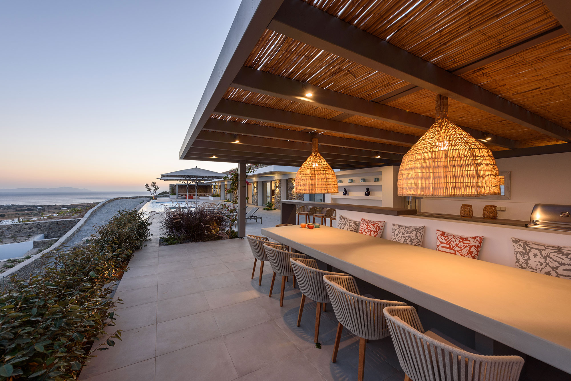 Eight guests find sublime accommodation in four en-suite bedrooms, each showcasing cutting-edge boho design. The striking infinity-edge lap pool—featuring a blissful water-massage spot—appears to merge with the horizon, while multiple pergola-shaded areas with clean-lined built-in sofas invite leisurely contemplation or animated conversation.