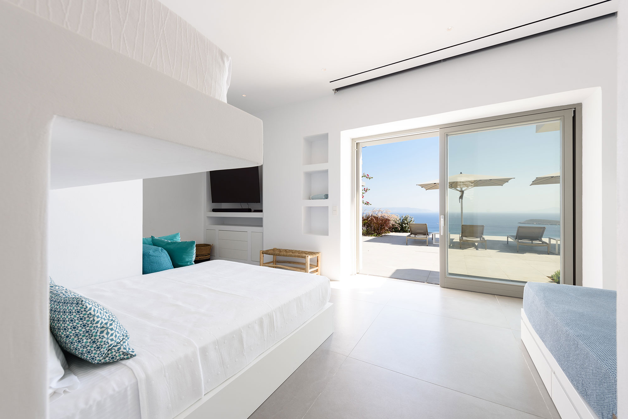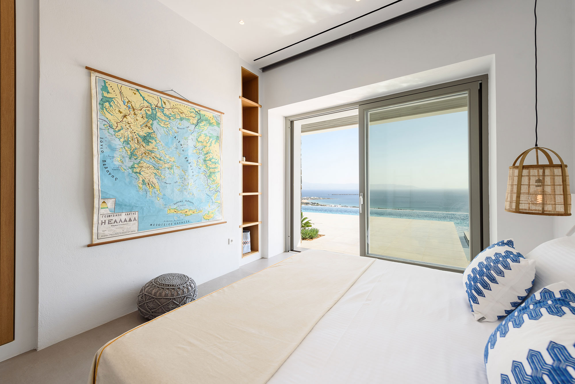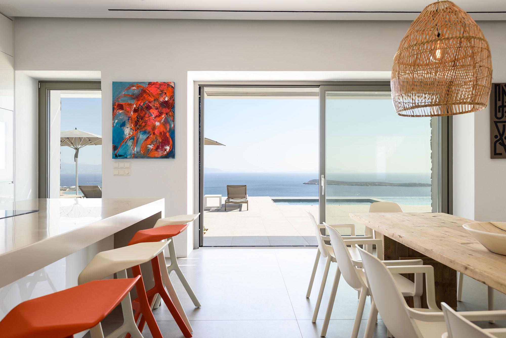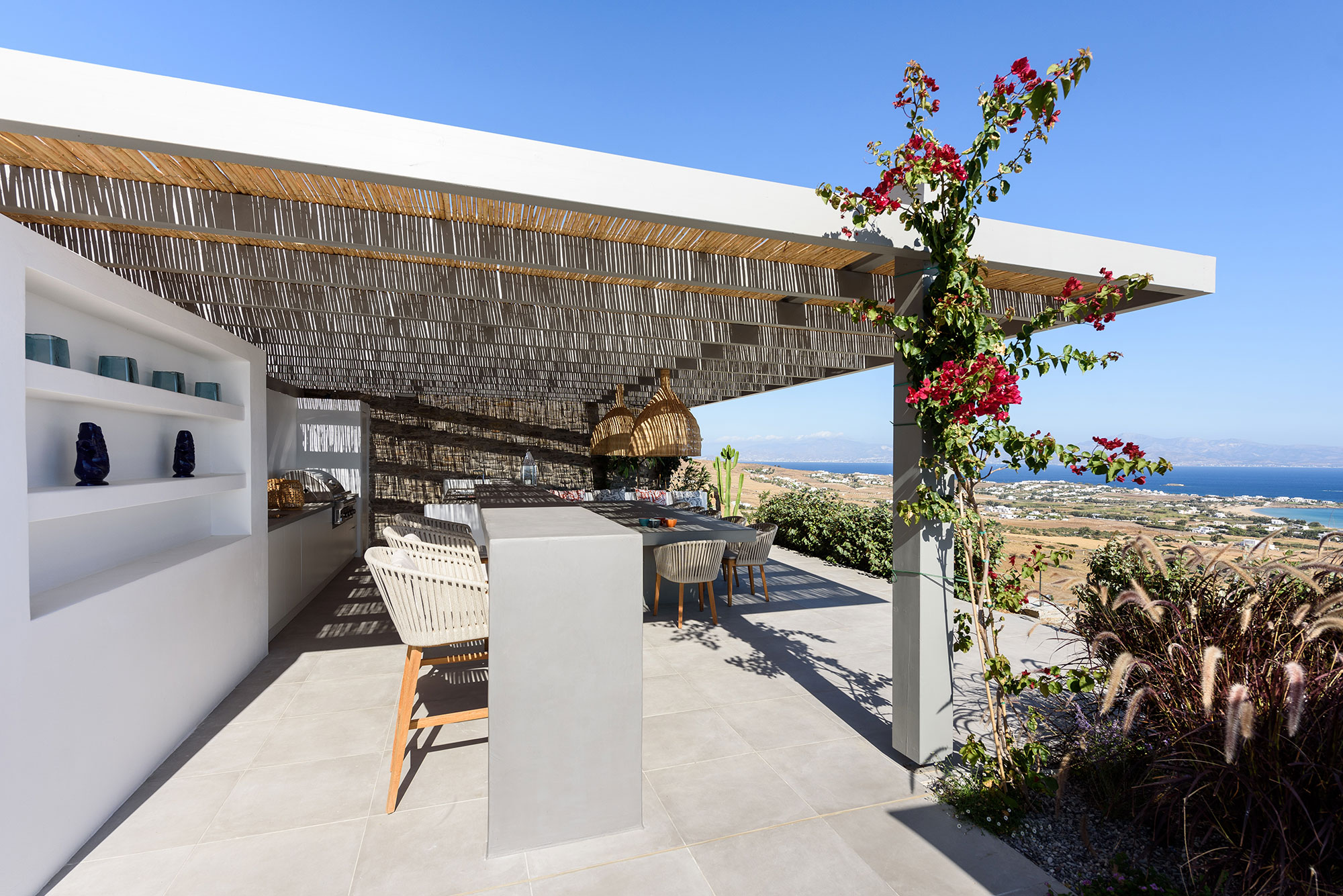 Eight guests find sublime accommodation in four en-suite bedrooms, each showcasing cutting-edge boho design. The striking infinity-edge lap pool—featuring a blissful water-massage spot—appears to merge with the horizon, while multiple pergola-shaded areas with clean-lined built-in sofas invite leisurely contemplation or animated conversation.