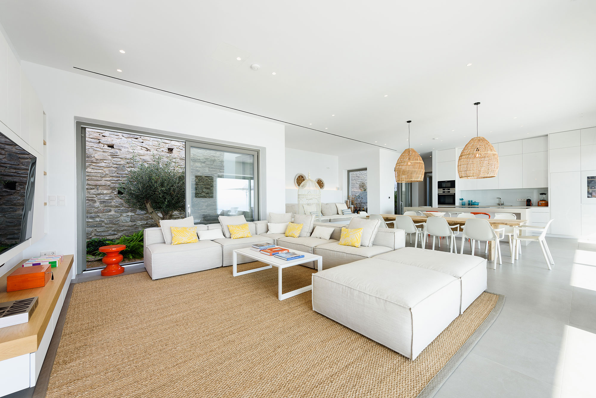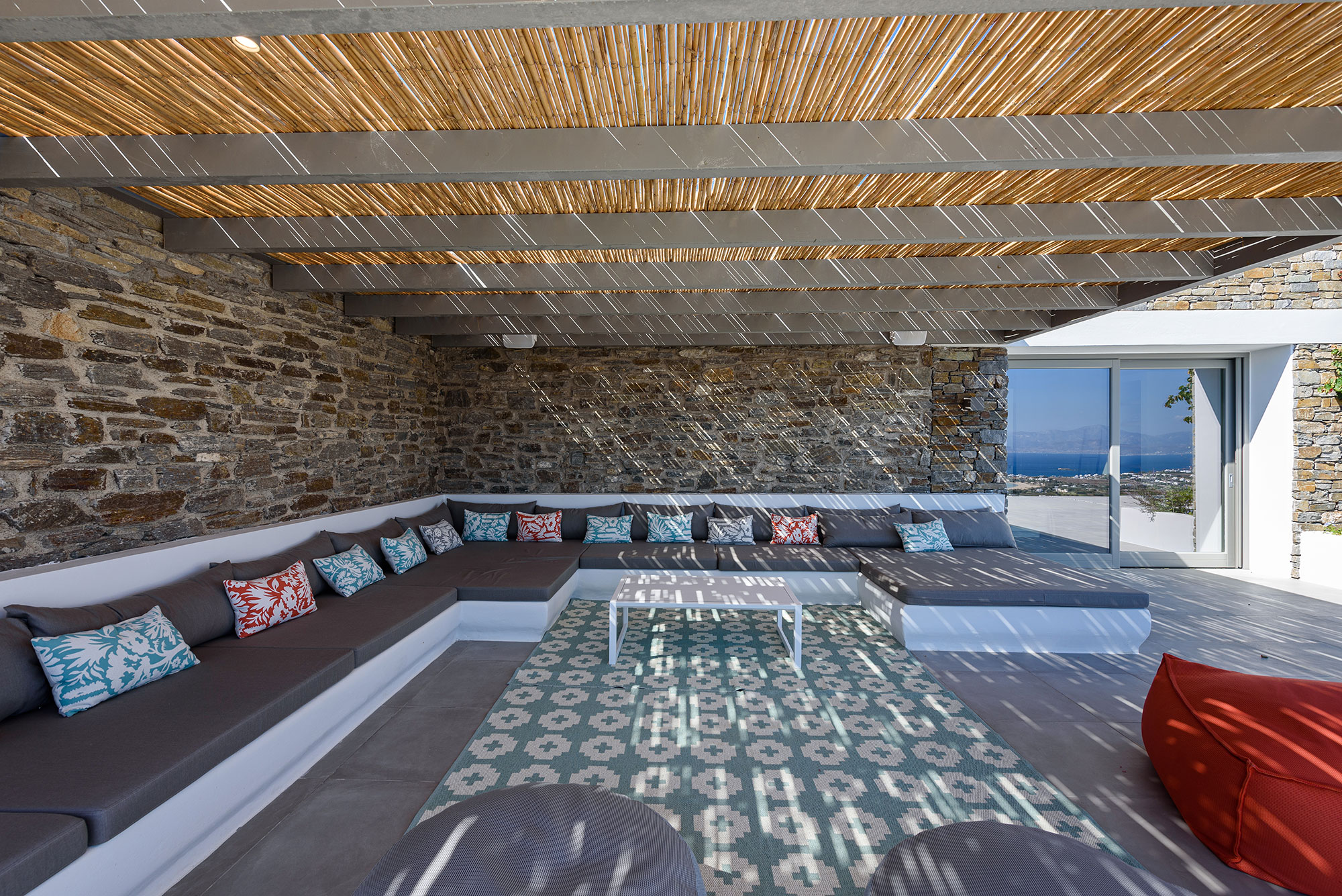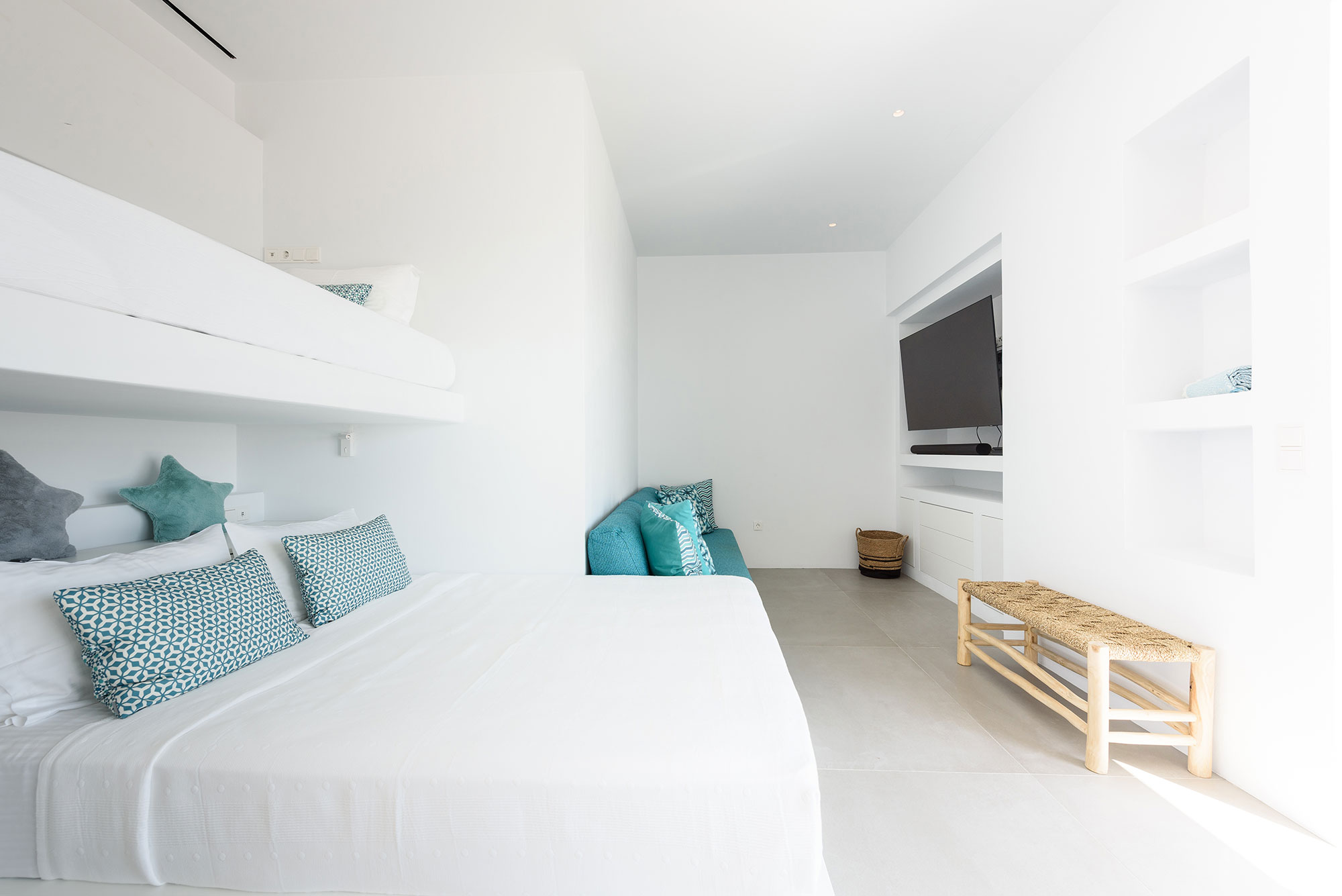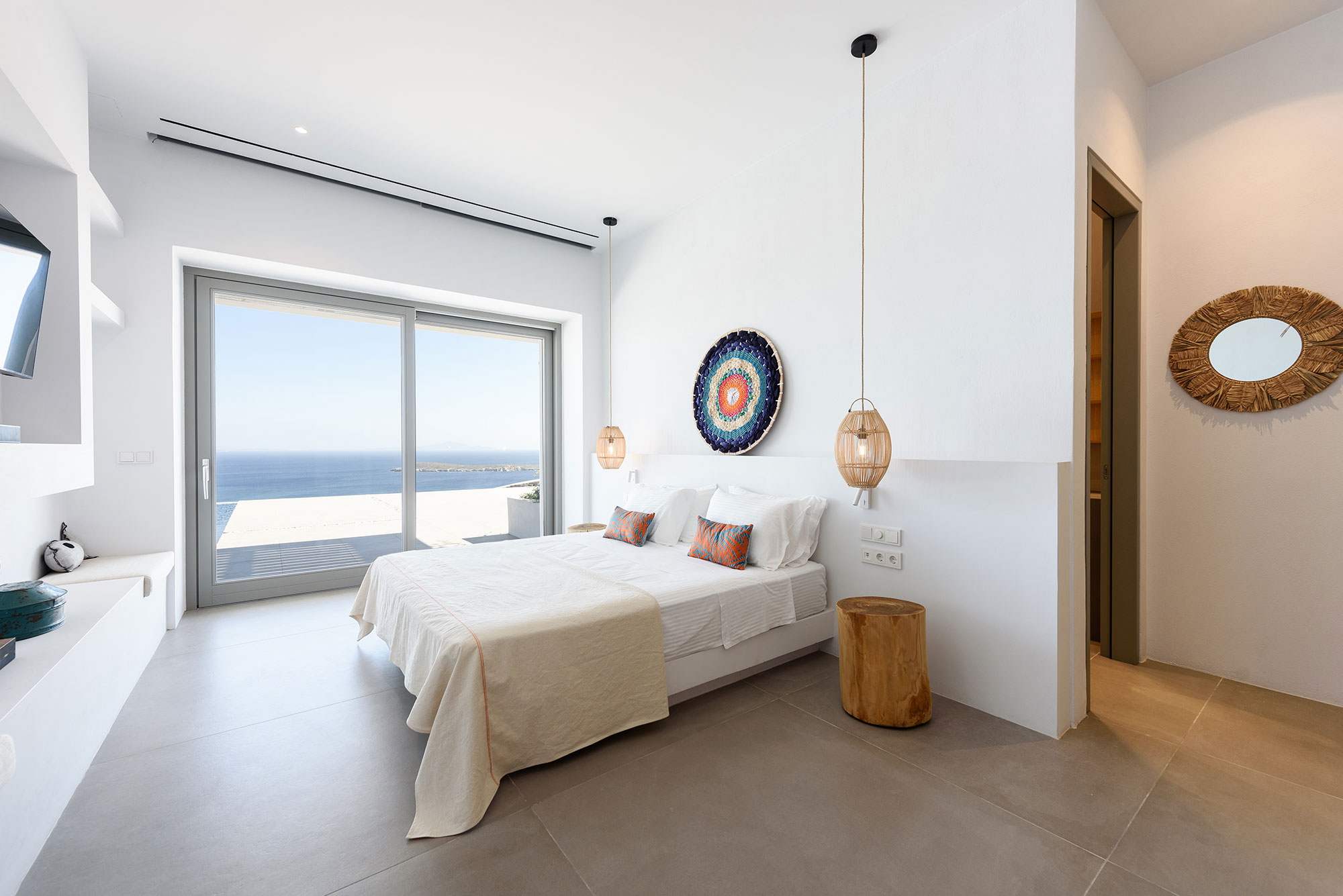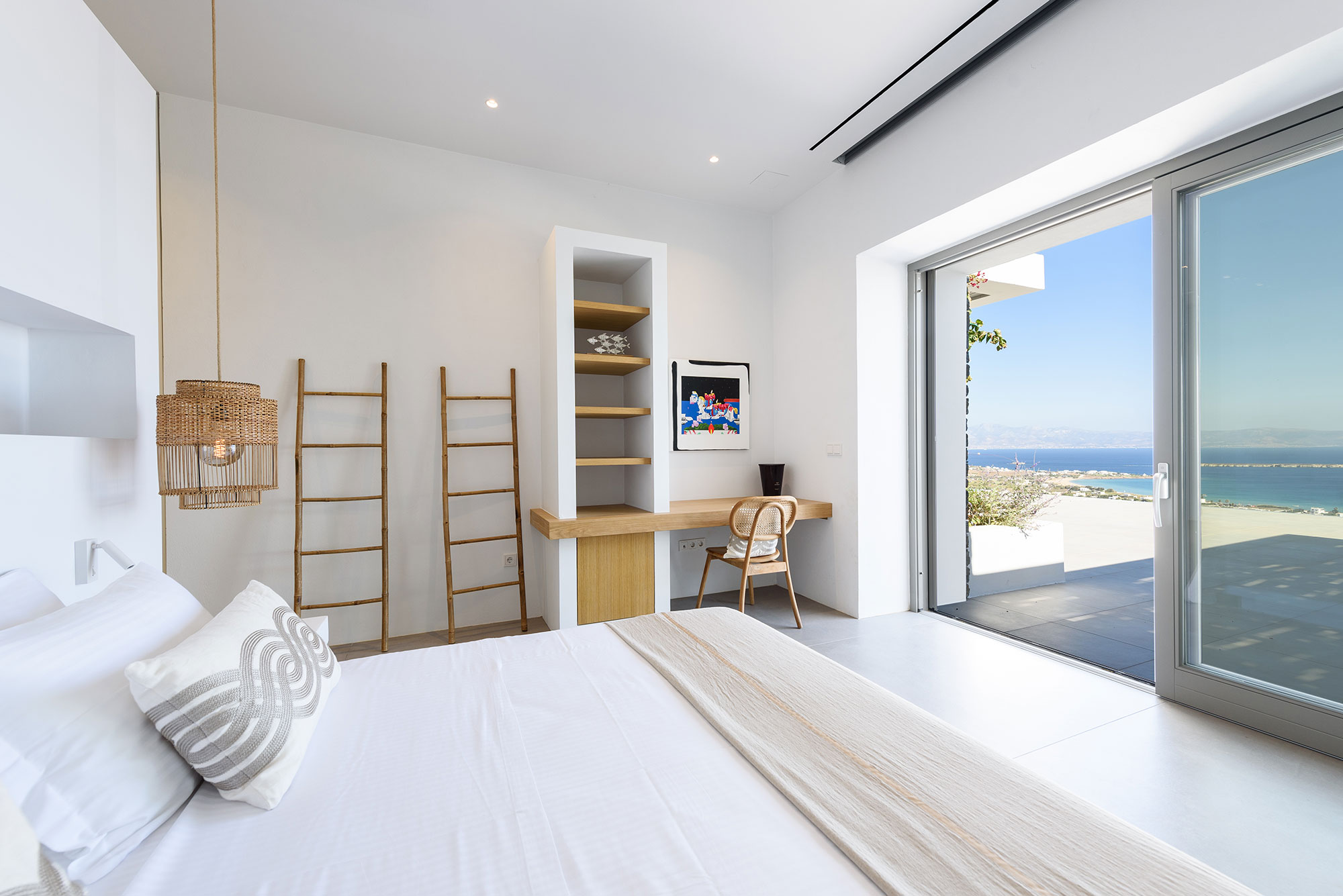 Eight guests find sublime accommodation in four en-suite bedrooms, each showcasing cutting-edge boho design. The striking infinity-edge lap pool—featuring a blissful water-massage spot—appears to merge with the horizon, while multiple pergola-shaded areas with clean-lined built-in sofas invite leisurely contemplation or animated conversation.