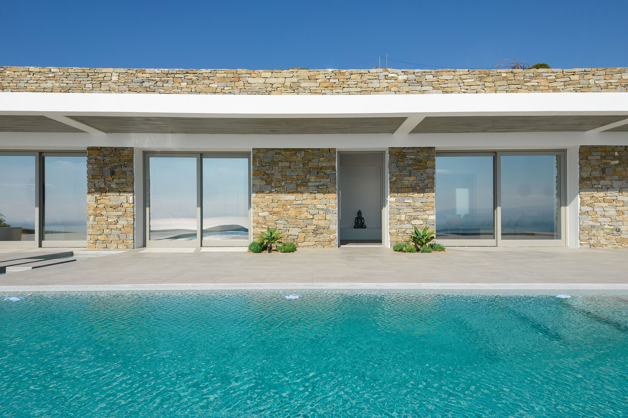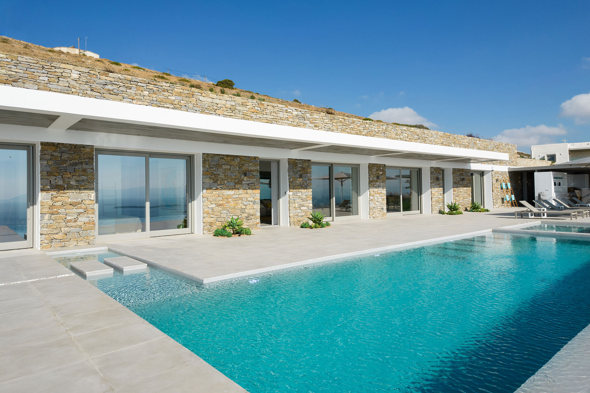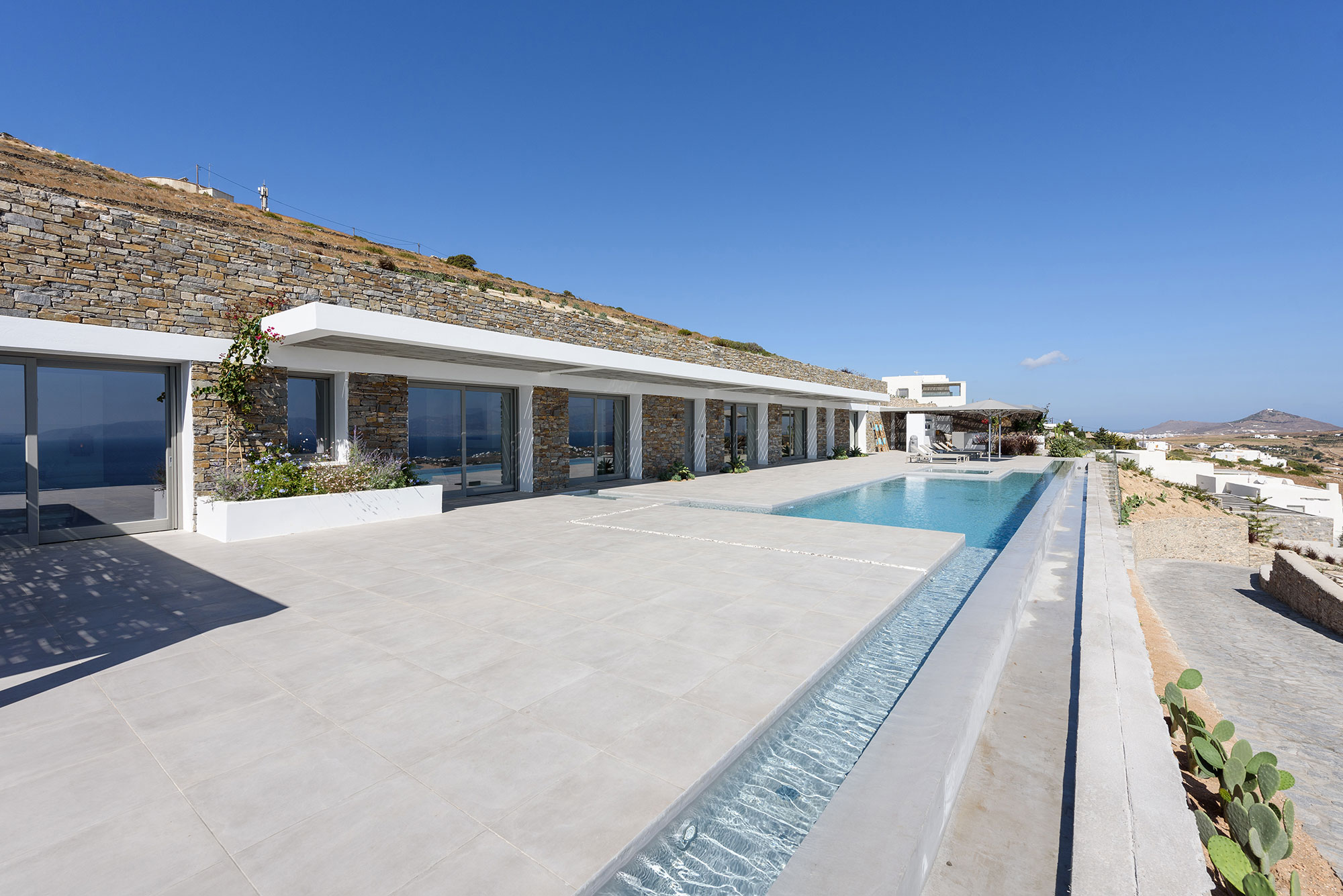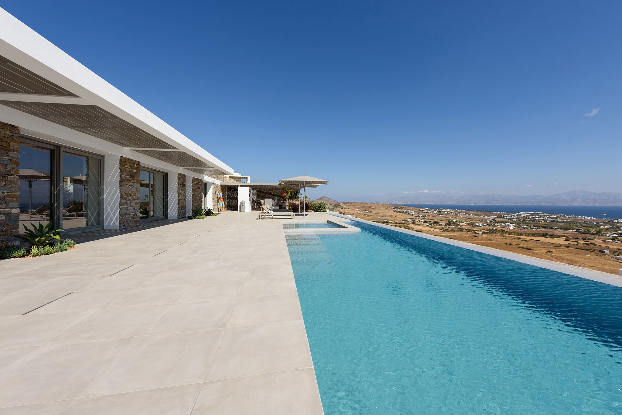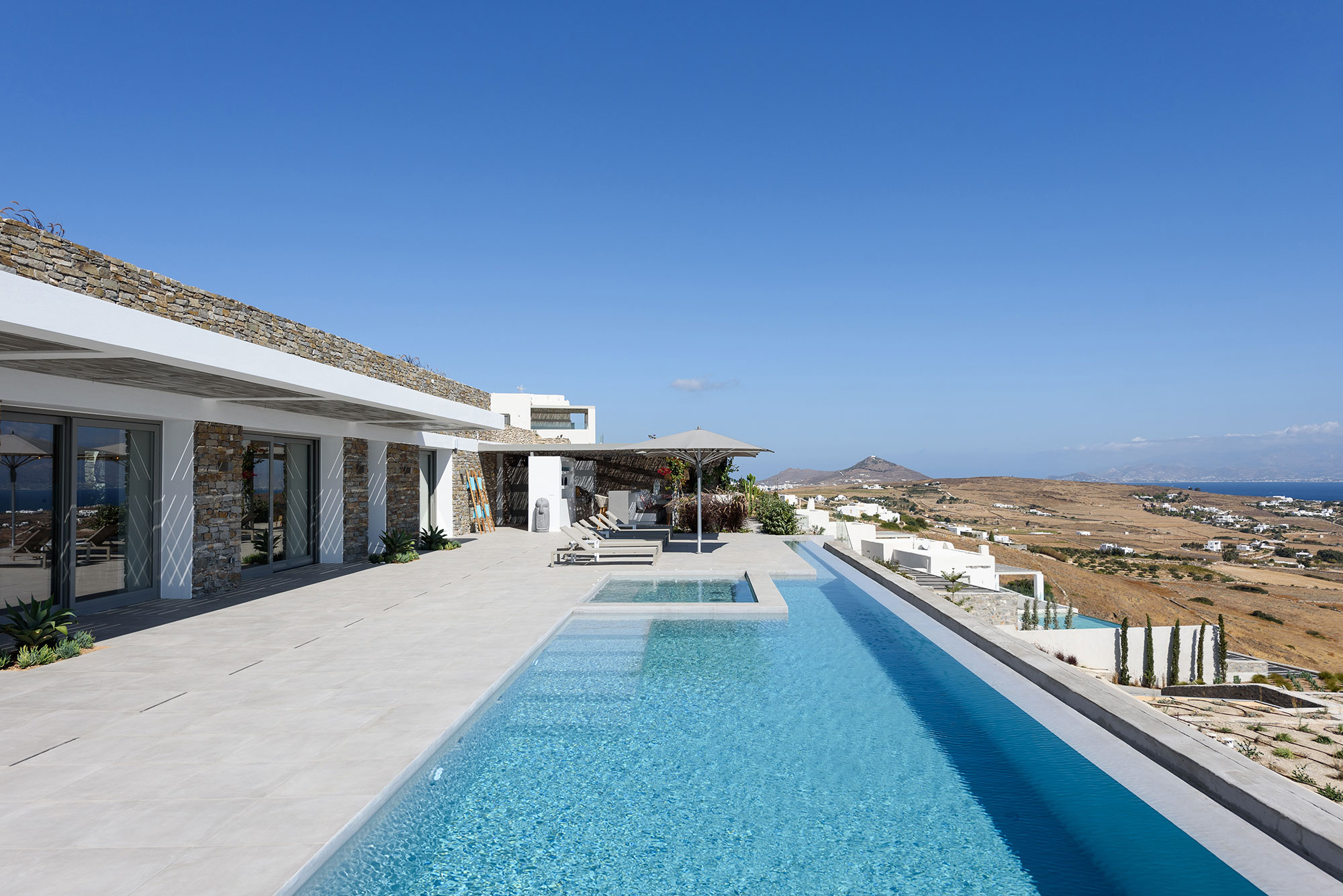 Discover Villa Lofos, a minimalist masterpiece emerging from the rugged terrain above Dryos in Golden Beach. This 320 sq.m single-level sanctuary artfully blends with its dramatic landscape while offering uninterrupted views across the Aegean to neighboring Cycladic islands.