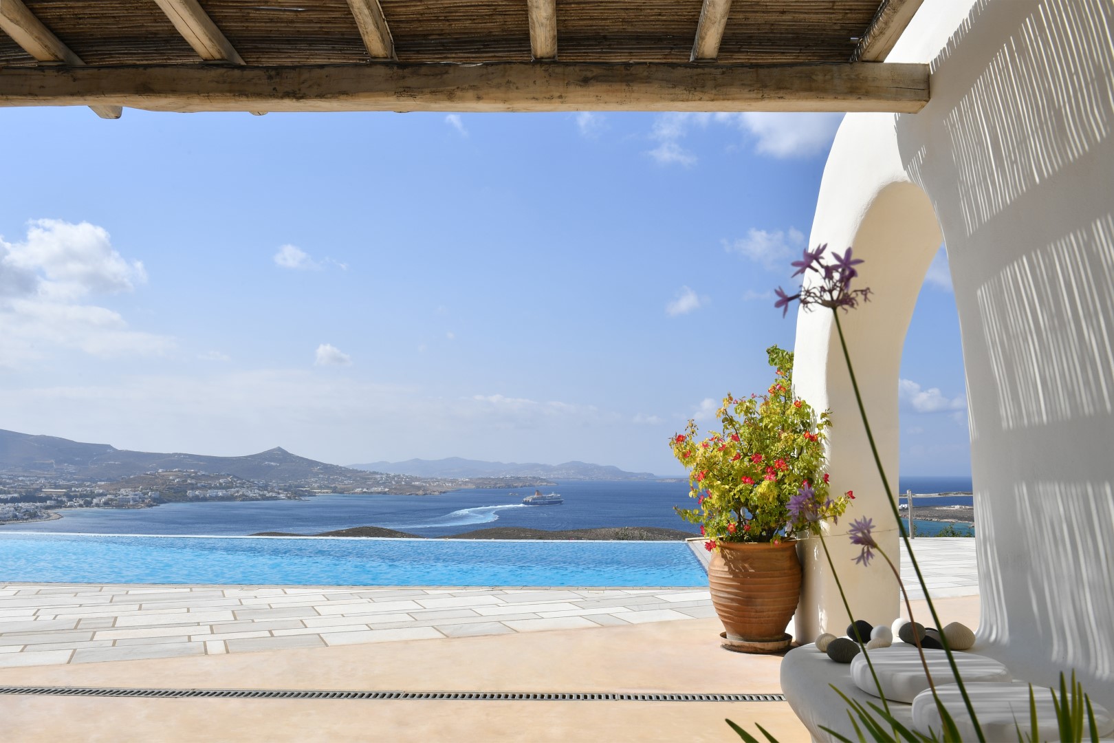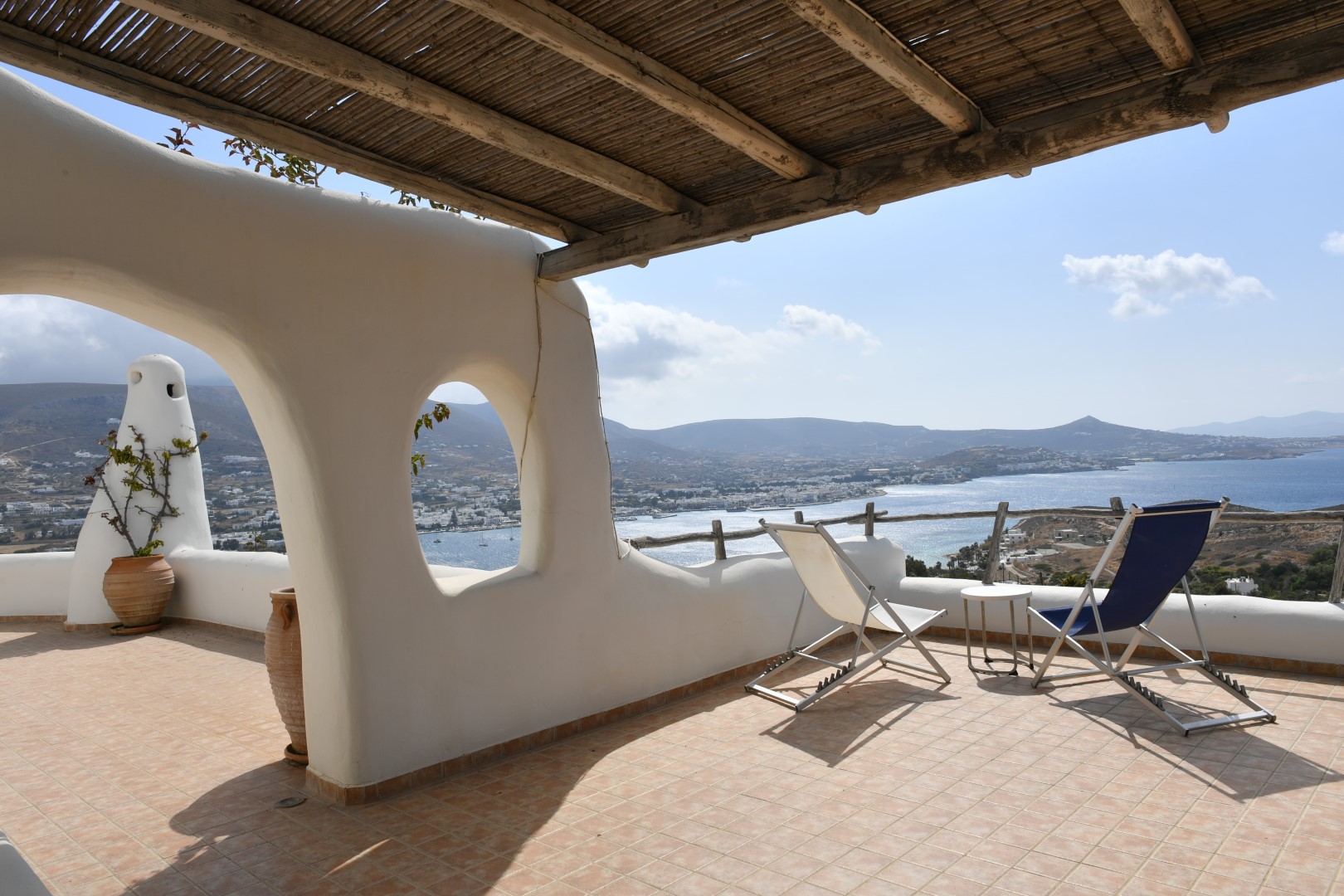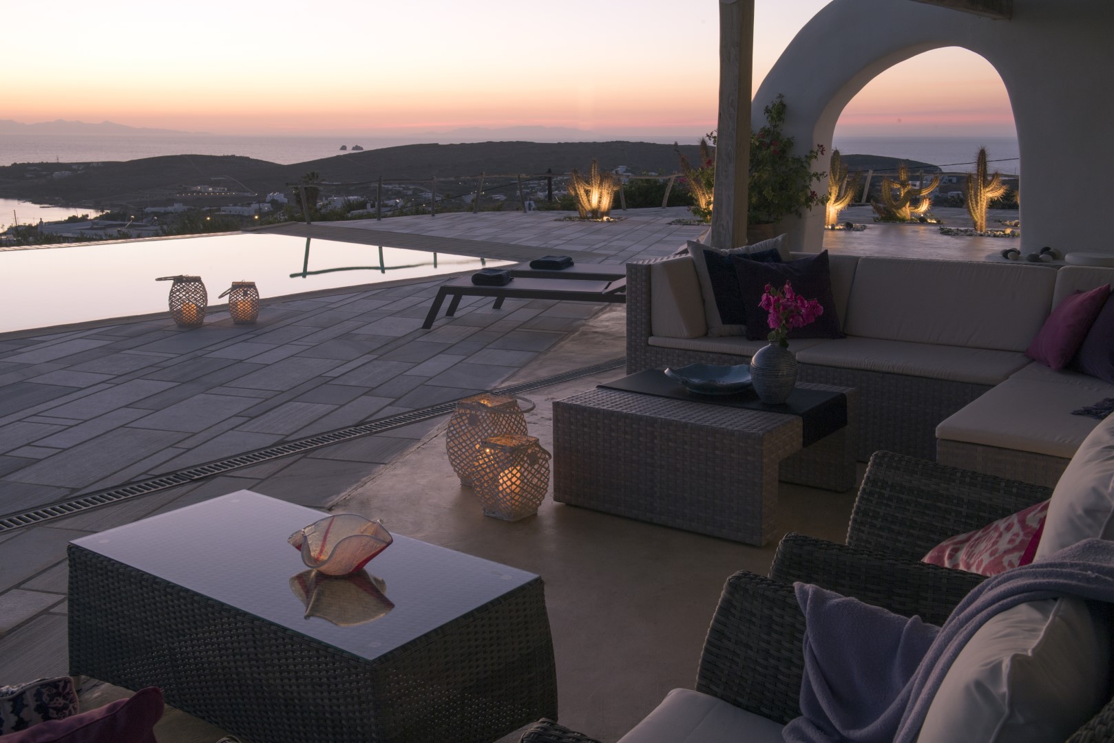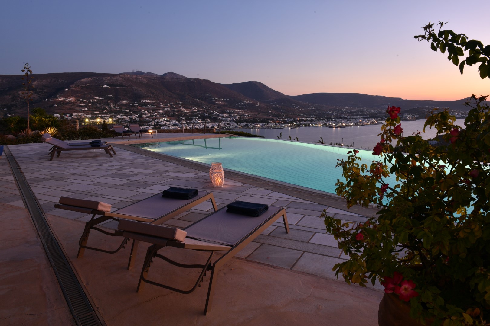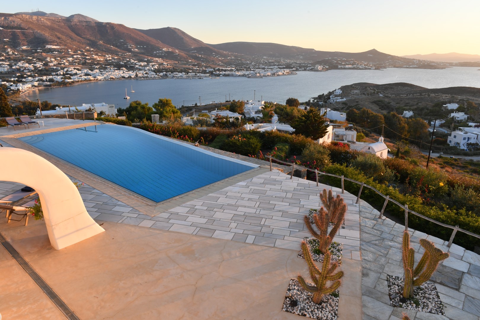 Commanding a spectacular position on Krotiri hill in Paroikia, Villa Myrsina offers an exceptional island experience featuring breathtaking 180° sea views and legendary sunsets. This impressive 410 sq.m. standalone villa sits on a unique plot just 5 minutes from Paroikia town and 2 minutes from the pristine white sands of Martselo beach, perfectly balancing privacy with convenience.