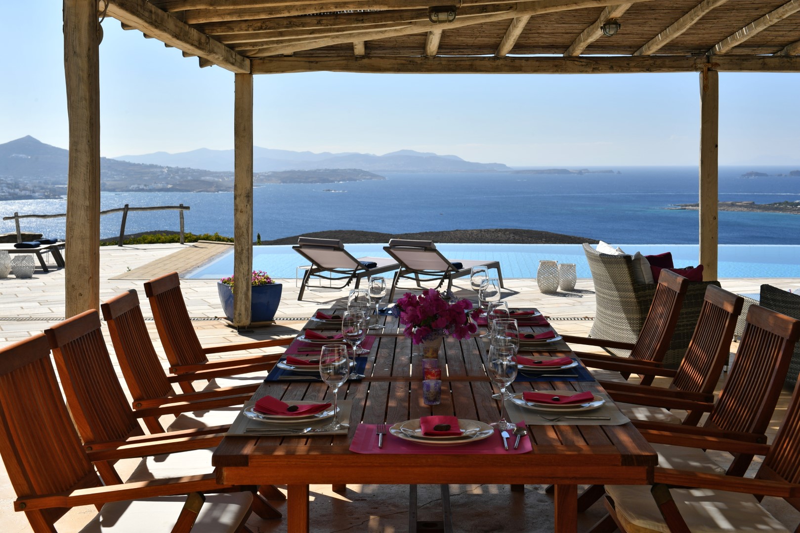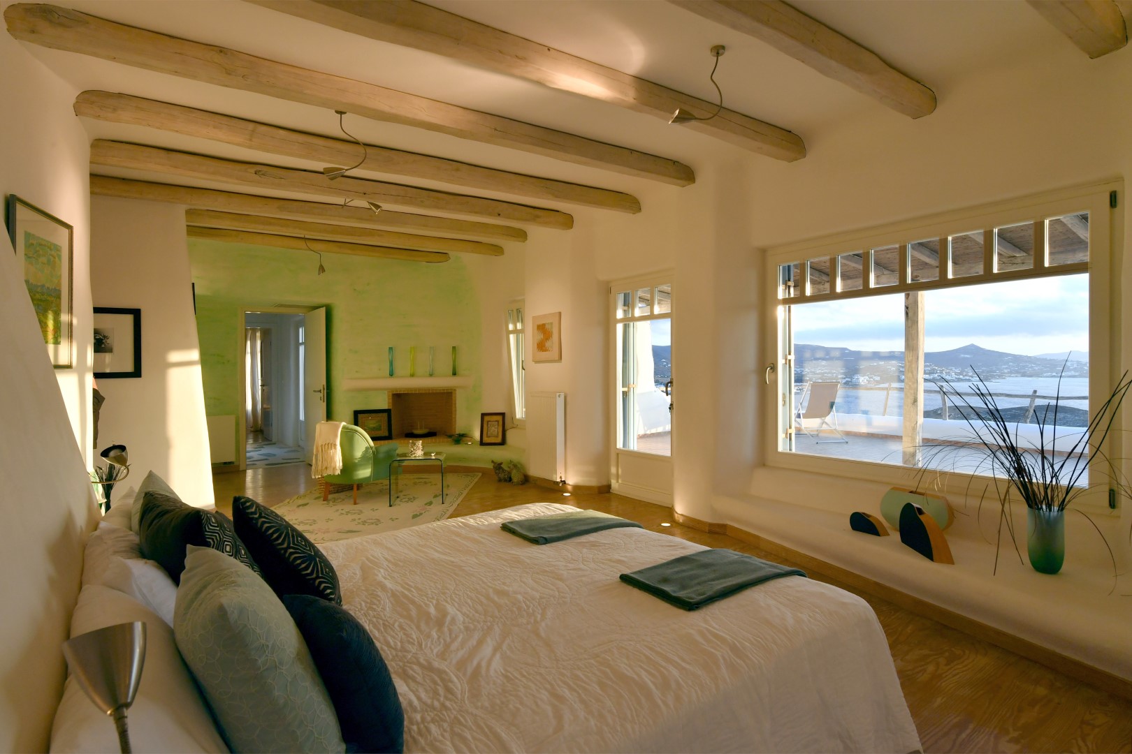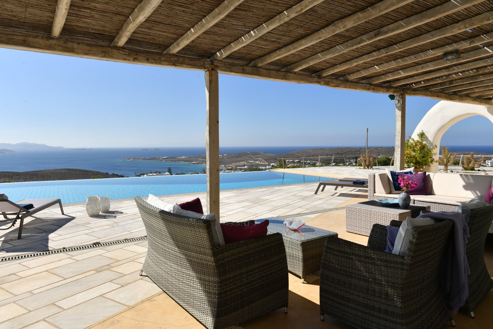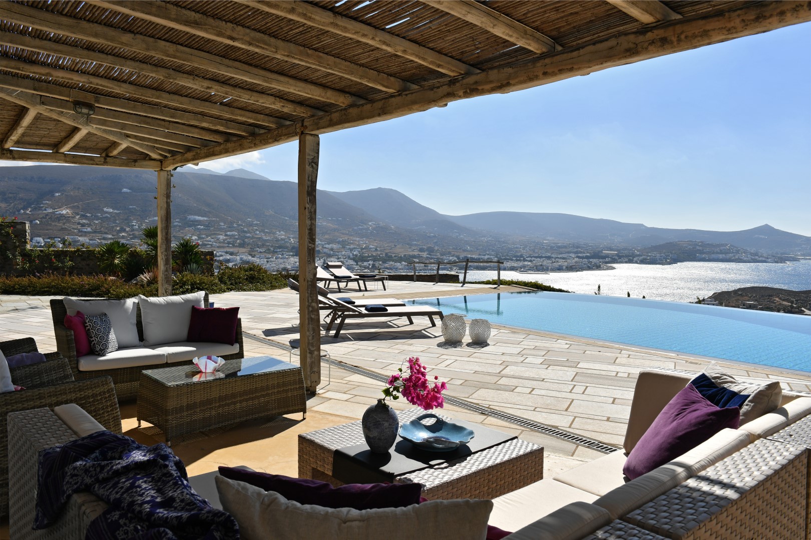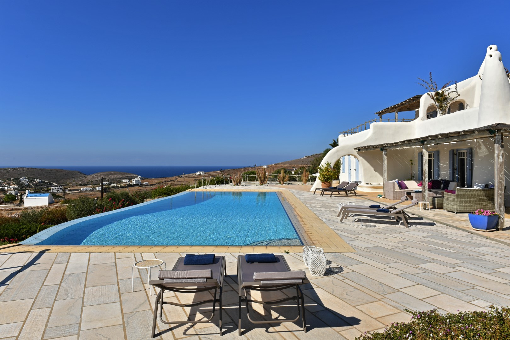 Commanding a spectacular position on Krotiri hill in Paroikia, Villa Myrsina offers an exceptional island experience featuring breathtaking 180° sea views and legendary sunsets. This impressive 410 sq.m. standalone villa sits on a unique plot just 5 minutes from Paroikia town and 2 minutes from the pristine white sands of Martselo beach, perfectly balancing privacy with convenience.