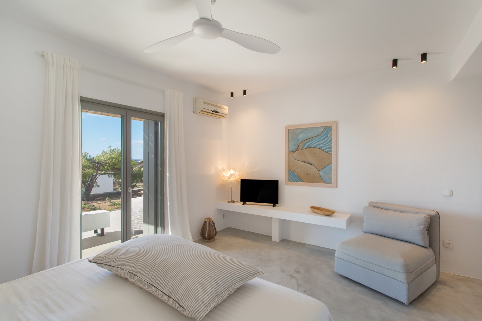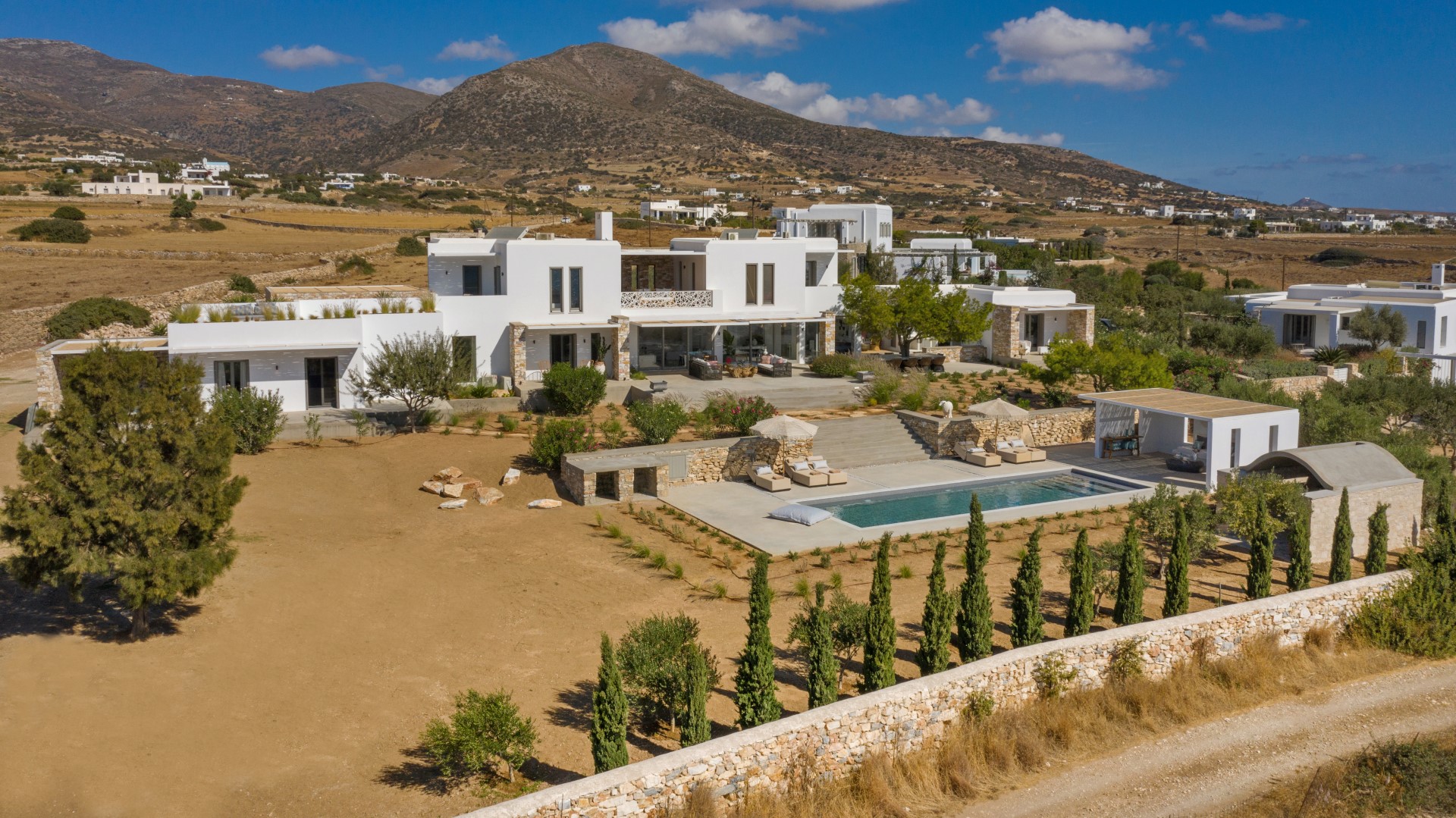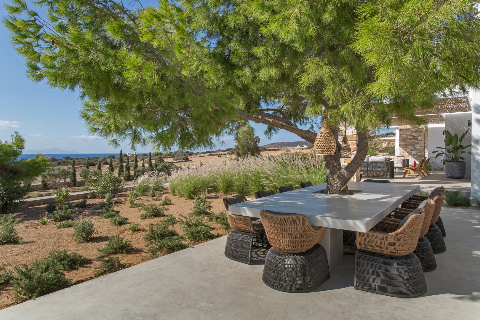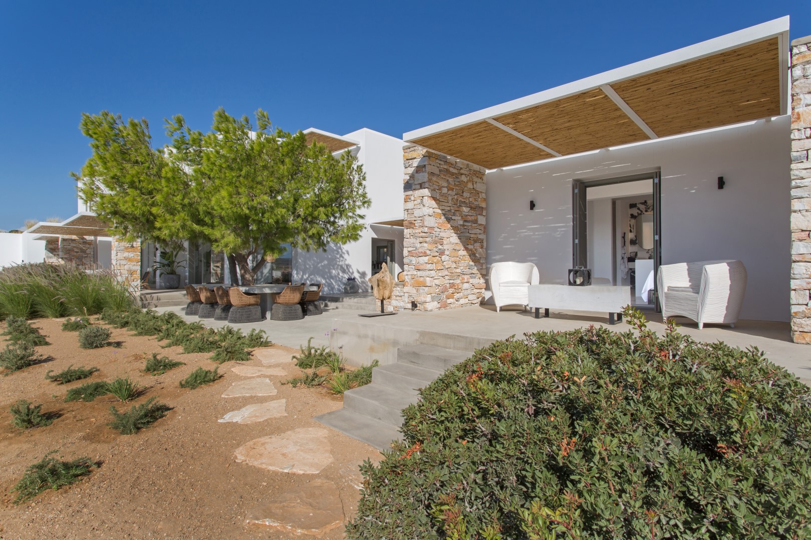 The property is enhanced with lush landscaping and comprehensive amenities including full air-conditioning, Wi-Fi, mosquito screens, safe box, fully-equipped kitchen with espresso and filter coffee machines, dishwasher, and pergola-shaded parking for multiple vehicles. Premium services include daily maid service, bi-weekly linen changes, concierge assistance, and complimentary toiletries—ensuring an unforgettable escape on the captivating island of Paros.