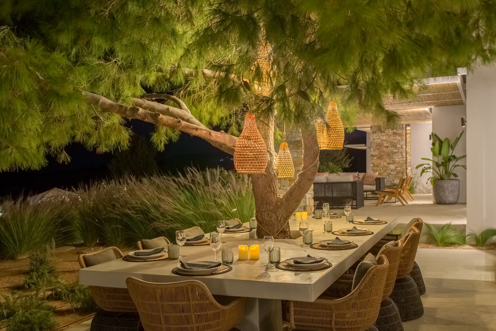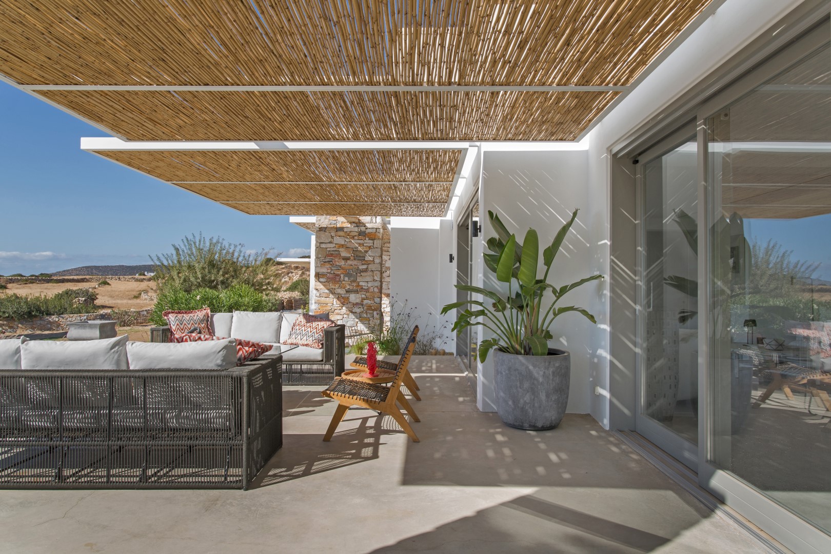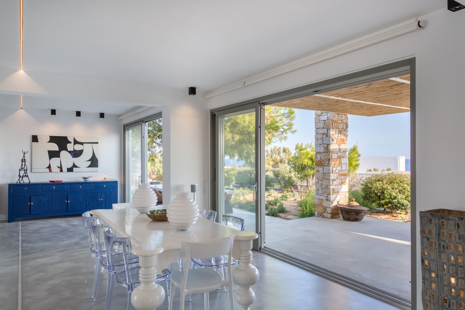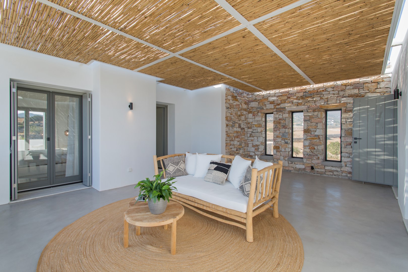 The property is enhanced with lush landscaping and comprehensive amenities including full air-conditioning, Wi-Fi, mosquito screens, safe box, fully-equipped kitchen with espresso and filter coffee machines, dishwasher, and pergola-shaded parking for multiple vehicles. Premium services include daily maid service, bi-weekly linen changes, concierge assistance, and complimentary toiletries—ensuring an unforgettable escape on the captivating island of Paros.