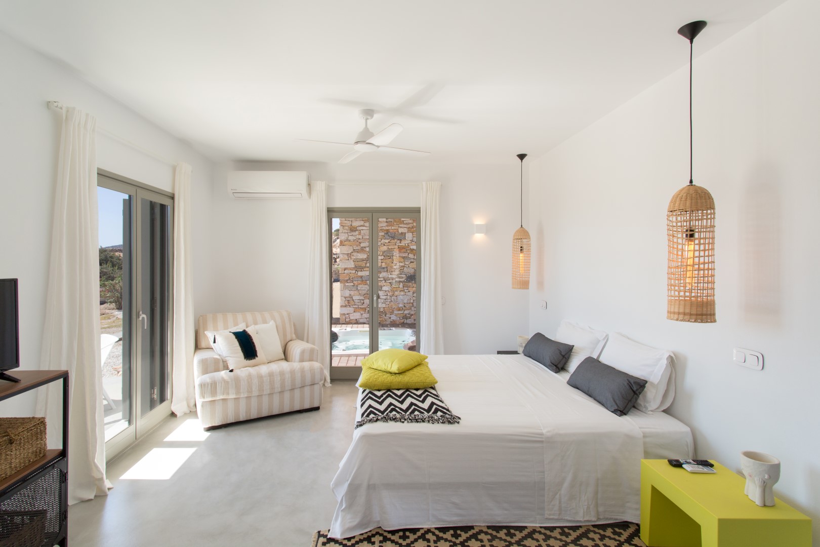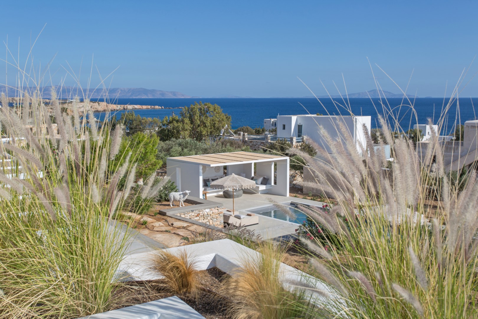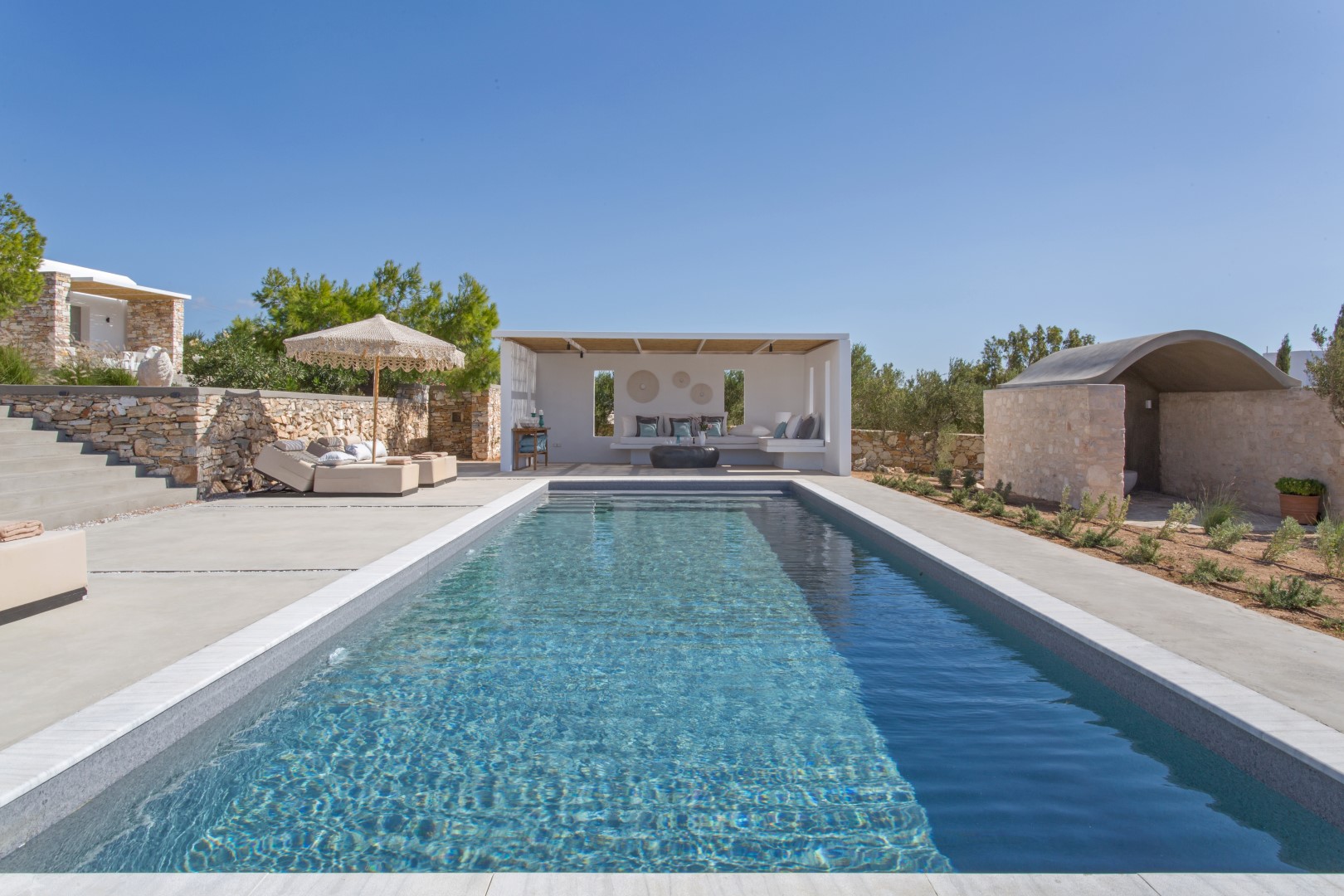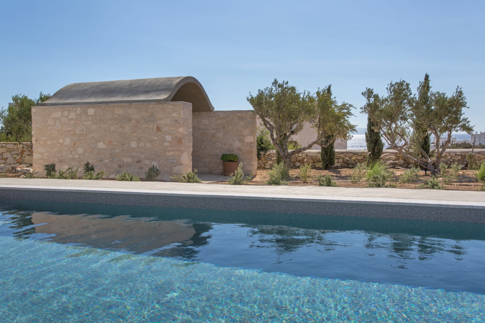 Outside, a private terrace showcases a glistening 12.5 x 4m swimming pool surrounded by chic loungers, creating the perfect setting for sun-soaked relaxation. Multiple pergola-shaded lounge areas and a built-in cement dining table under natural shade provide ideal spaces for alfresco entertaining. Adding a unique touch of cultural charm, the villa features a small chapel with architecture inspired by the island’s heritage.