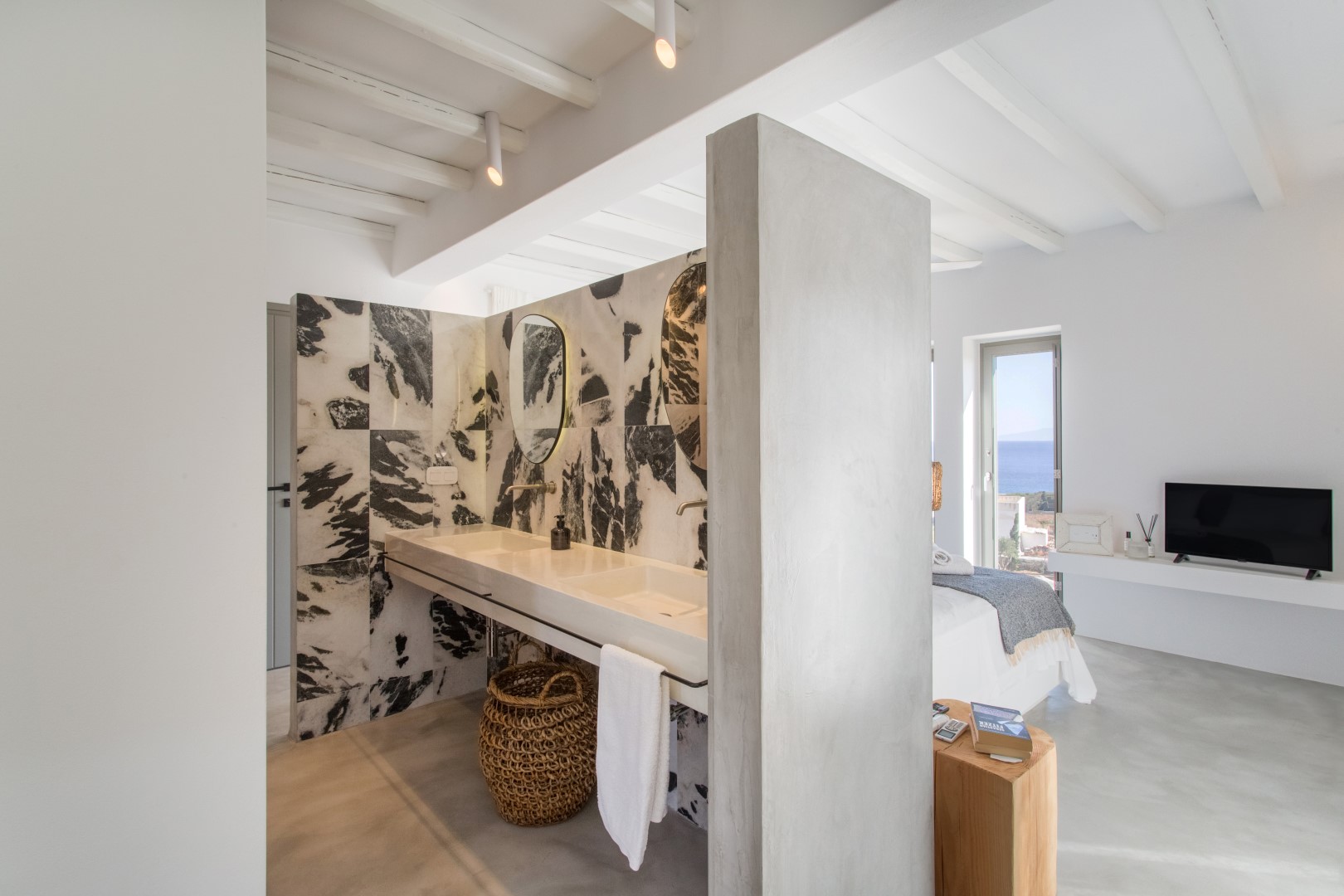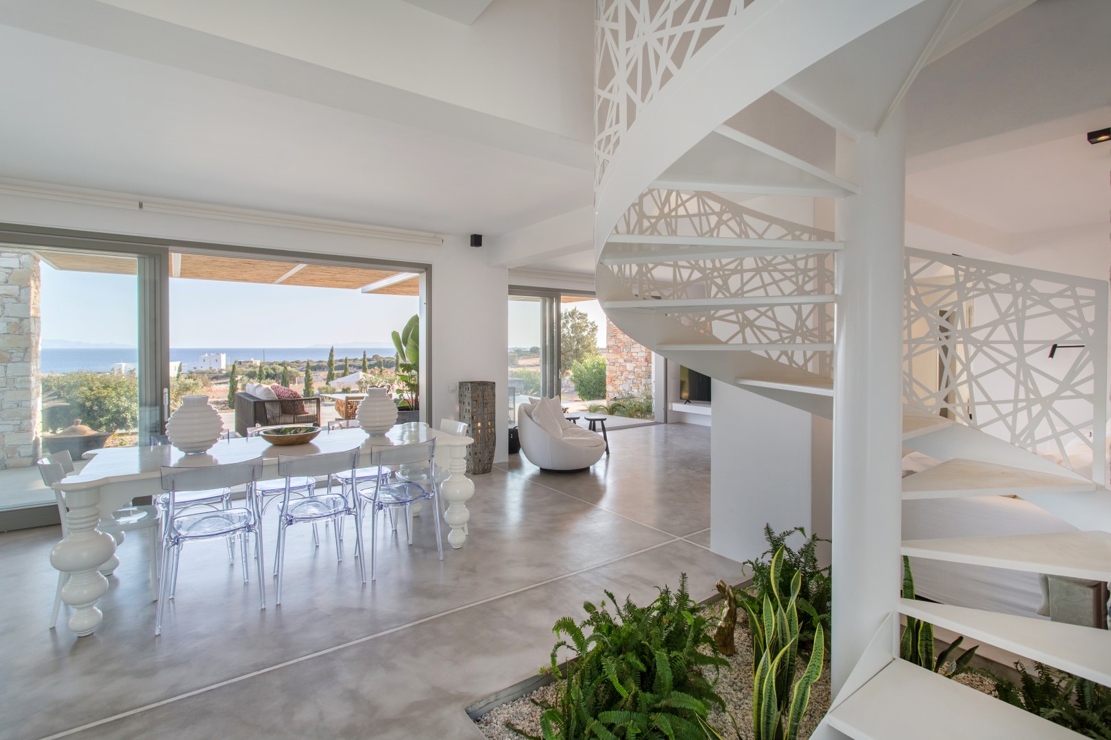 The ground level features a bright, shiny living room with dining area and open-plan kitchen, complemented by three double bedrooms with en-suite bathrooms and direct access to outdoor spaces—one notably providing exclusive access to a pergola-shaded jacuzzi. The upper level, accessed via a distinctive circled staircase, houses two independent en-suite double bedrooms sharing a spacious terrace with magnificent Aegean views.