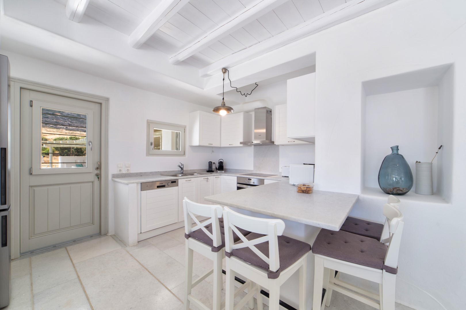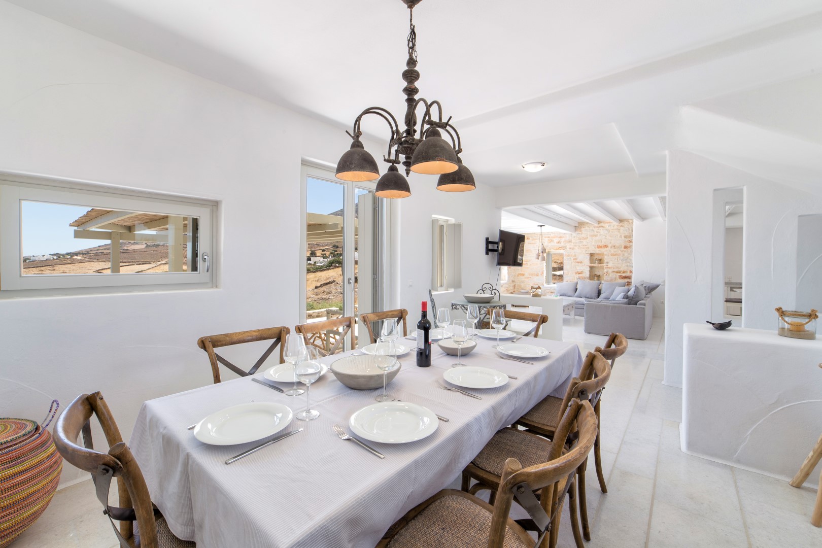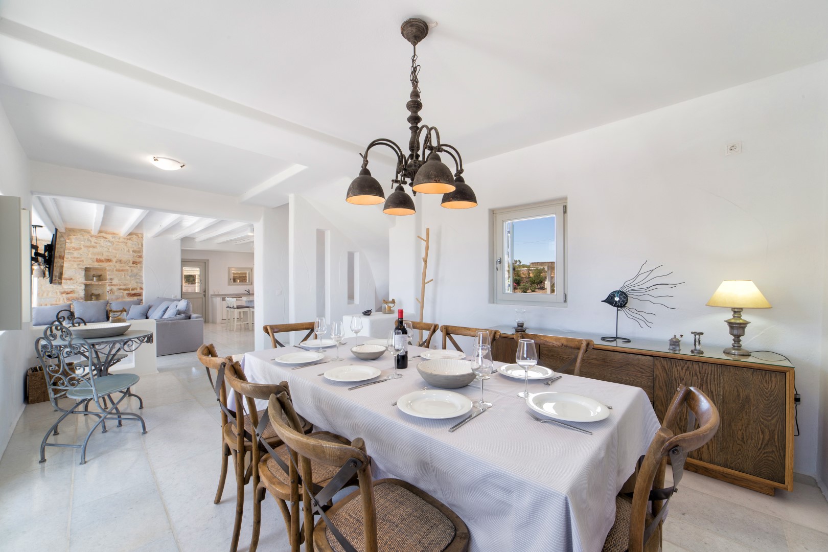 Inside, cool marble floors and clean lines embody quintessential Cycladic elegance, while thoughtful design ensures each space feels both luxurious and welcoming. The ground floor reveals a bright, expansive living area centered around an inviting sofa—the perfect gathering spot after sun-drenched days. Adjacent, the dining area and fully-equipped kitchen provide everything needed for memorable meals, whether prepared by you or a private chef.
