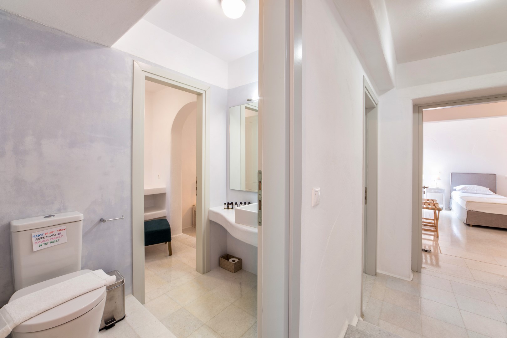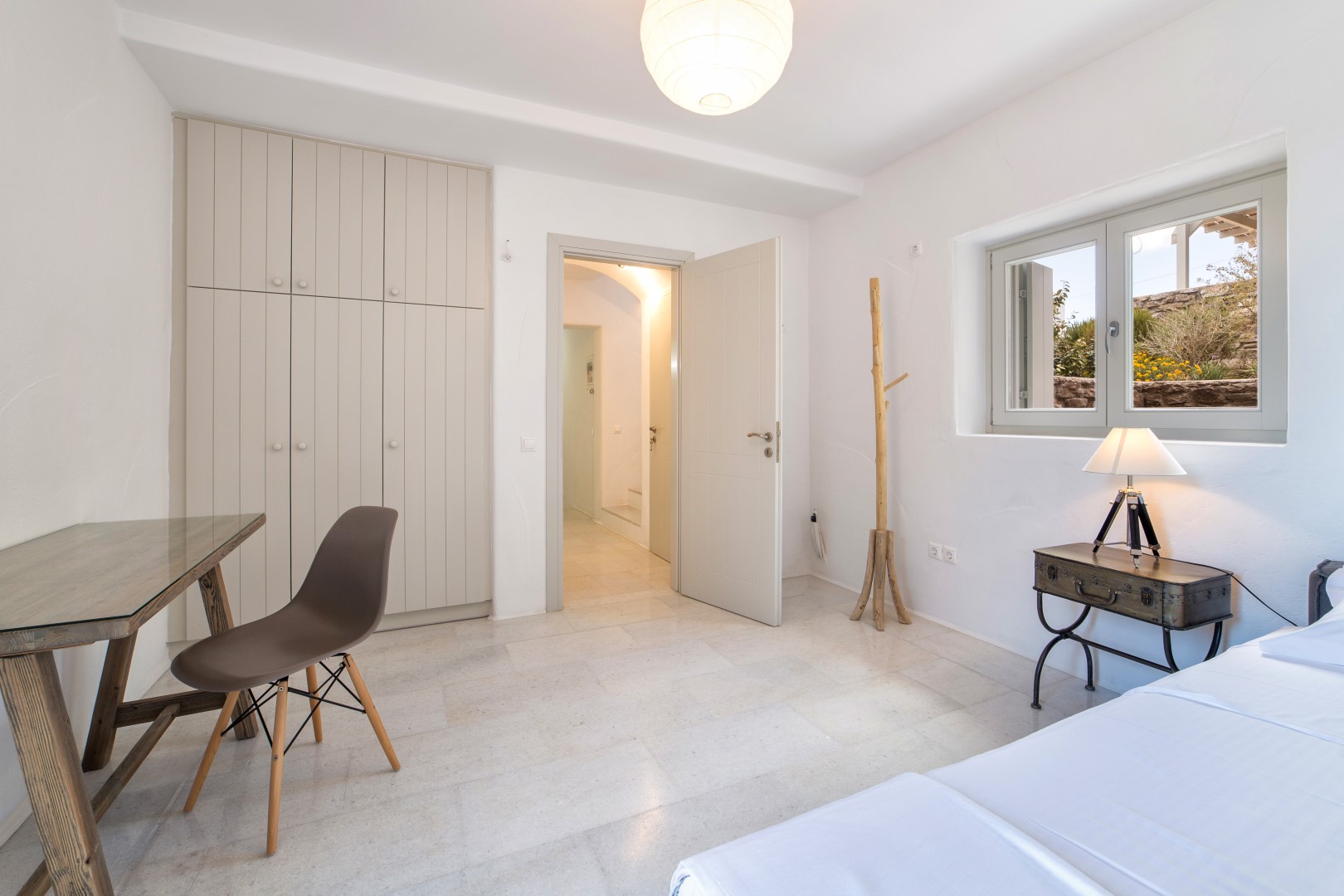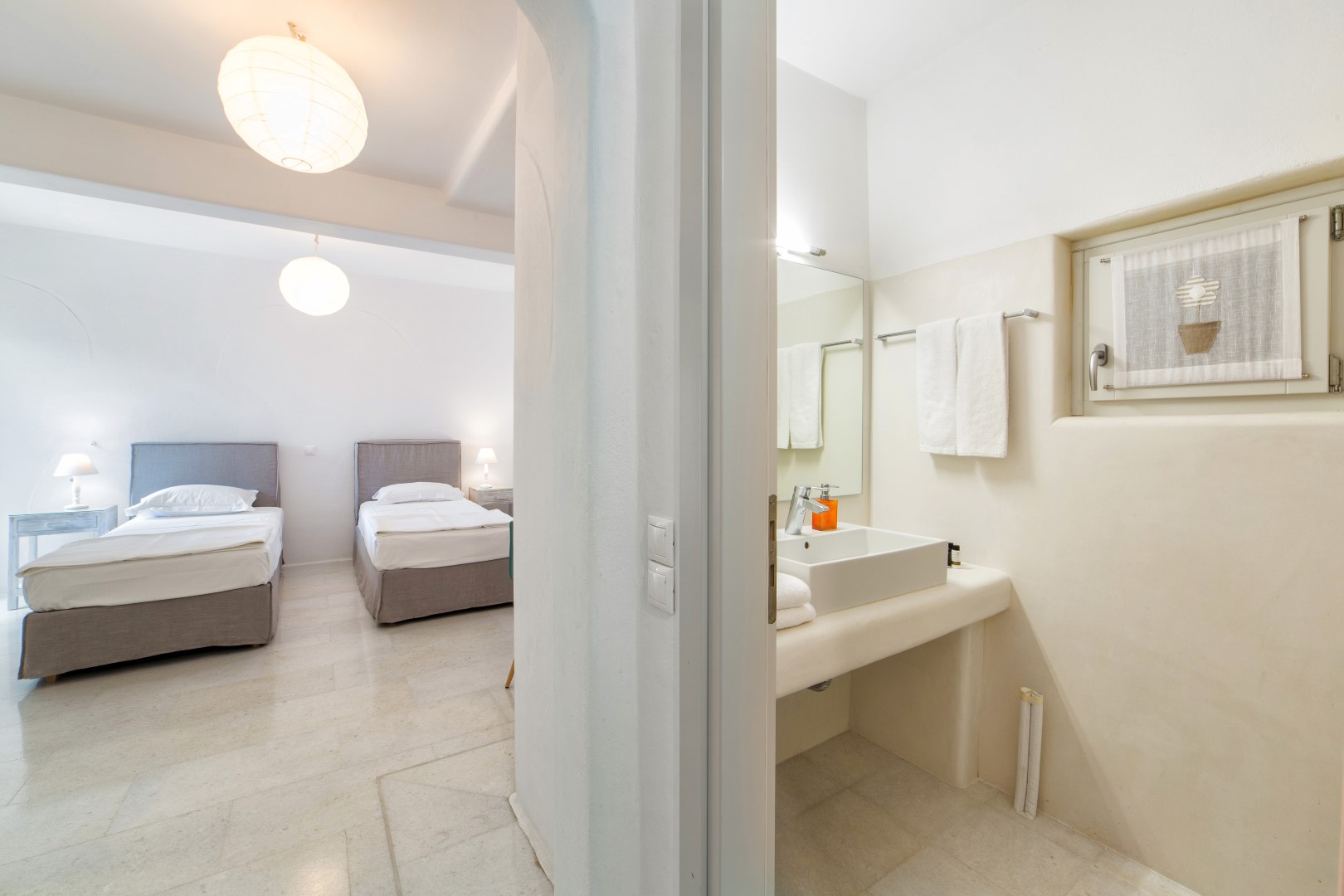 Inside, cool marble floors and clean lines embody quintessential Cycladic elegance, while thoughtful design ensures each space feels both luxurious and welcoming. The ground floor reveals a bright, expansive living area centered around an inviting sofa—the perfect gathering spot after sun-drenched days. Adjacent, the dining area and fully-equipped kitchen provide everything needed for memorable meals, whether prepared by you or a private chef.